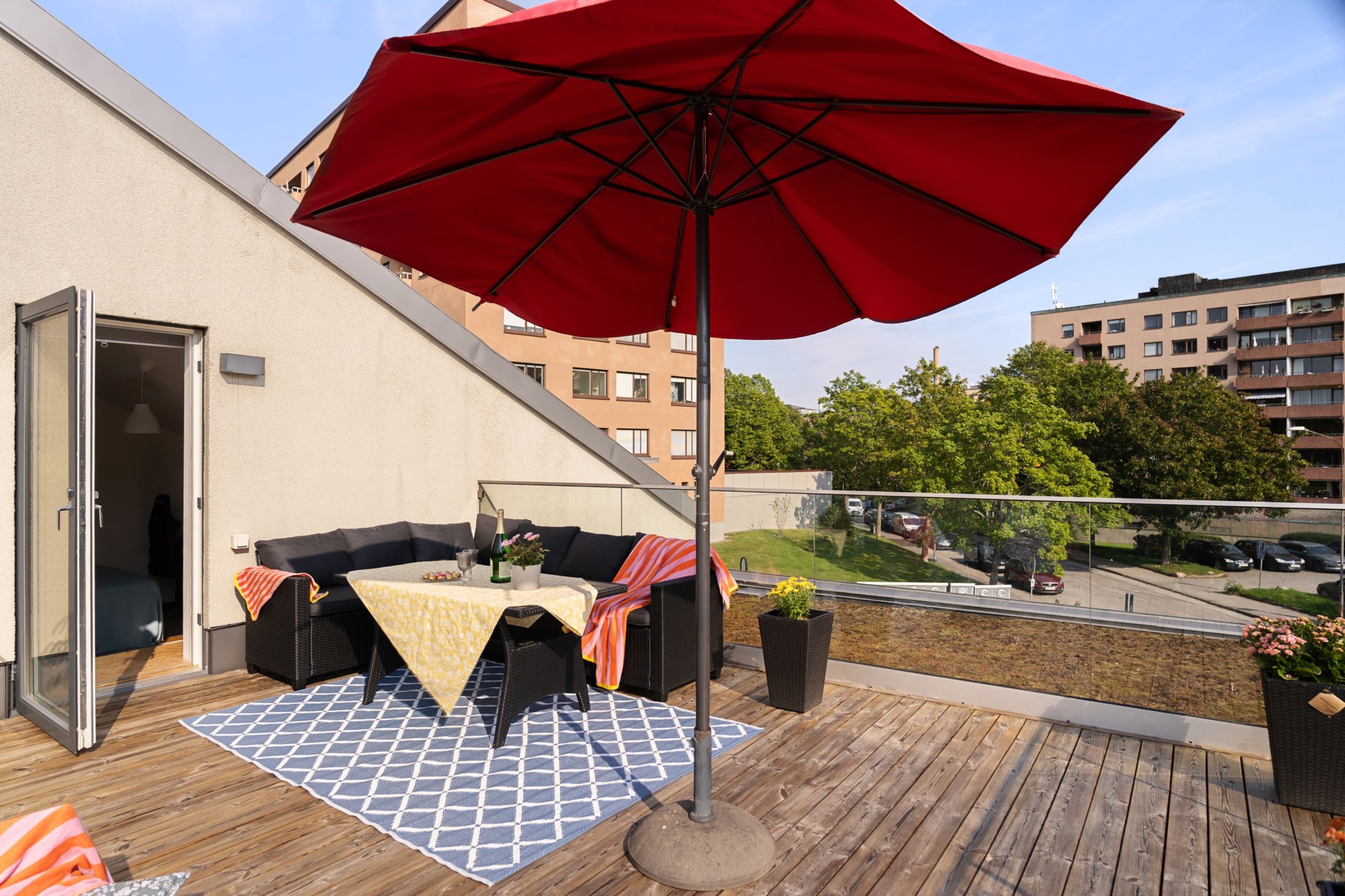Det stilrena köket har blåa luckor, mörk stenbänkskiva och full maskinell utrustning bjuder på plats för både matlagning och större sällskap, med direkt utgång till en rymlig balkong. Vardagsrummet är ljust och luftigt med fönster i två väderstreck, vilket ger en härlig rymd. Sovrummen är flexibla och erbjuder god förvaring samt möjlighet till både sovrum, gästrum eller hemmakontor. Från ett av sovrummen når du bostadens magiska terrassen, som erbjuder generöst med plats för större loungemöbler och härliga utomhusstunder. Det fräscha badrummet har både badkar och en smart tvätthörna med tvättmaskin, torktumlare och golvvärme, en perfekt kombination av funktion och komfort.