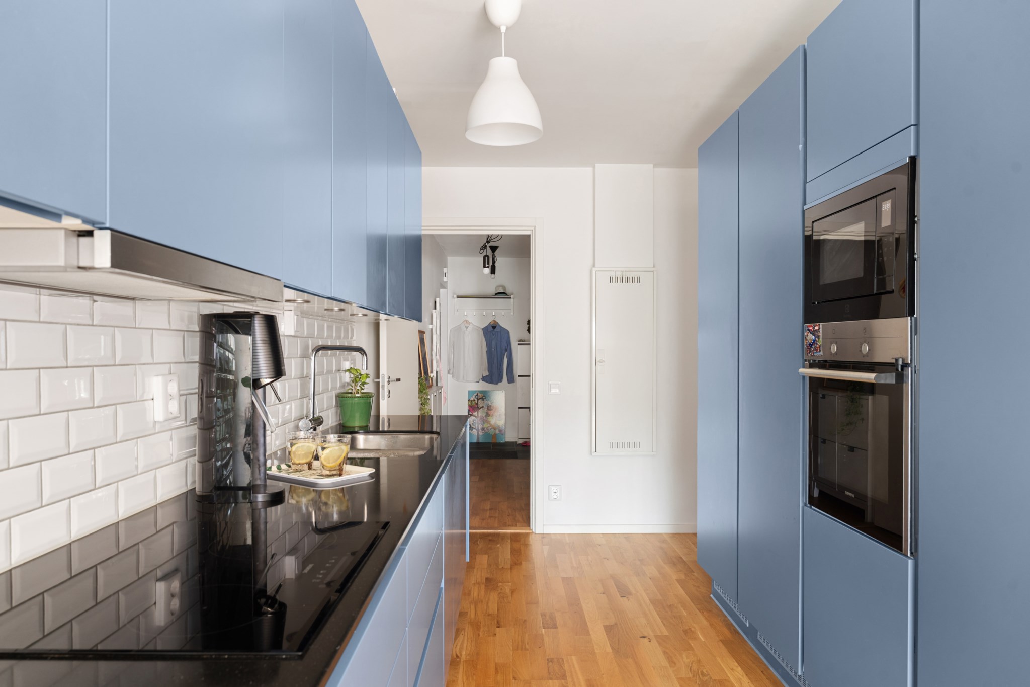 Modernt och smakfullt kök med blåa köksluckor, mörk bänkskiva i sten och vitt kakel som stänkskydd. Den maskinella utrustningen består av spishäll, ugn, fläkt, mikrovågsugn, integrerad diskmaskin samt fullstor kyl och frys. Gott om förvaringsmöjligheter erbjuds i både under- och överskåp. Här finns även plats för en större matgrupp, perfekt för både vardagsmiddagar och sociala tillställningar. Från köket når du dessutom bostadens härliga balkong.