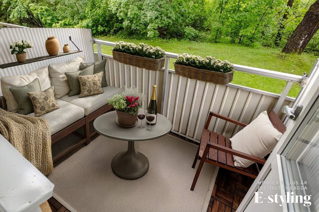 Till lägenheten hör en balkong. Den rymlig balkongen har gott om utrymme för bekväma balkongmöbler och bjuder på en lummig miljö i lugnt läge.