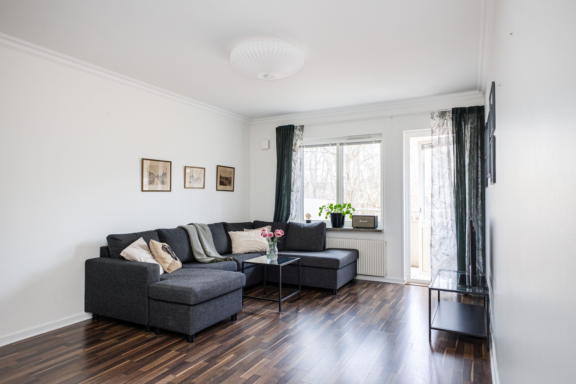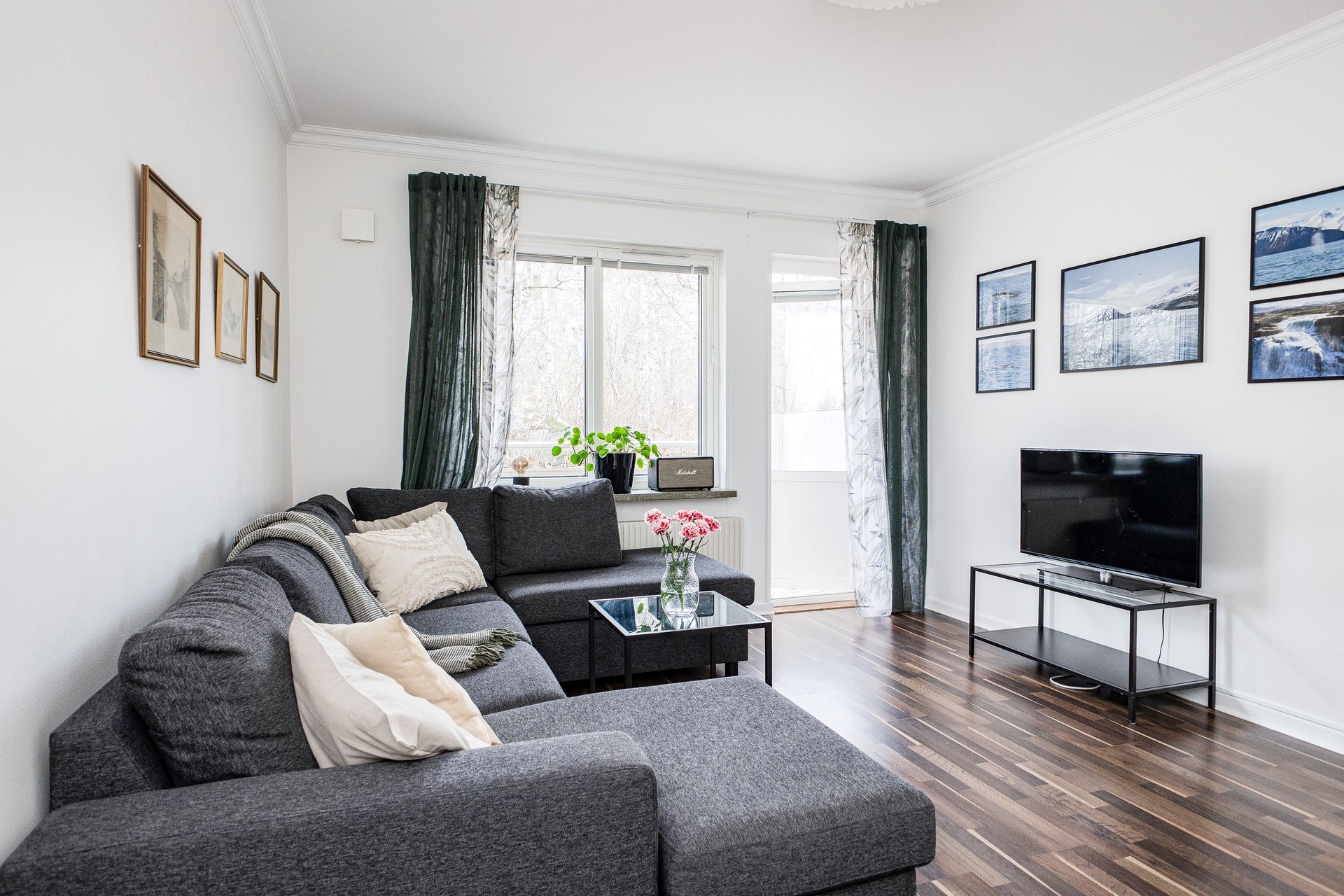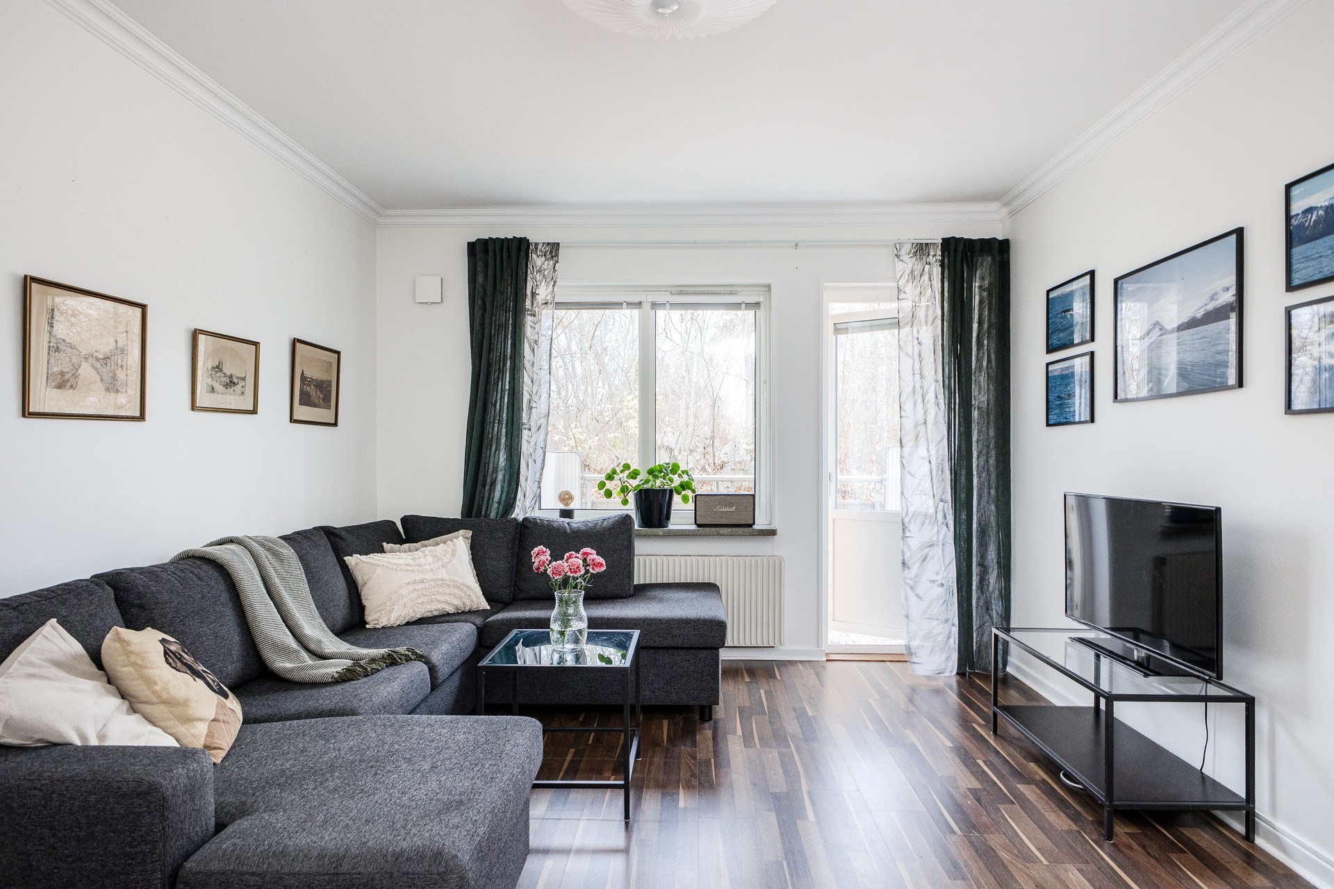 Den öppna och ljusa atmosfären märks direkt när du kliver in. Vardagsrummet har plats för både stor soffgrupp och skrivbord, och härifrån nås den härliga balkongen som vetter mot lummig grönska – en perfekt plats för morgonkaffet eller en lugn stund i kvällssolen. Köket erbjuder gott om förvaring och arbetsyta för den som gillar att laga mat, och sovrummet erbjuder gott om plats till stor säng och förvaring genom skjutdörrsgarderob.