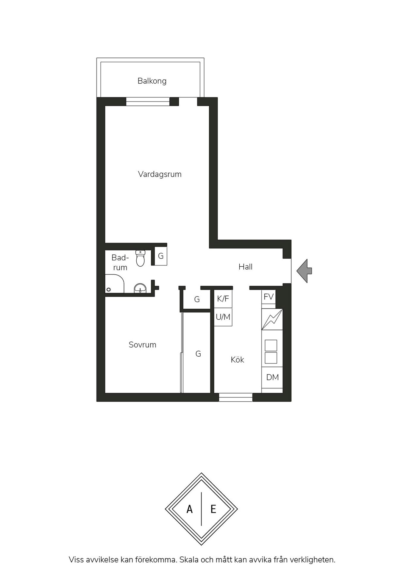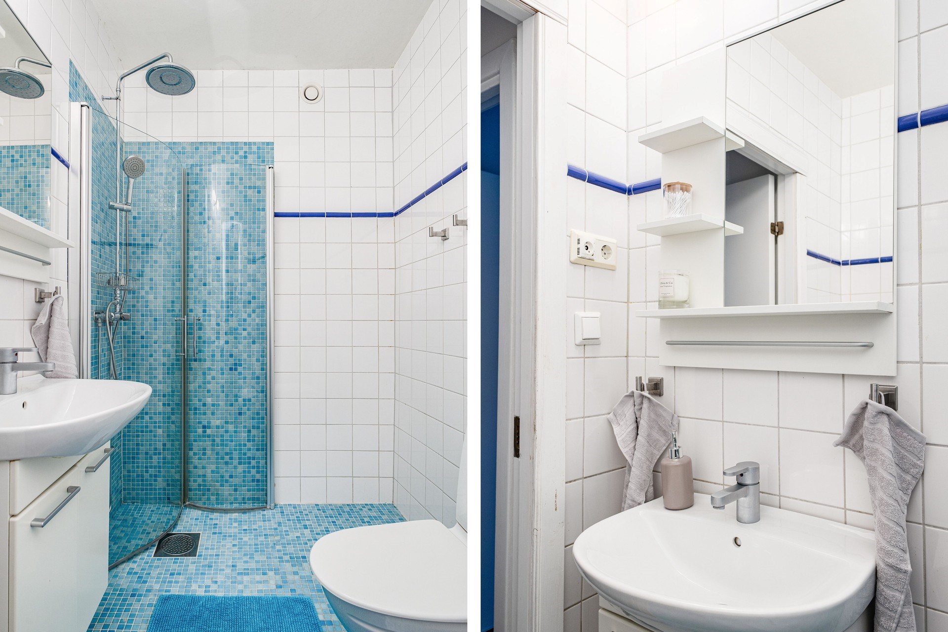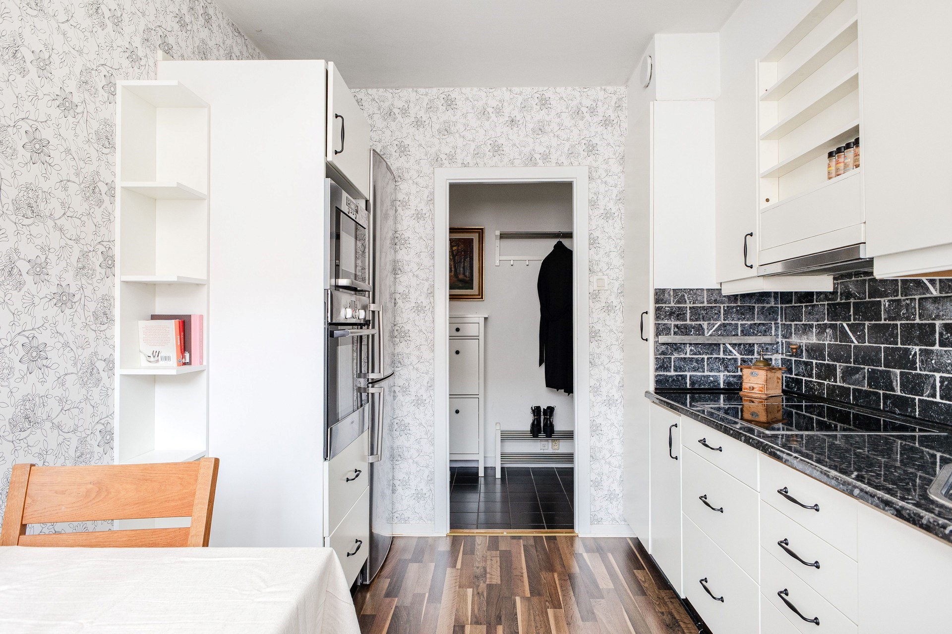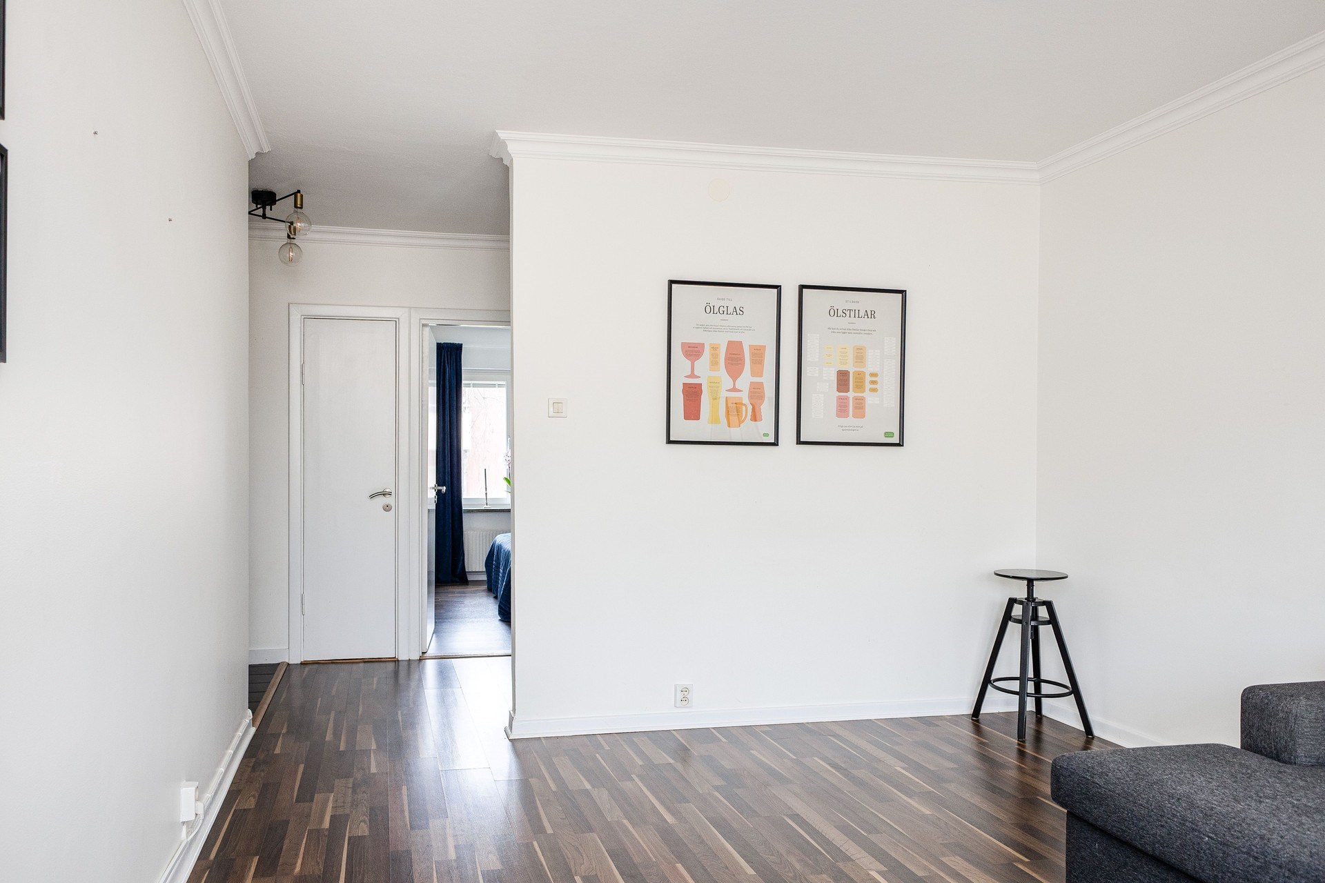Den öppna och ljusa atmosfären märks direkt när du kliver in. Vardagsrummet har plats för både stor soffgrupp och skrivbord, och härifrån nås den härliga balkongen som vetter mot lummig grönska – en perfekt plats för morgonkaffet eller en lugn stund i kvällssolen. Köket erbjuder gott om förvaring och arbetsyta för den som gillar att laga mat, och sovrummet erbjuder gott om plats till stor säng och förvaring genom skjutdörrsgarderob.