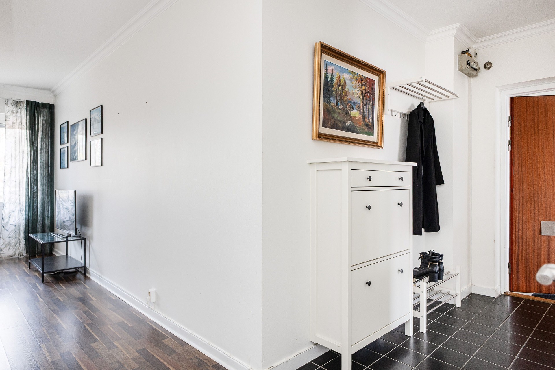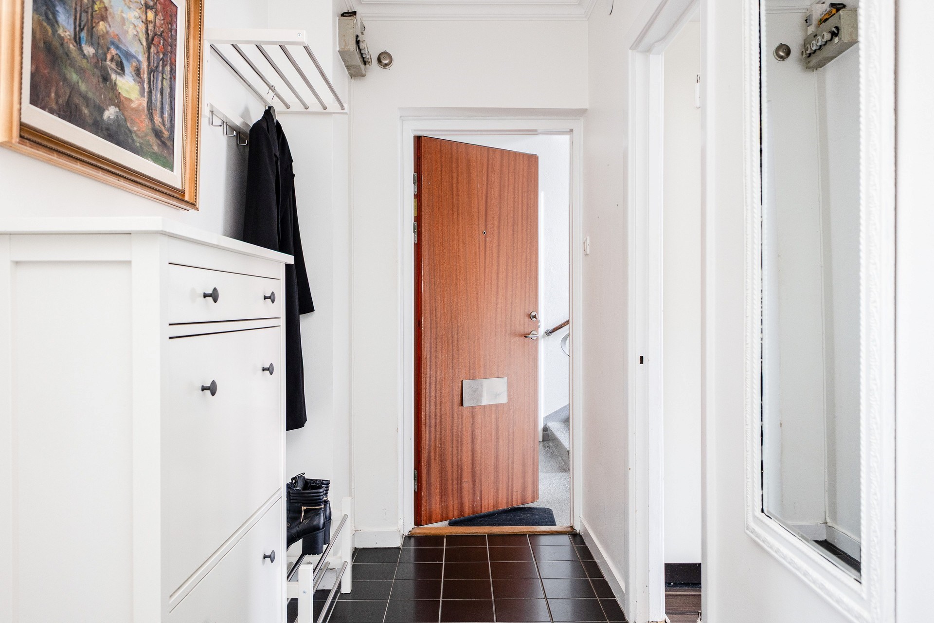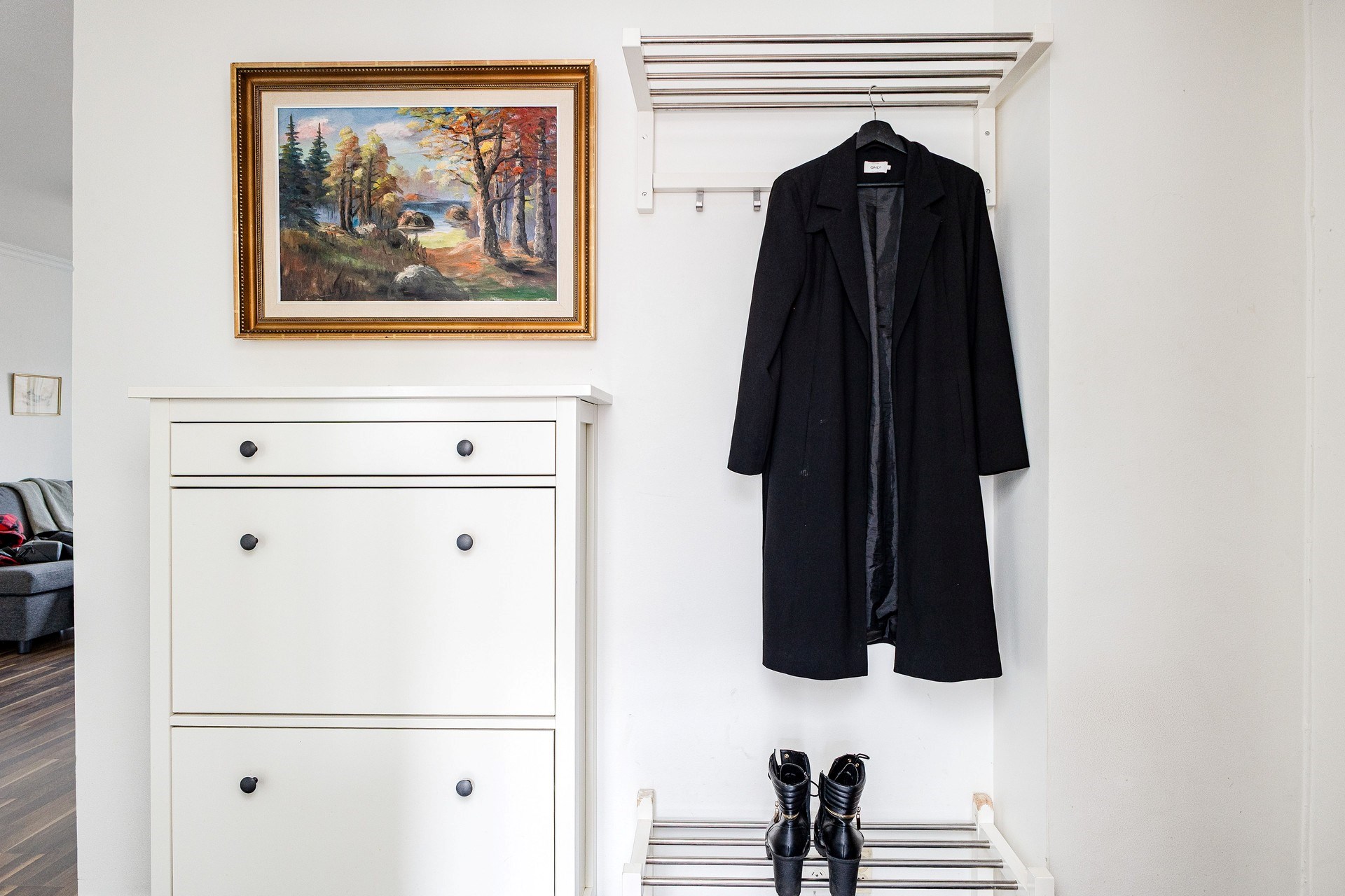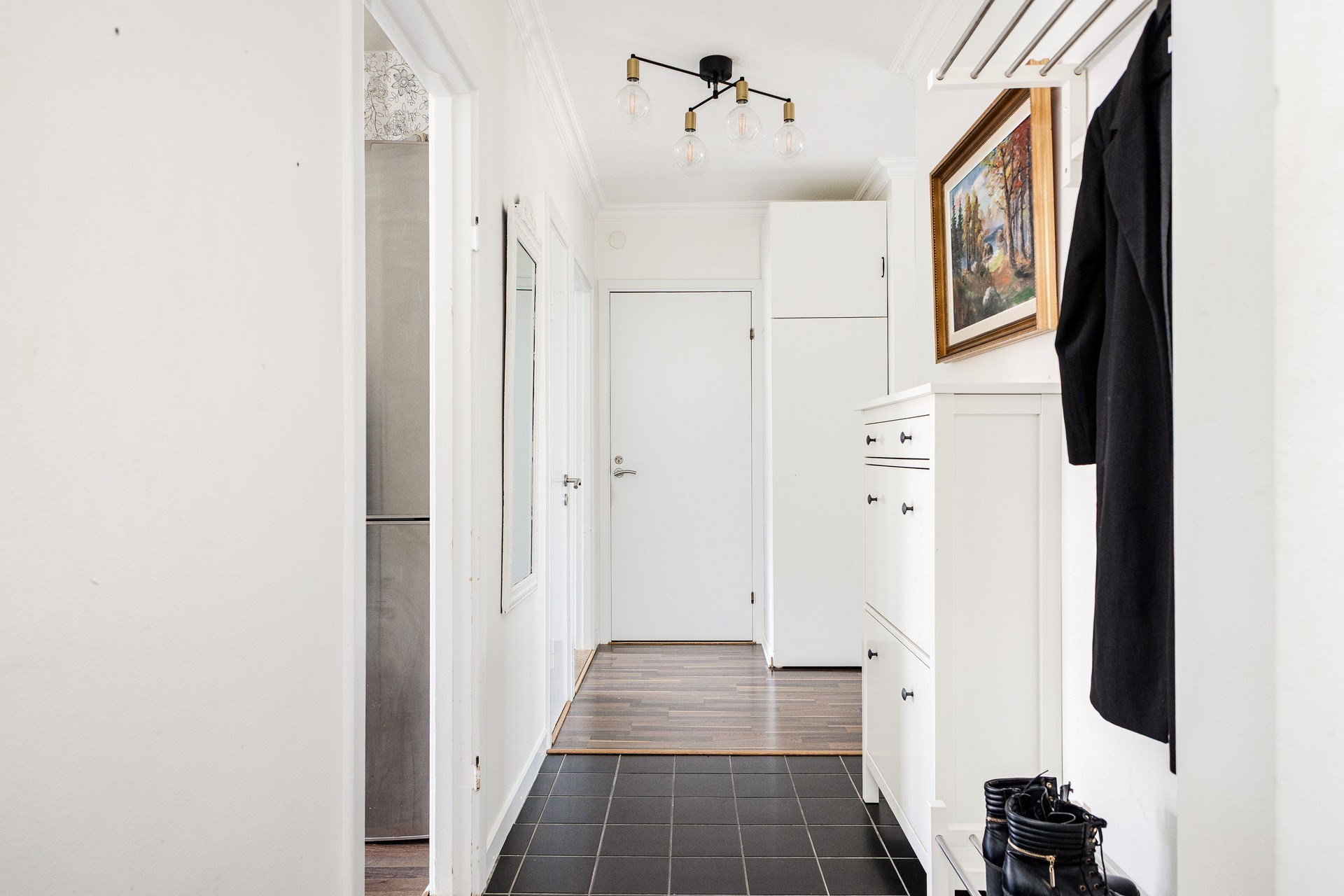 Välkomnande hall med ljust målade väggar och mörkt golv. Hallen erbjuder praktiska avhängningsmöjligheter för ytterkläder och skor precis intill ytterdörren.