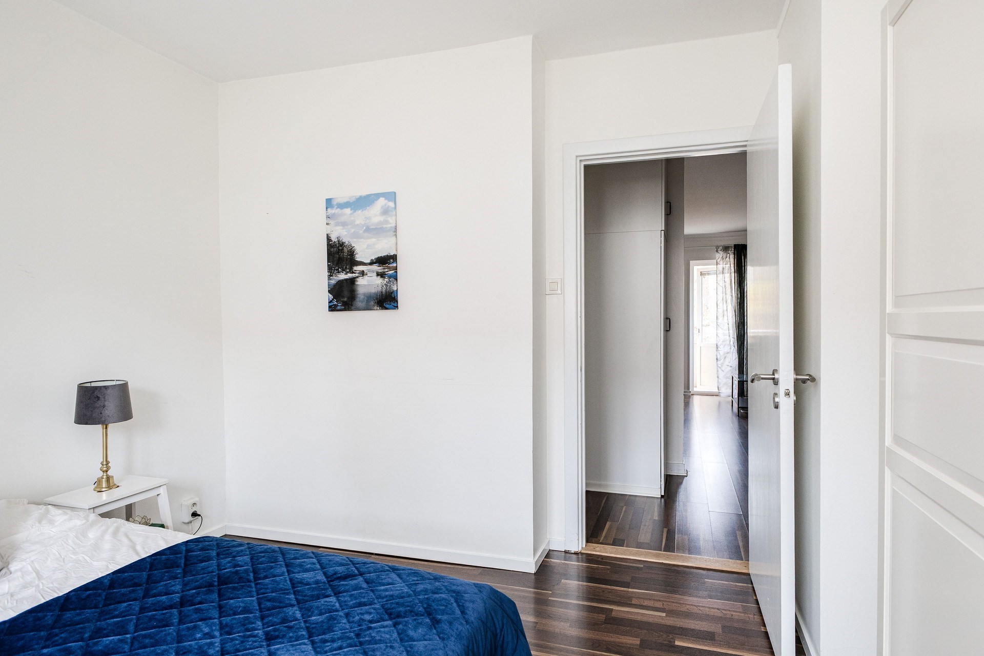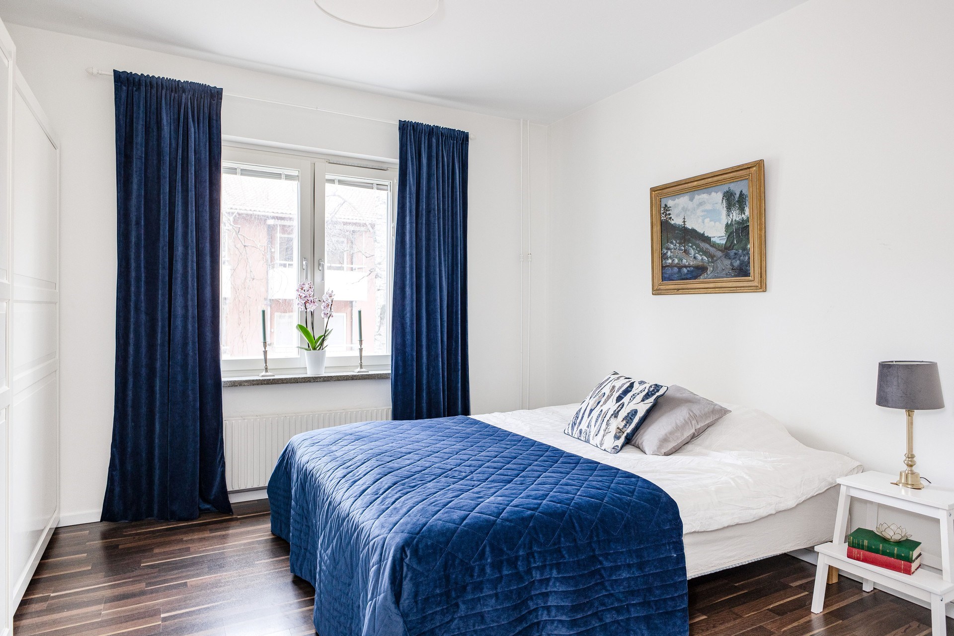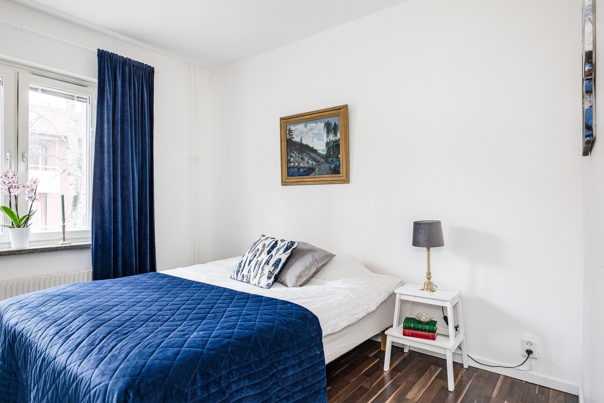 Mysigt och rogivande sovrum med mörkt golv och tapetserade väggar. Plats till dubbelsäng och sängbord. Förvaring via stor skjutdörrsgarderob. Fönster som släpper in rikligt med naturligt ljus och utan insyn.