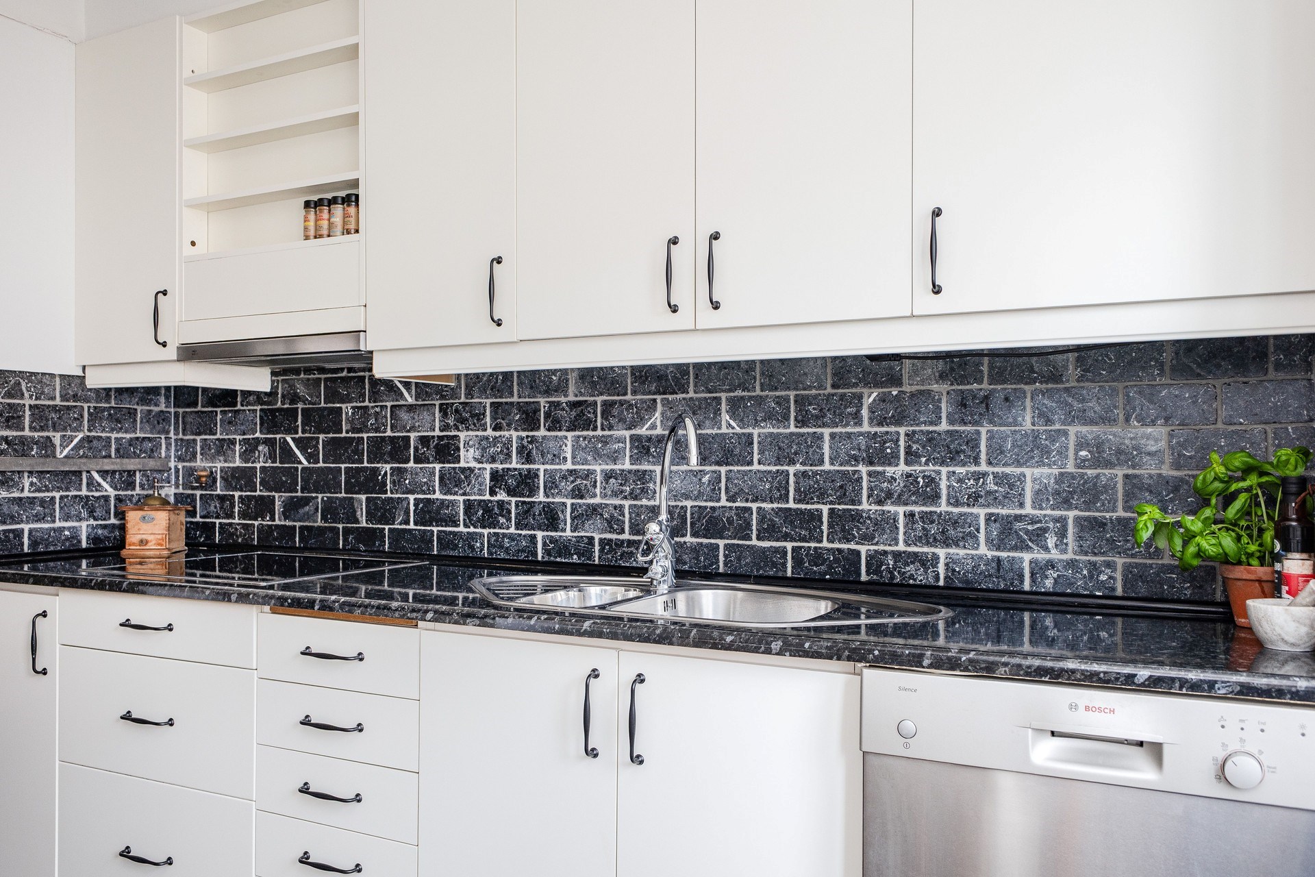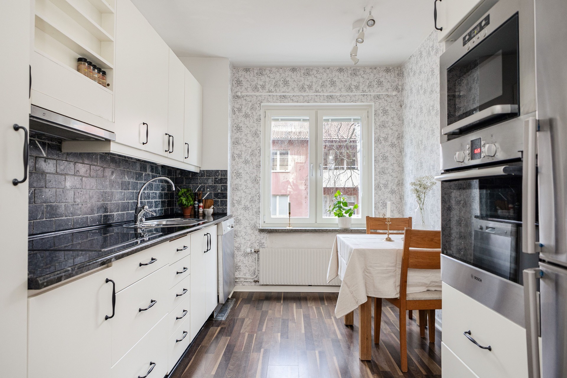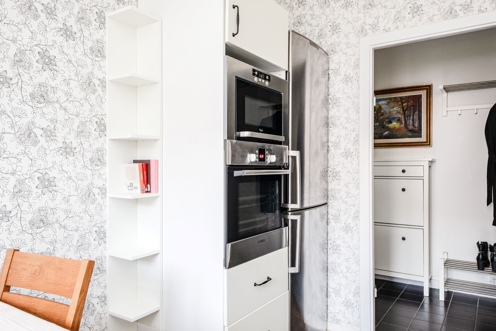Inbjudande kök med matplats för ca 2-3 personer. Köksskåpen har stilrena vita köksluckor och gott om arbetsyta. Den maskinella utrustningen består av kyl/frys, spis, ugn, micro, fläkt och diskmaskin. Tapetserade väggar och mörkt golv.