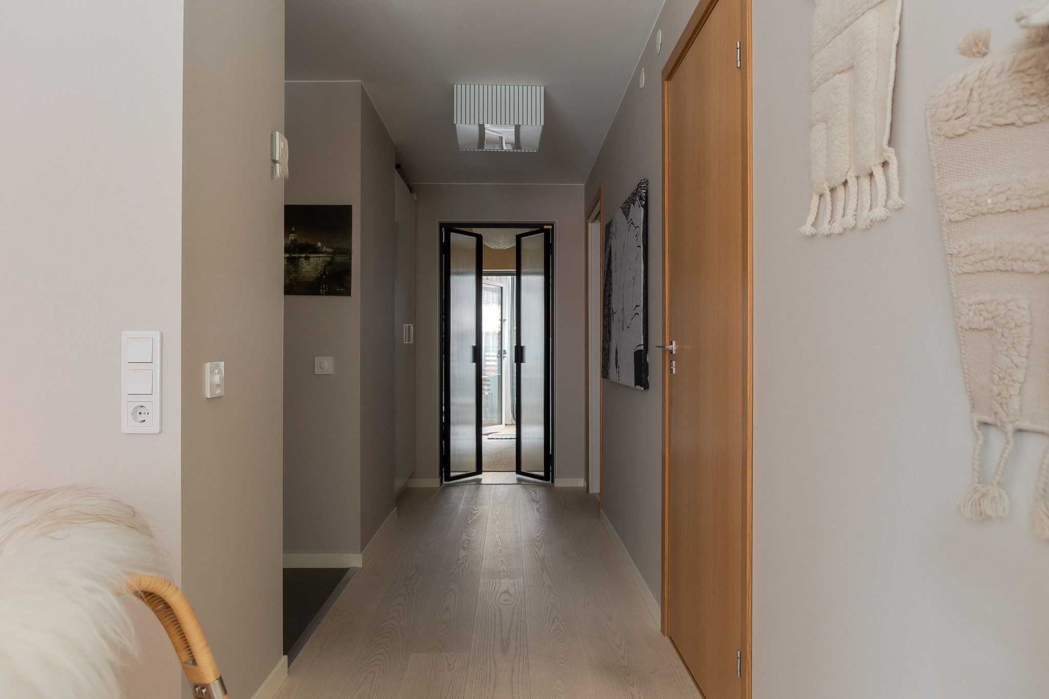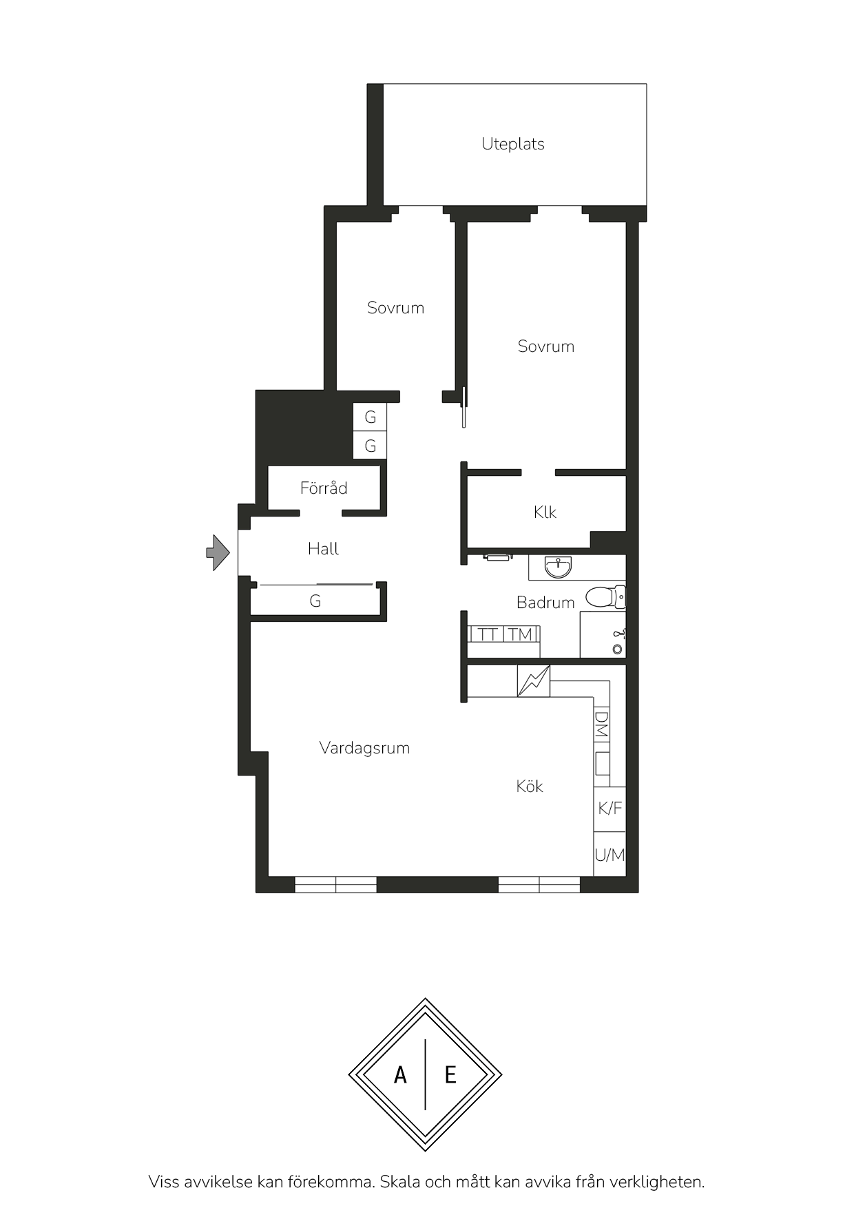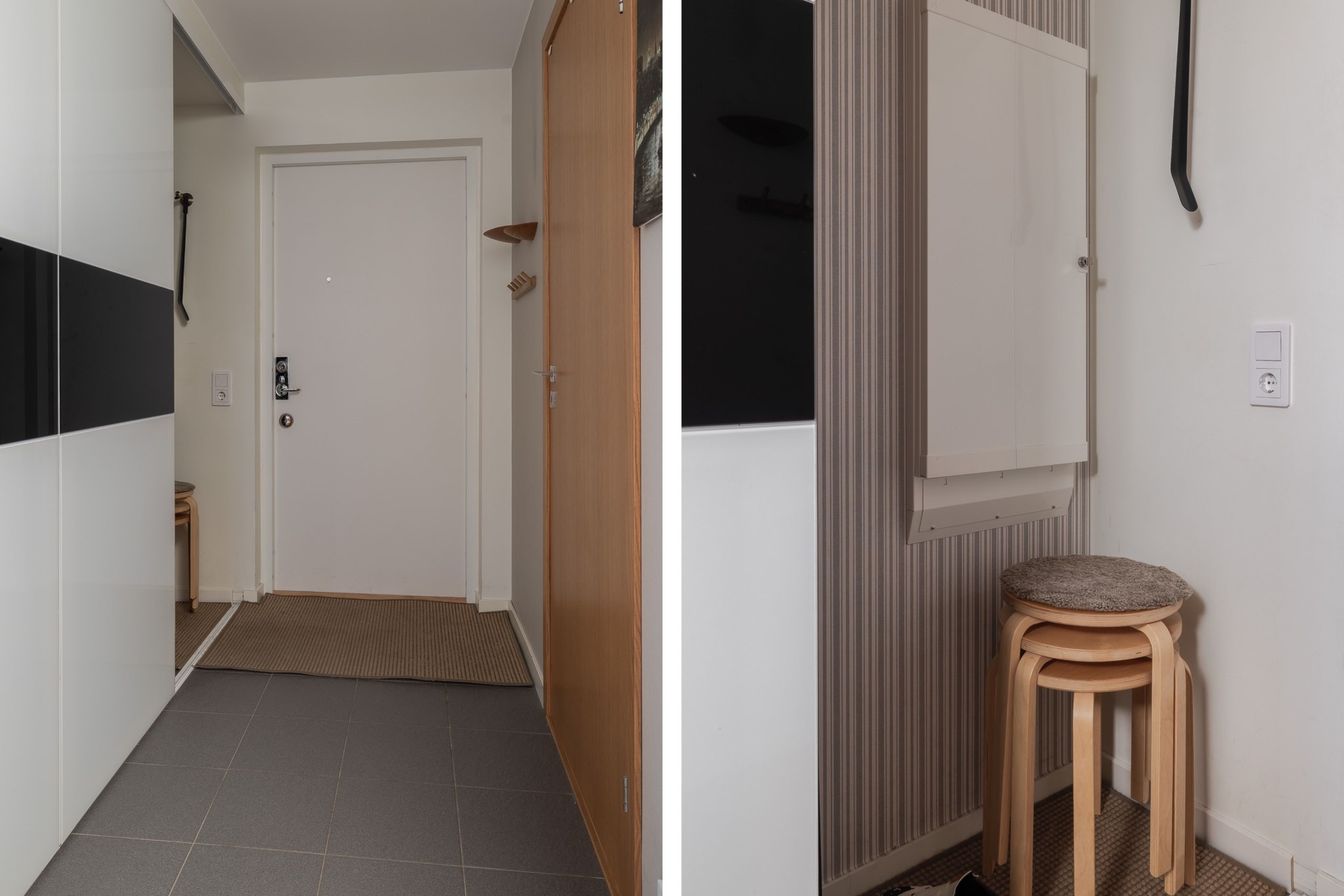 Välkomnande hall med ljusa ytskikt och grått klinkergolv. Plats för hatthylla finns intill ytterdörren samt goda förvaringsmöjligheter i stor garderob försedd med skjutdörrar. I anslutning till hallen ligger lägenhetens förråd.