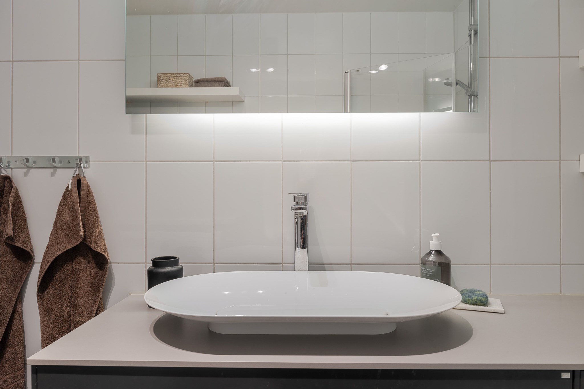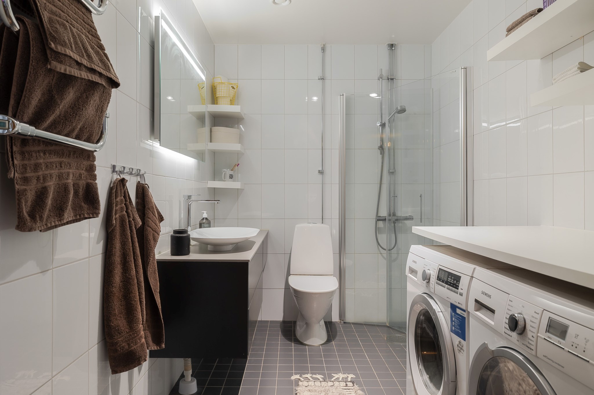 Helkaklat badrum med ljust kakel och mörkt klinker. Badrummet är utrustat med WC, handfat med kommod, golvvärme samt tvättmaskin och torktumlare. Duschhörnan är försedd med infällbara duschväggar i klarglas.