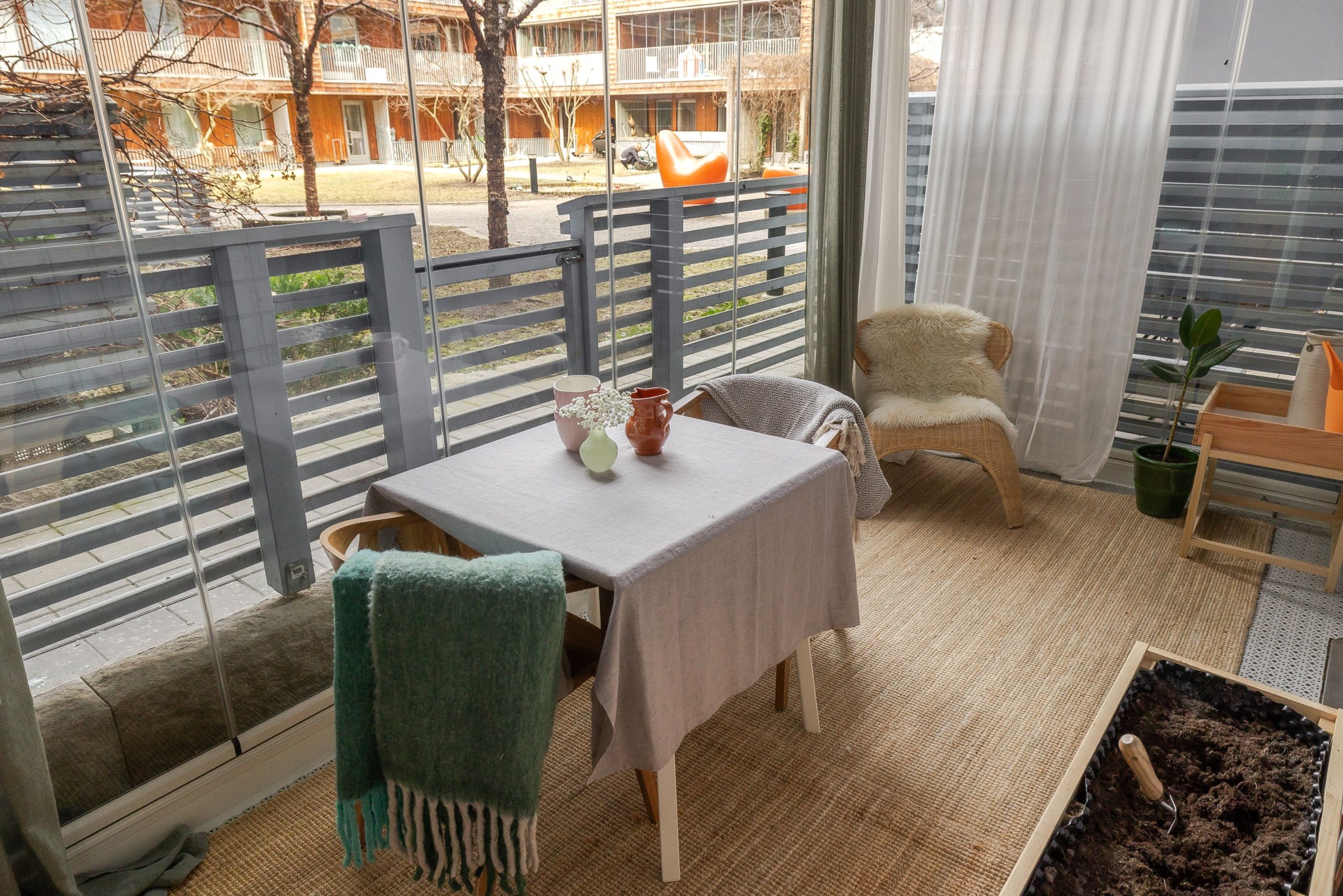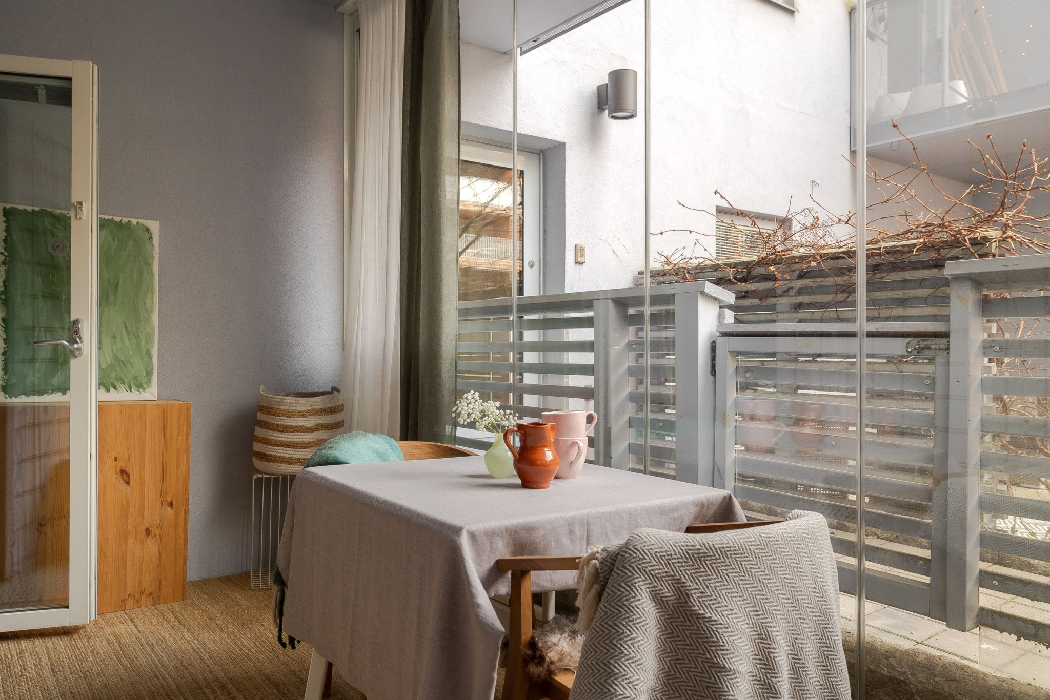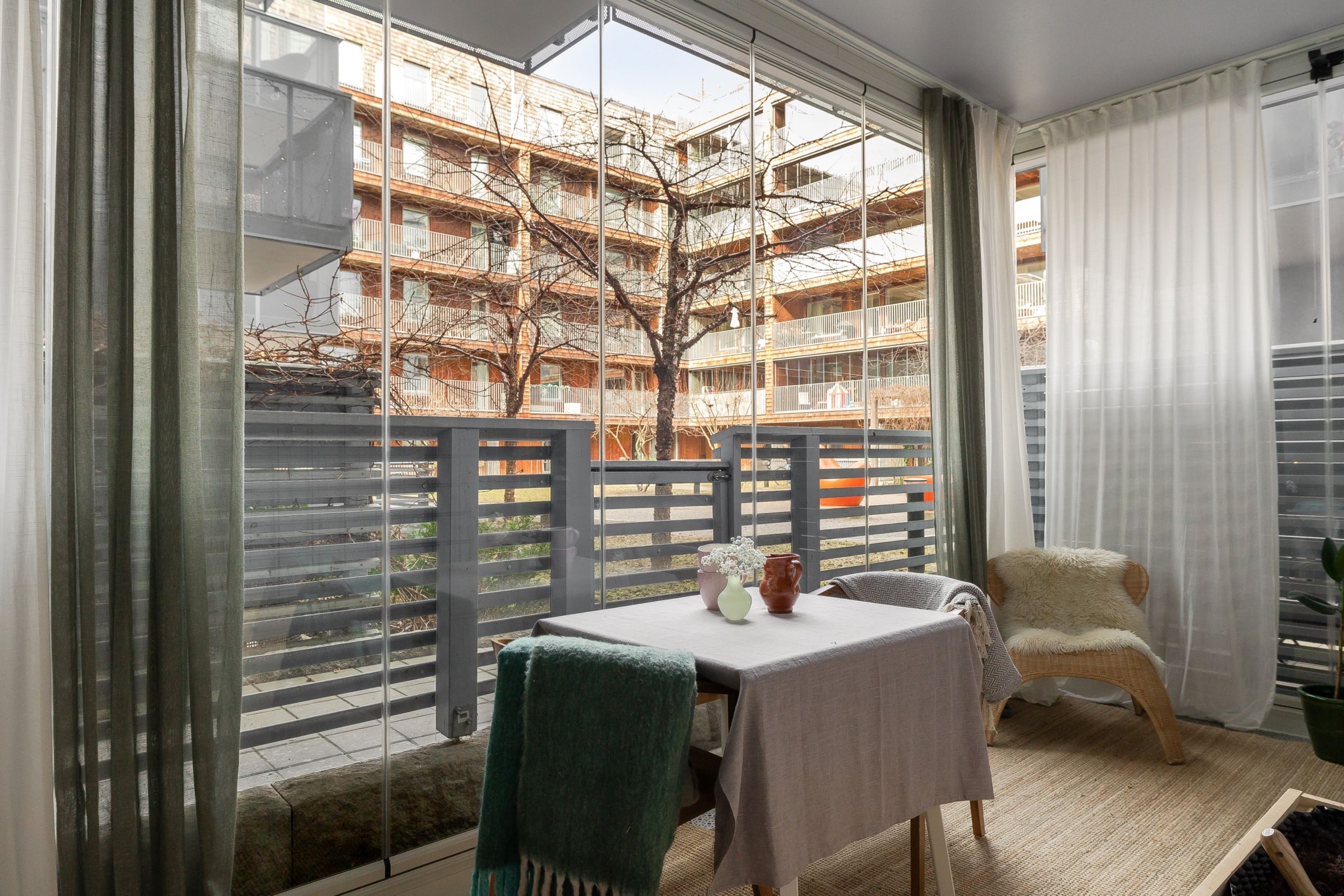 Till bostaden hör en inglasad uteplats som vetter mot innergården och fungerar som ett trivsamt uterum. Här finns gott om plats för både matgrupp och loungemöbler, en perfekt yta att njuta av större delen av året och skapa en ombonad utemiljö.