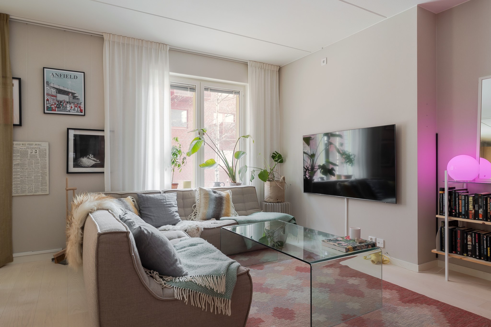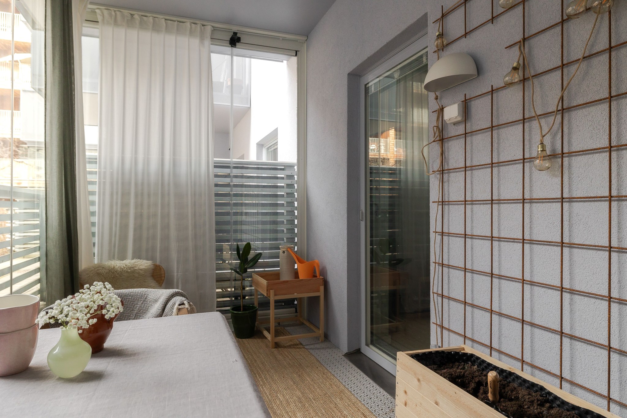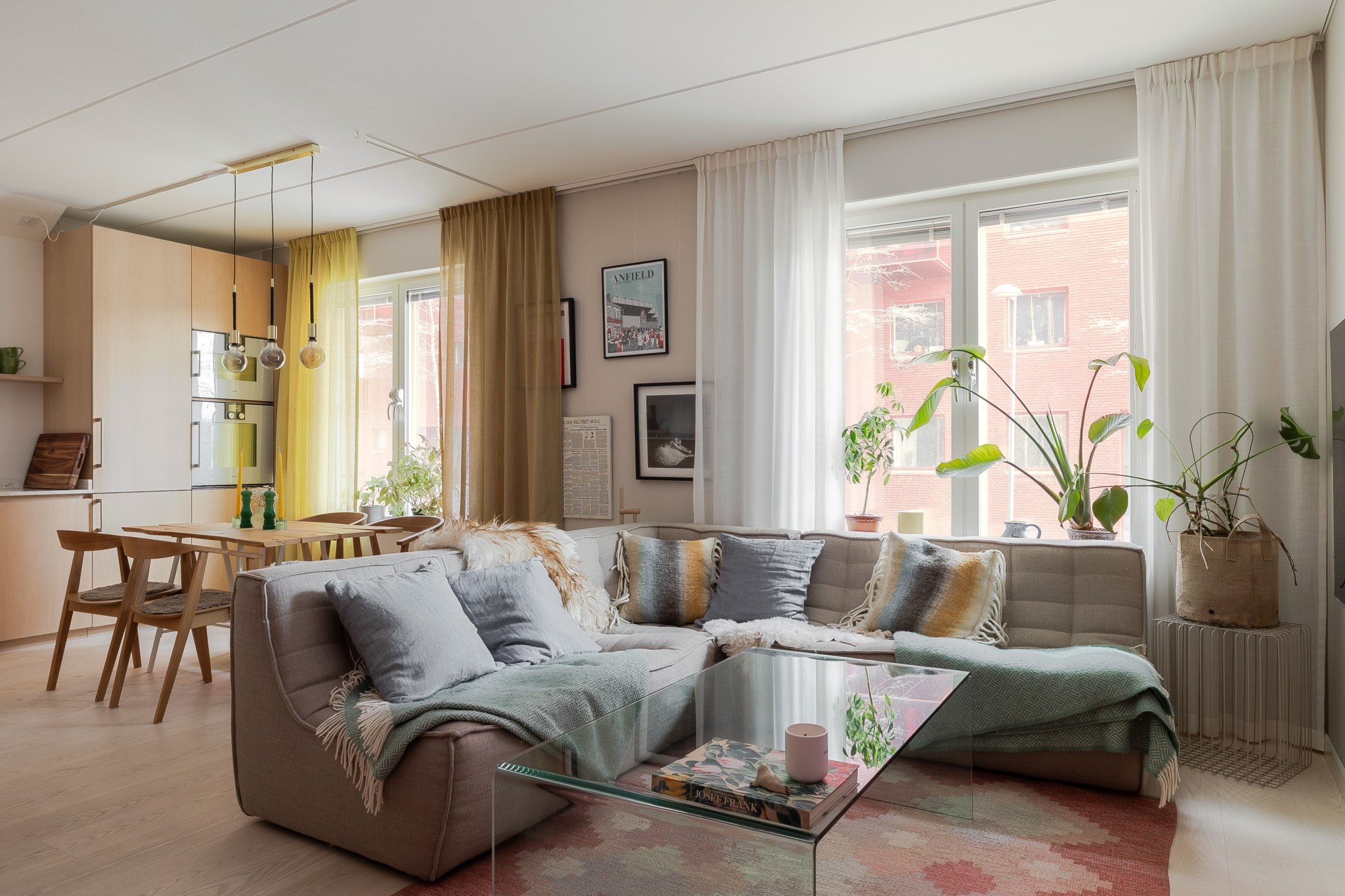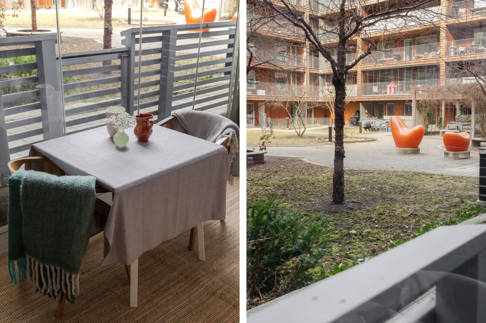 Till bostaden hör en inglasad uteplats som vetter mot innergården och fungerar som ett trivsamt uterum. Här finns gott om plats för både matgrupp och loungemöbler, en perfekt yta att njuta av större delen av året och skapa en ombonad utemiljö.