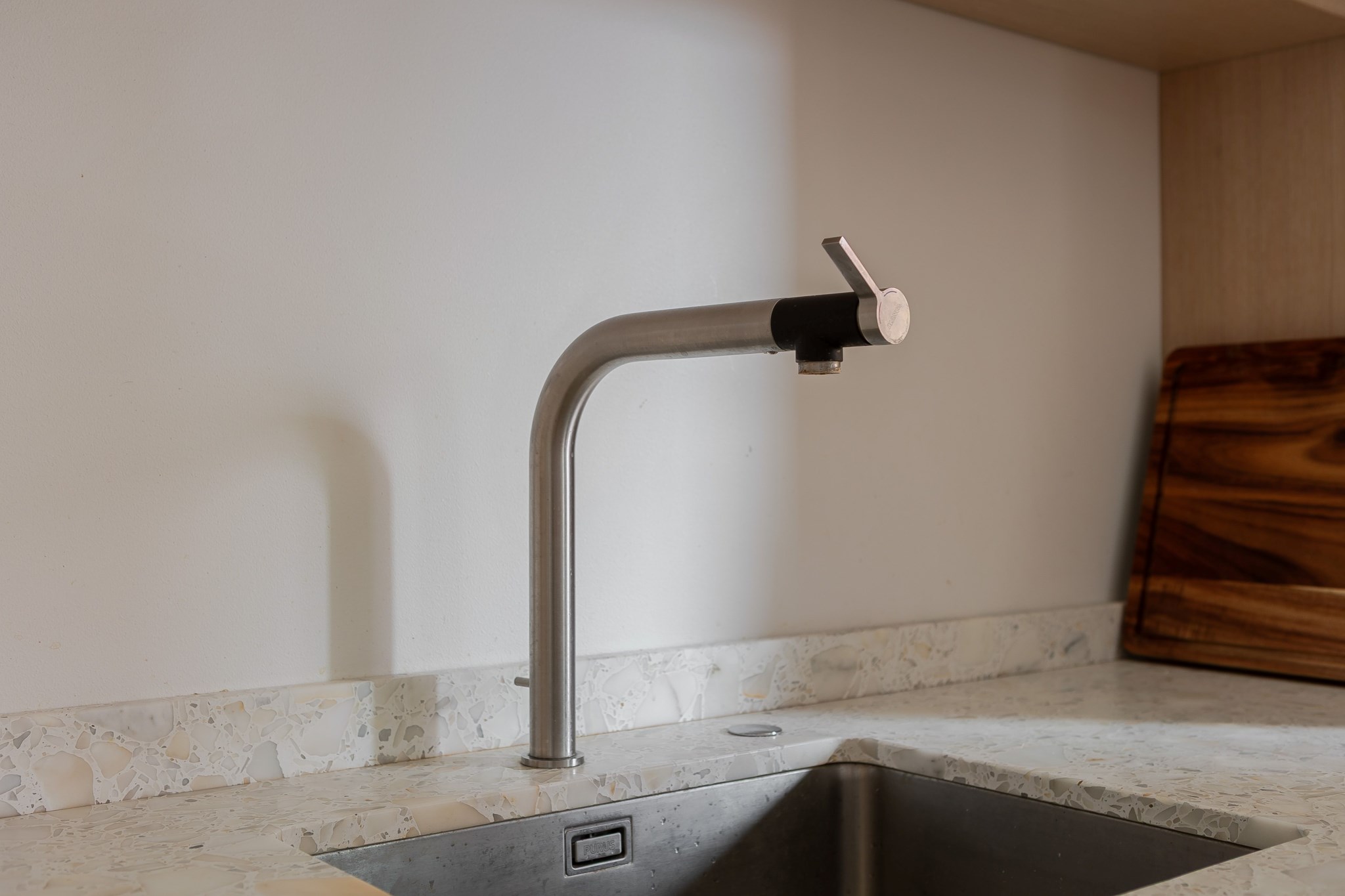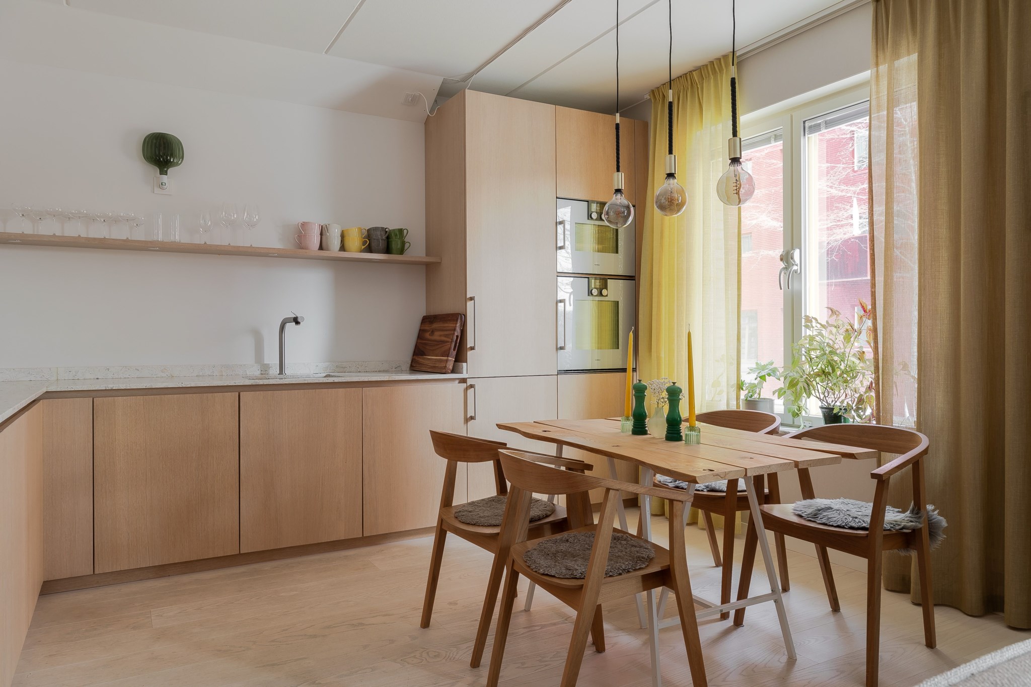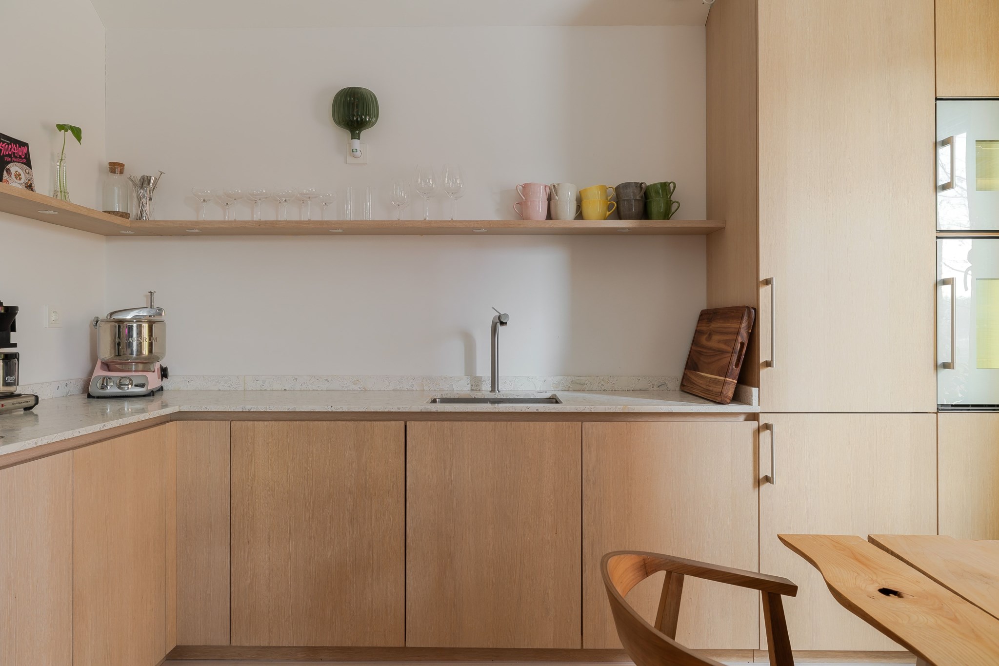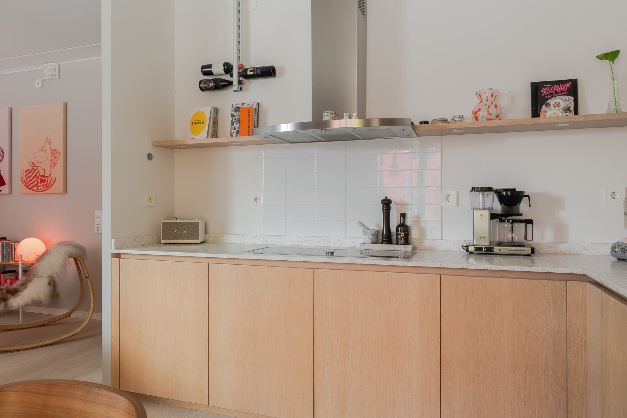 Exklusivt och stilrent kök med skåpsluckor i ljus ek och bänkskiva i terrazzo tillsammans med matchande stänkskydd. Köket är utrustat med integrerad kyl/frys från Siemens samt ugn, ång-ugn, diskmaskin och spishäll från Gaggenau. Ljusa målade väggar och golv i ljus parkett bidrar till en harmonisk och tidlös miljö.