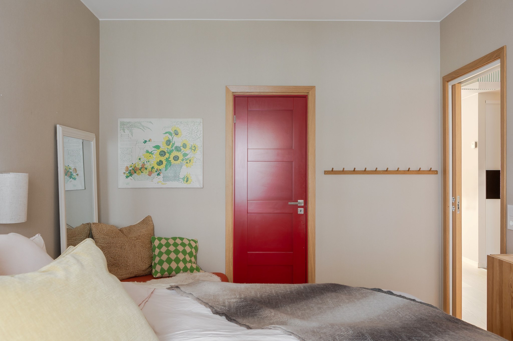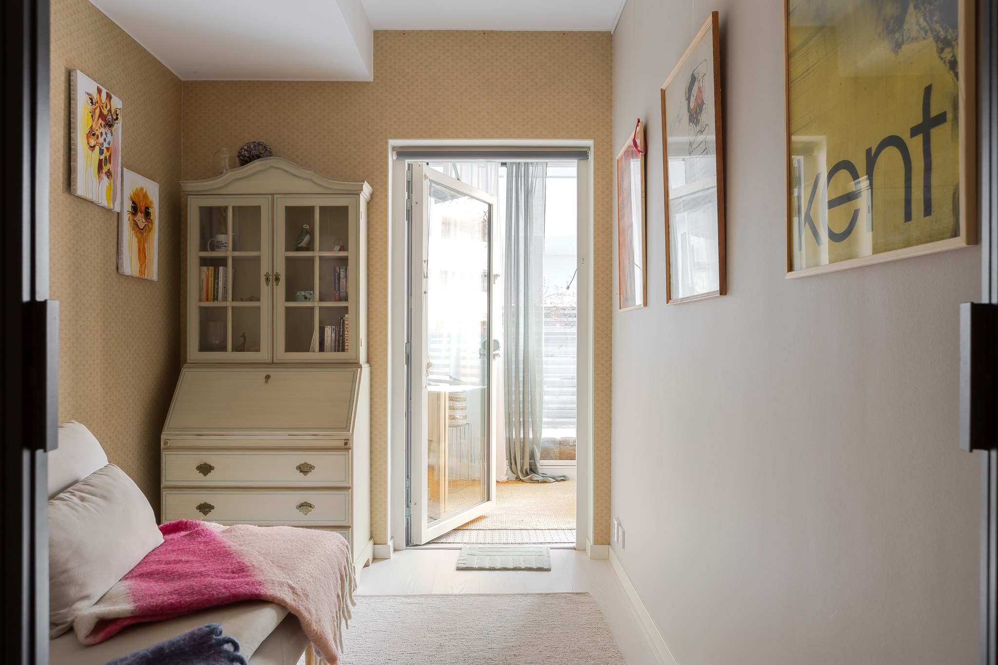 Mysigt sovrum med ljusa målade väggar och ljust parkettgolv. Rummet ligger i anslutning till den inglasade uteplatsen vilket ger ett fint ljusinsläpp och en lugn känsla. Här finns plats för säng och annat möblemang efter behov.