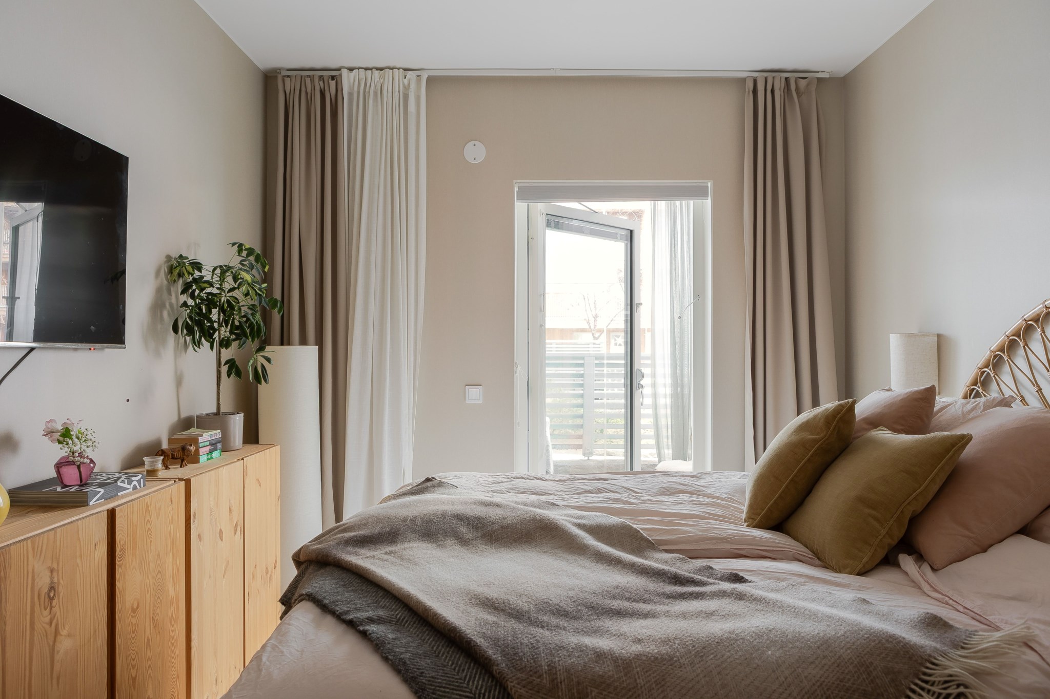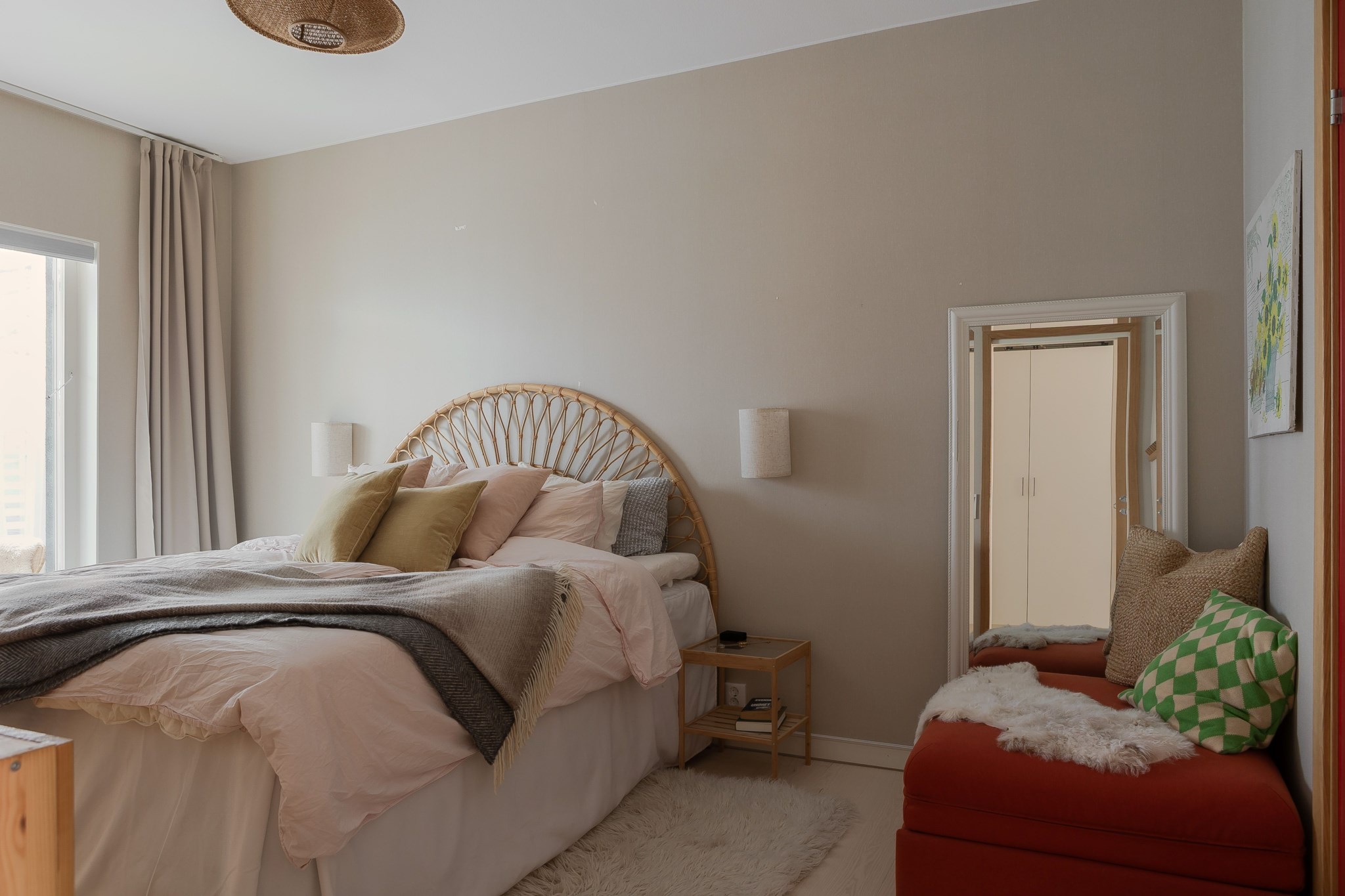 Mysigt och rofyllt master bedroom med plats för dubbelsäng, sängbord och kompletterande möblering. Rummet får ett fint ljusinsläpp från glasade dörrar som leder ut till uteplats mot innergård vilket skapar en lugn och behaglig atmosfär. Här finns dessutom en rymlig klädkammare med generös förvaring och samma ljusa målade väggar och golv i parkett som i resten av lägenheten.