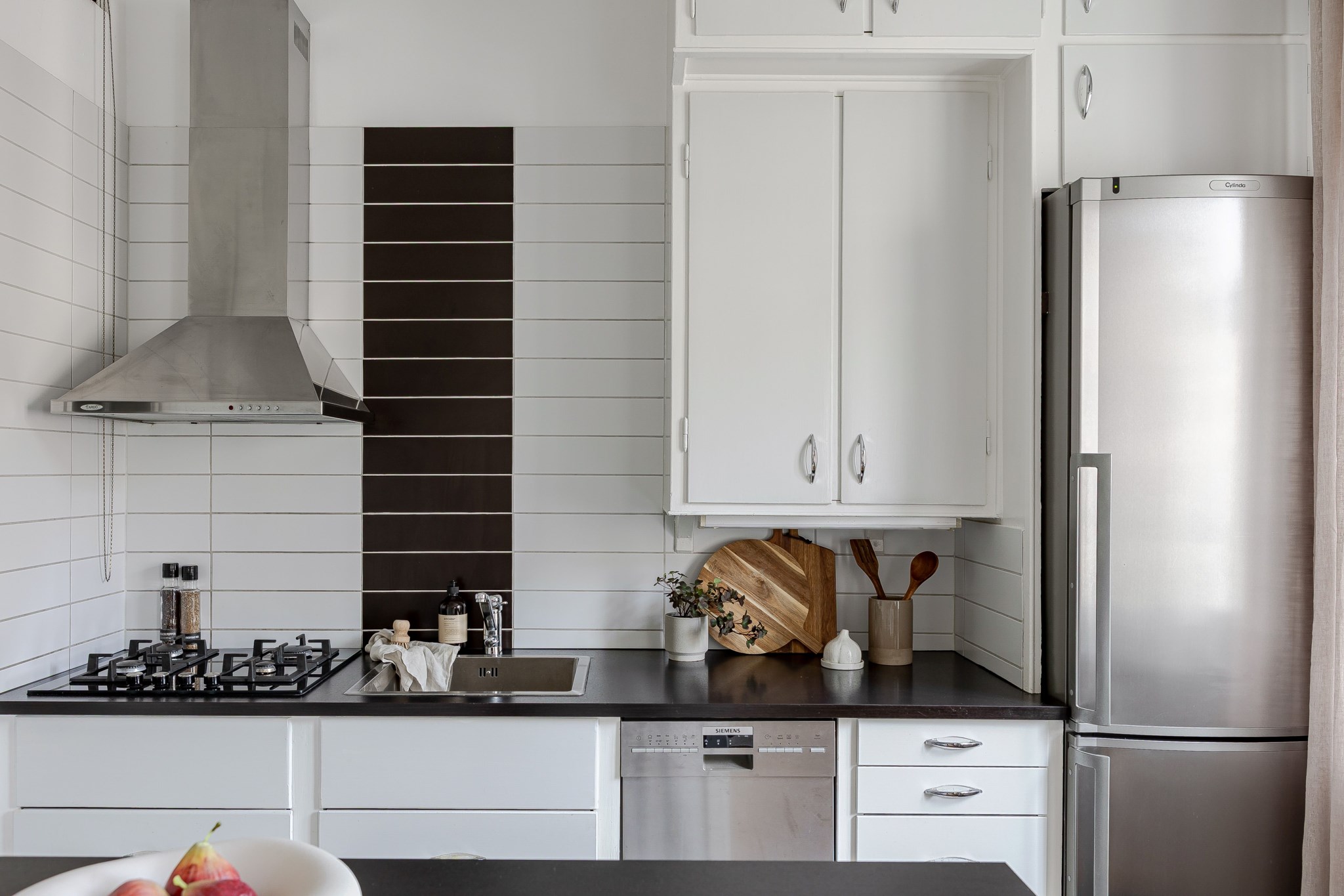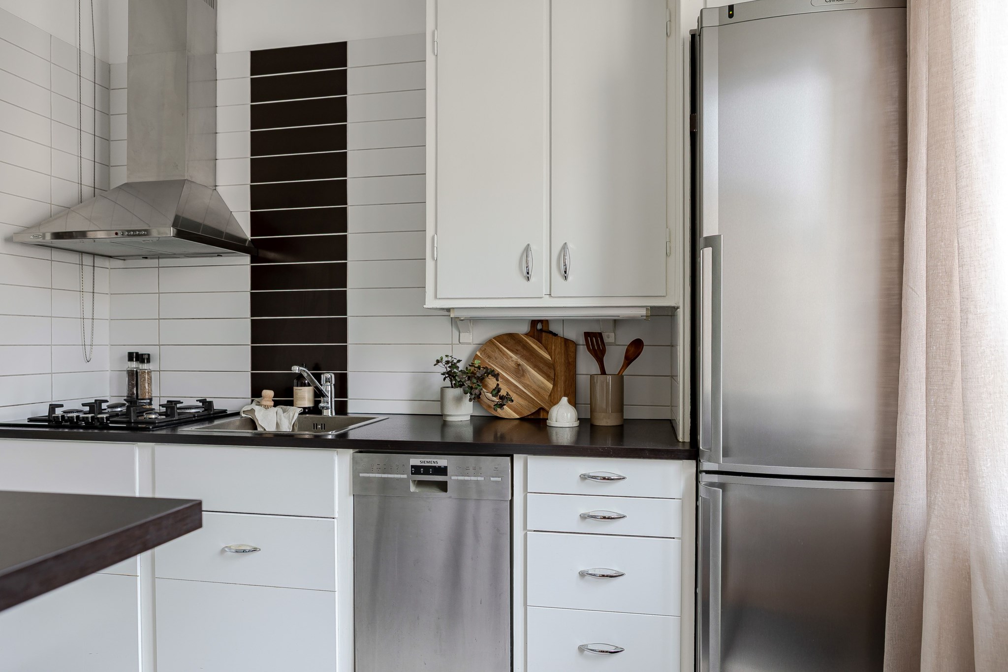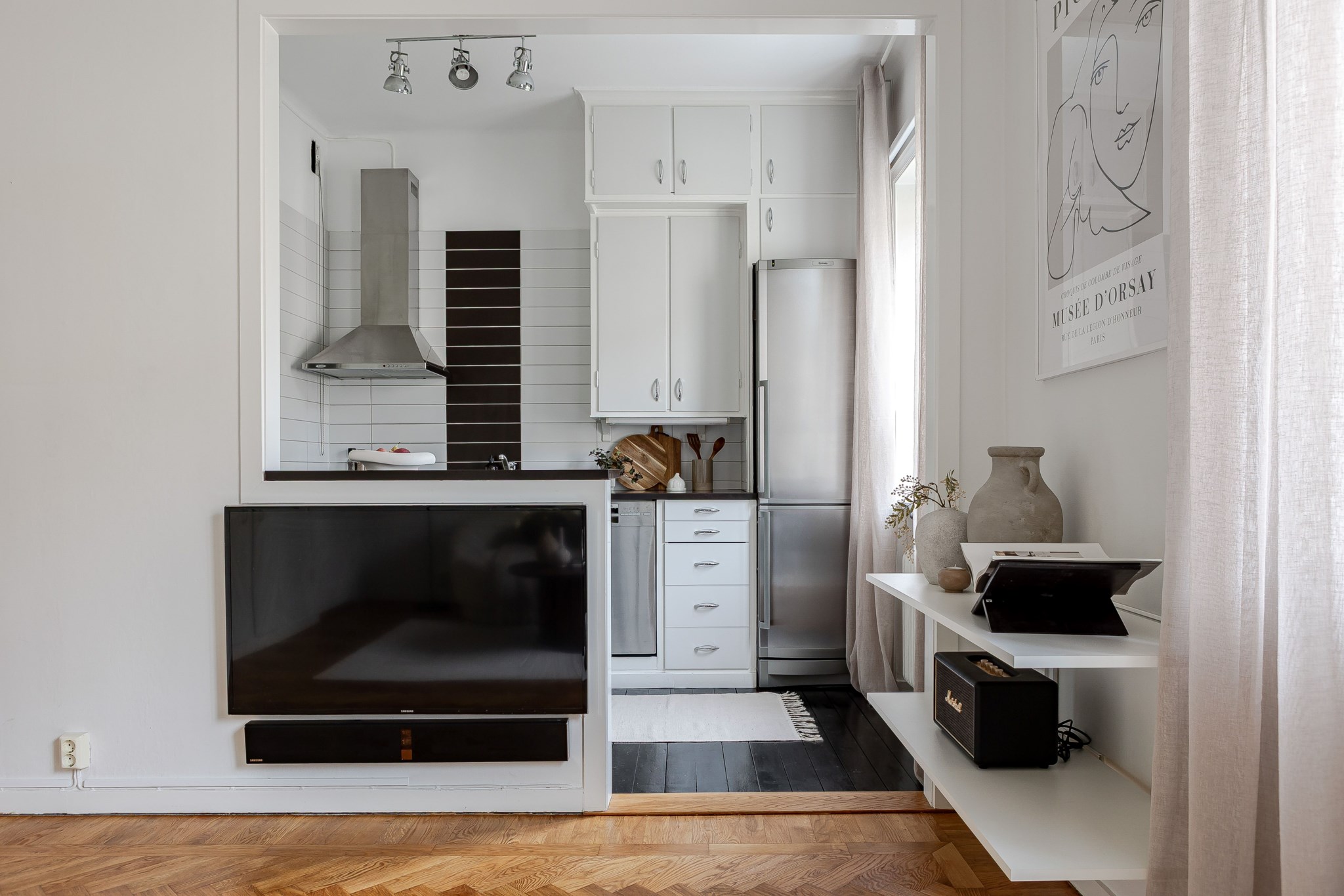 Bostaden erbjuder en social planlösning med öppenhet mellan kök och allrum, ett välutrustat kök med köksö och diskmaskin, generöst med förvaringsutrymmen samt fina tidstypiska detaljer.