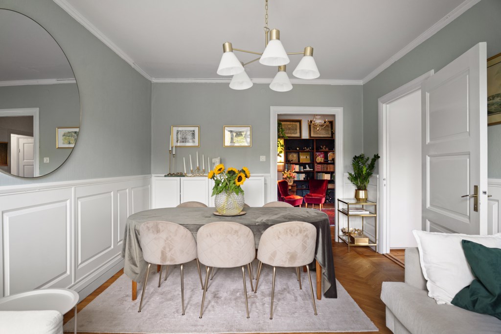 Luftigt vardagsrum med härligt ljusinsläpp från stort fönster med spröjs. Ytskikten består av ljusa väggar med bröstpanel samt fiskbensparkett. Vardagsrummet inrymmer soffa, soffbord, TV-möbel, matbord och annat möblemang efter smak och behov.