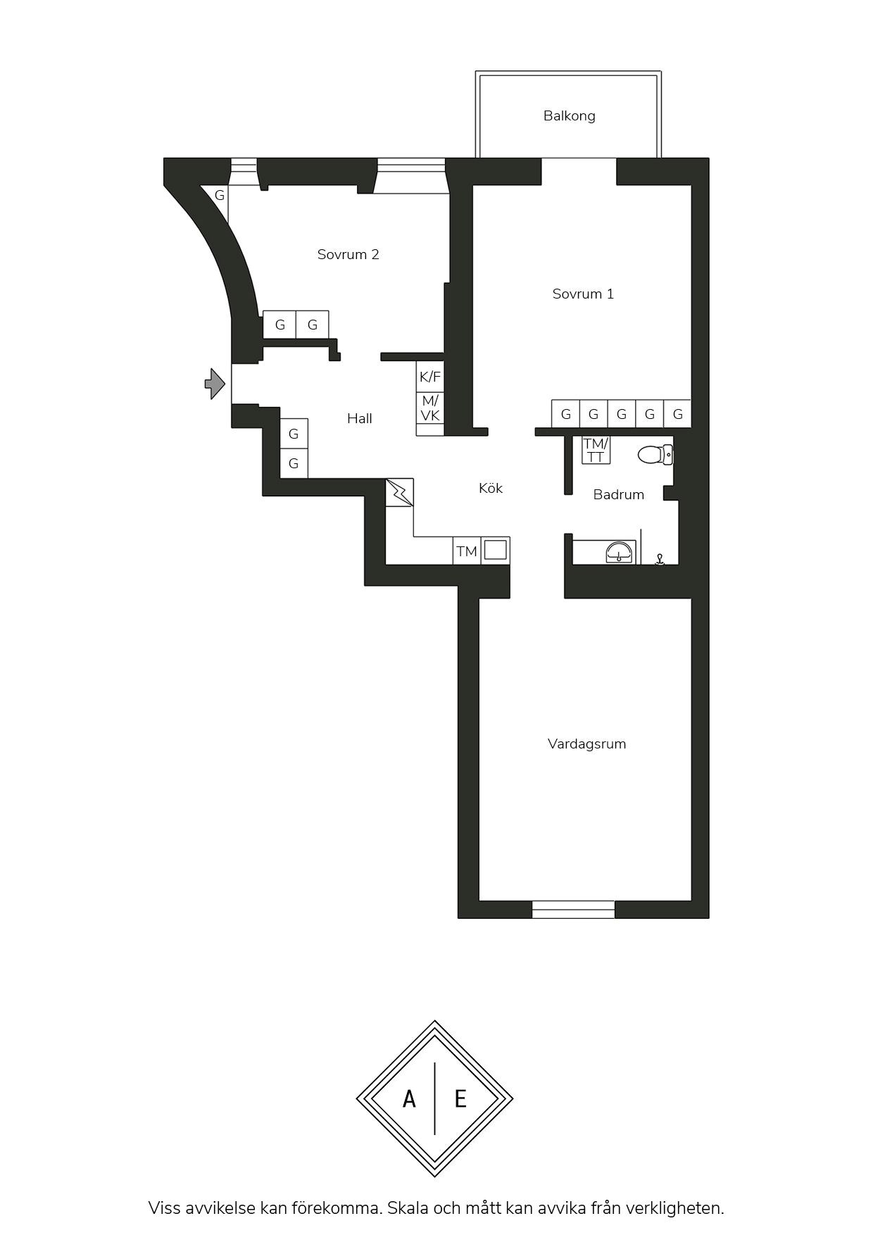 Den välplanerade planlösningen bjuder på två rymliga sovrum och ett luftigt vardagsrum – ett hem som passar både par, små familjer eller dig som vill ha ett extra rum för kontor eller gäster.