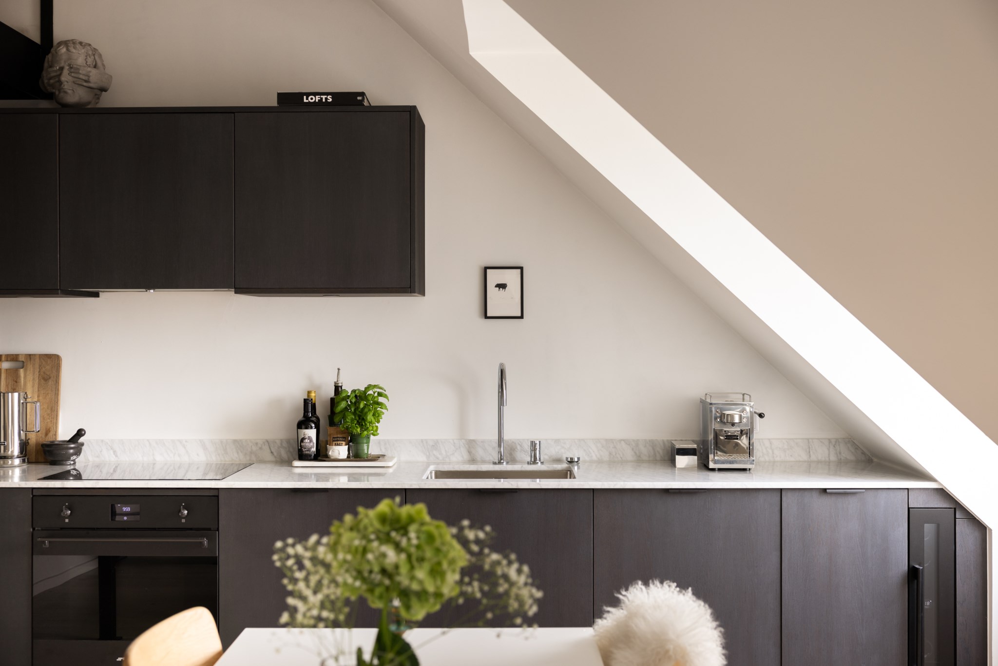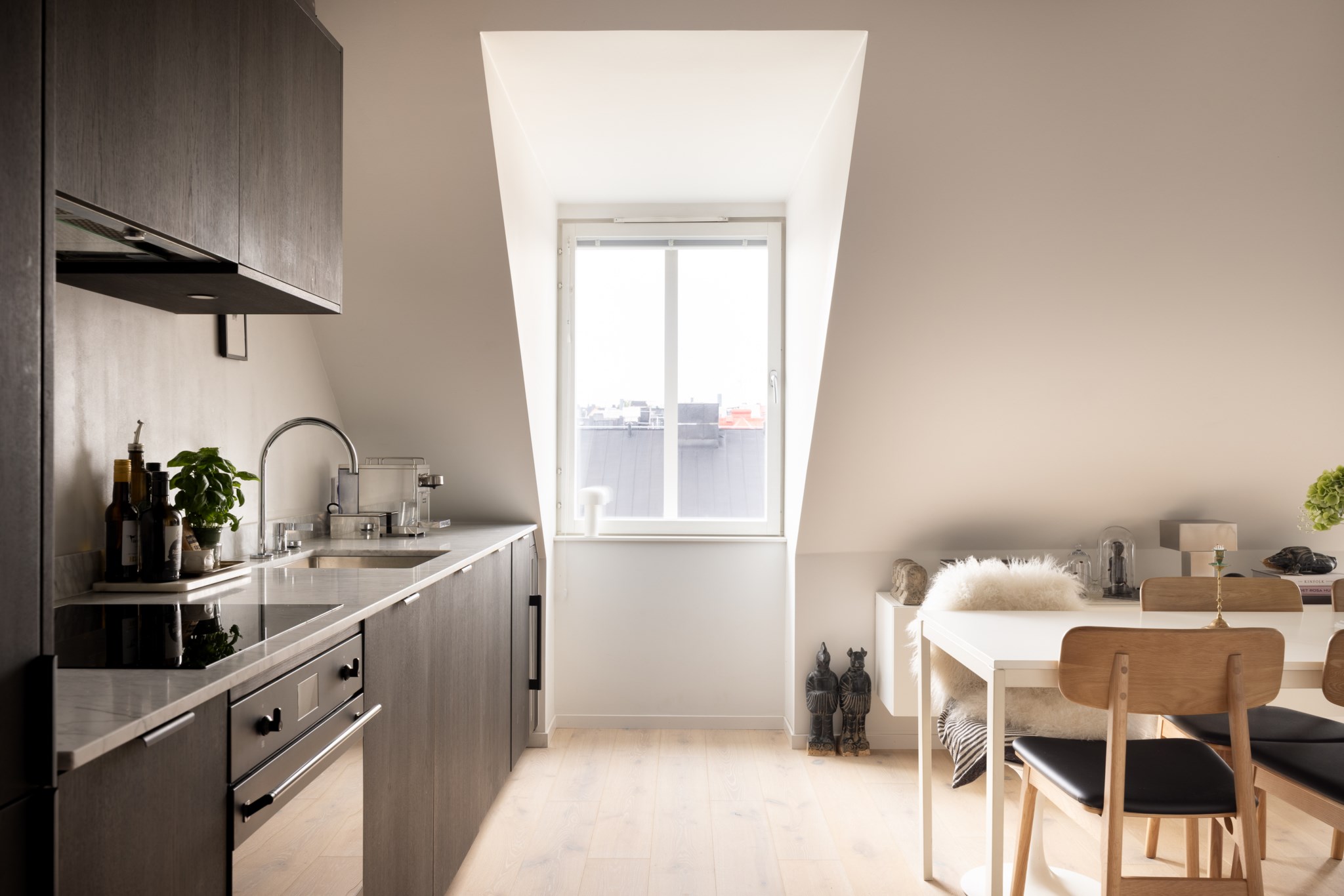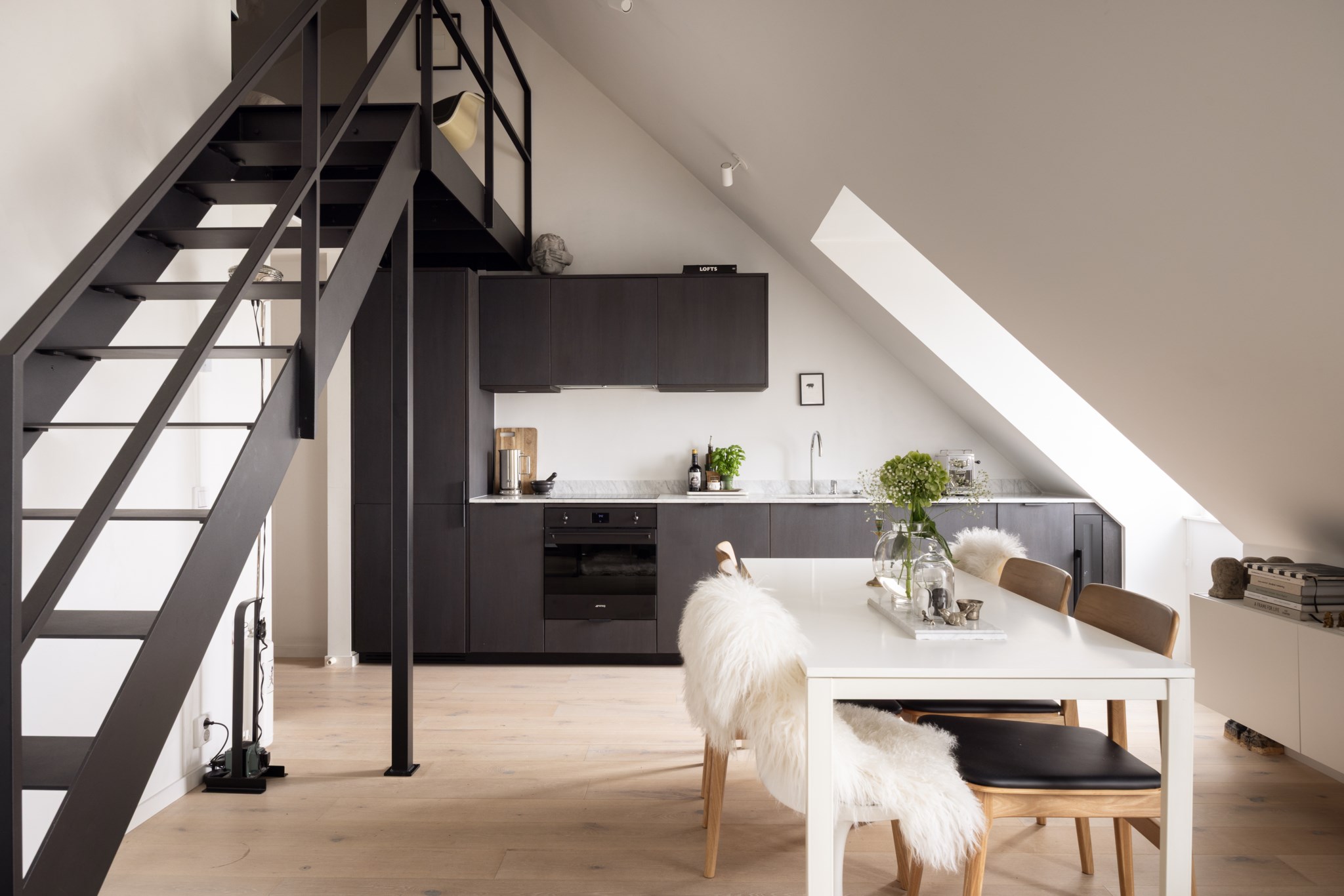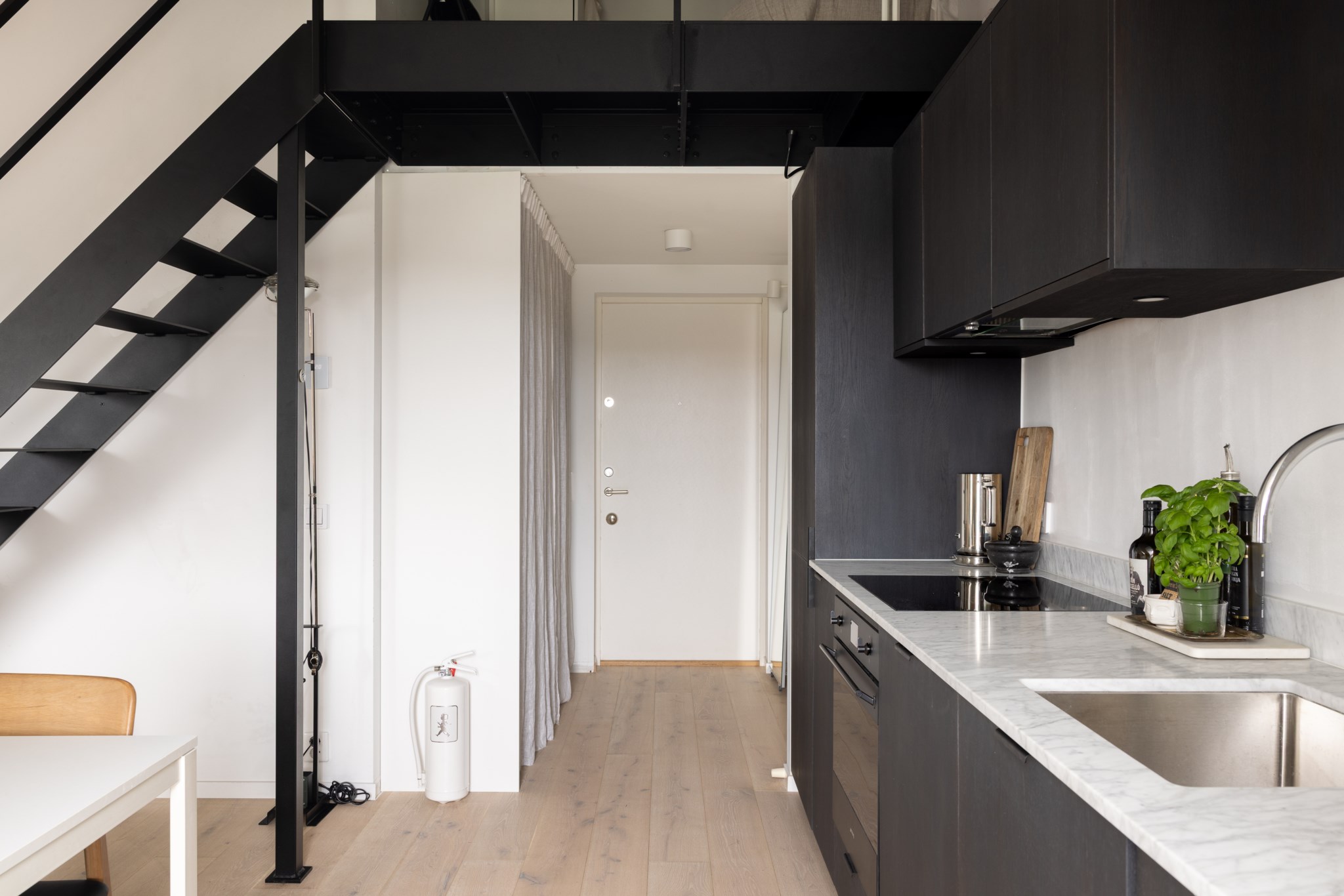 Köket är elegant inrett med fronter i svart ask och utrustat med kvalitativa vitvaror – en kombinerad ugn och mikro från SMEG, diskmaskin från Bosch samt en effektiv fläkt kopplad till fjärråskupan. Här finns gott om både arbetsyta och förvaring, vilket gör köket till en självklar samlingspunkt. Badrummet är helkaklat och förberett för tvättmaskin. En trappa upp finner du ett mysigt sovloft. Här kombineras äldre charm med moderna materialval och smart planering – ett hem som erbjuder både karaktär, funktion och en unik atmosfär mitt i stadens puls.