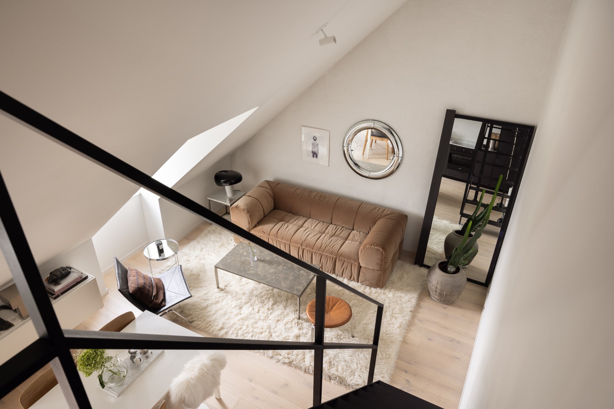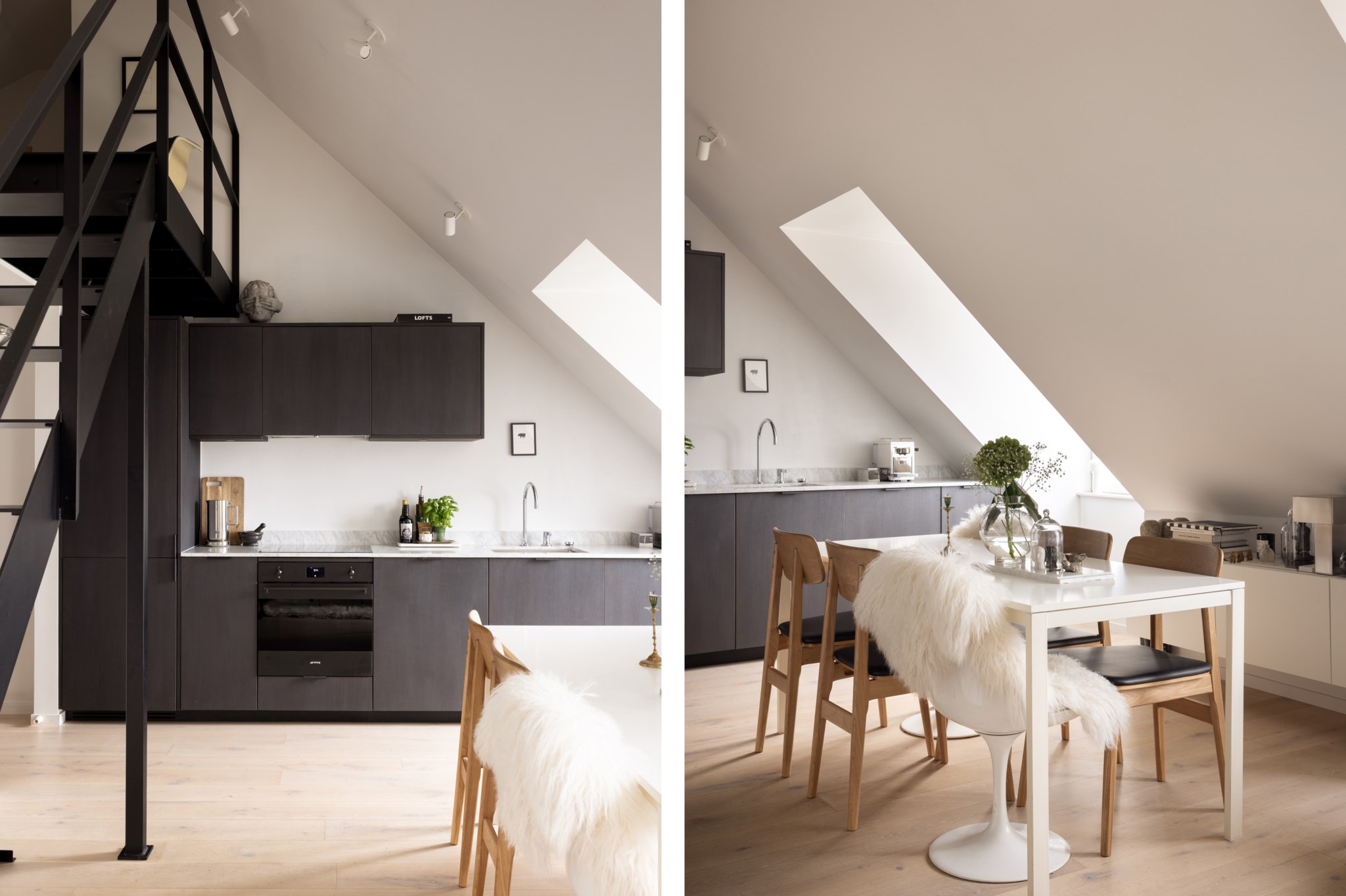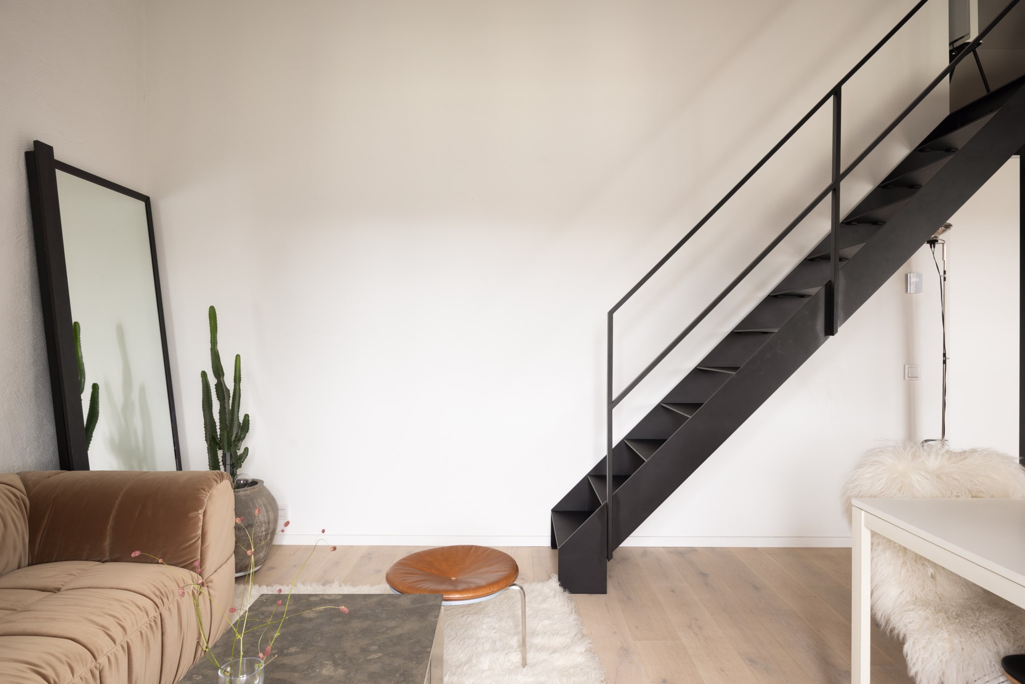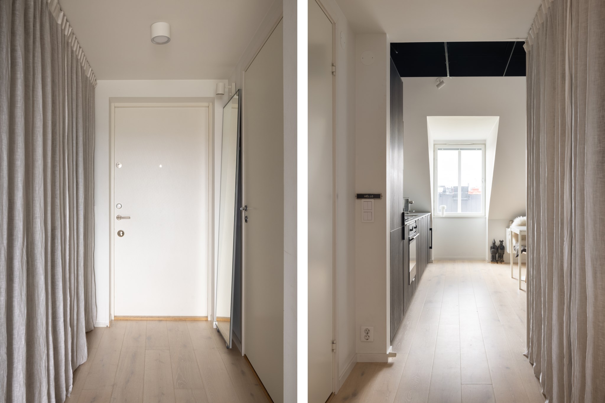 Köket är elegant inrett med fronter i svart ask och utrustat med kvalitativa vitvaror – en kombinerad ugn och mikro från SMEG, diskmaskin från Bosch samt en effektiv fläkt kopplad till fjärråskupan. Här finns gott om både arbetsyta och förvaring, vilket gör köket till en självklar samlingspunkt. Badrummet är helkaklat och förberett för tvättmaskin. En trappa upp finner du ett mysigt sovloft. Här kombineras äldre charm med moderna materialval och smart planering – ett hem som erbjuder både karaktär, funktion och en unik atmosfär mitt i stadens puls.