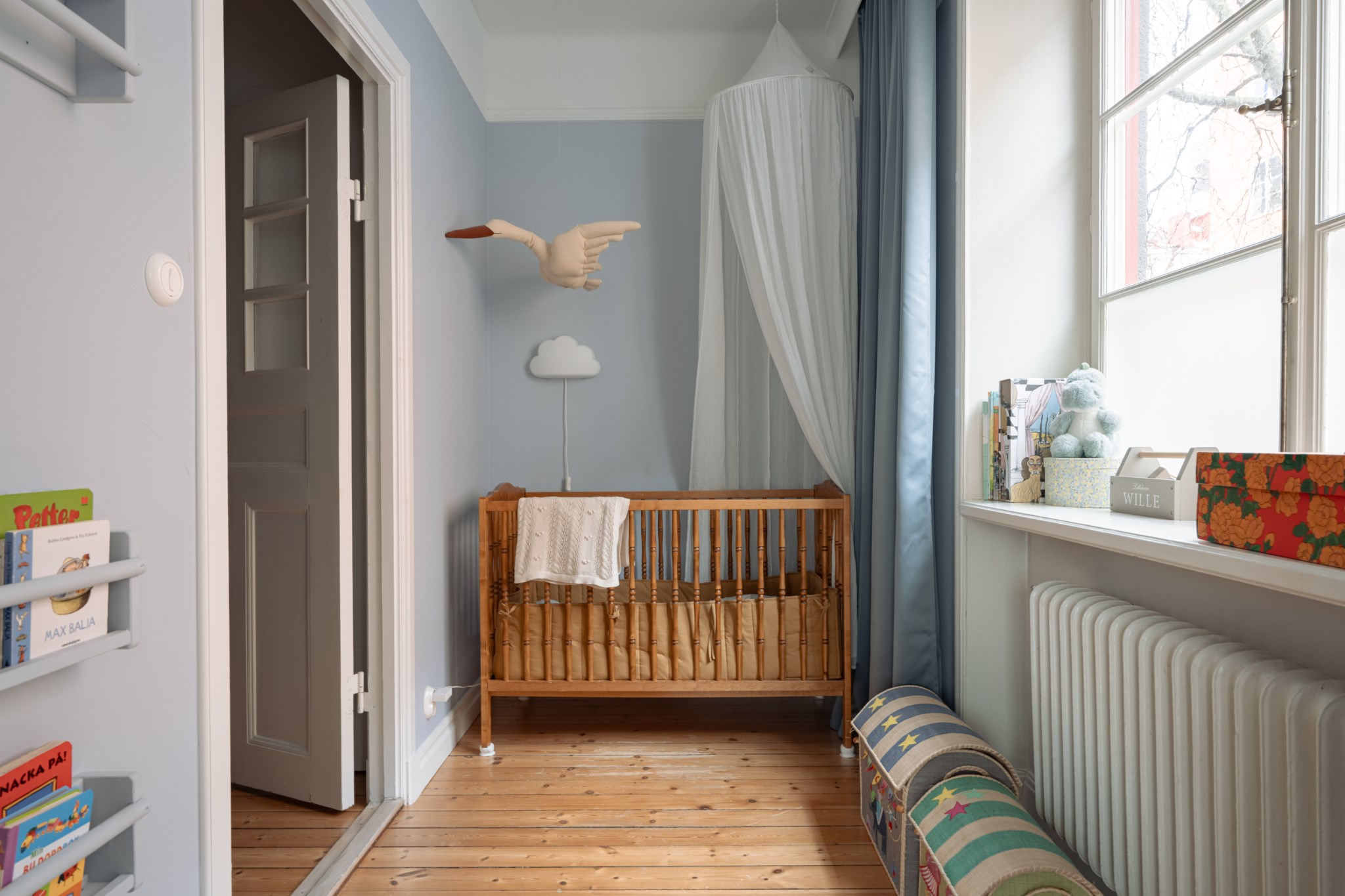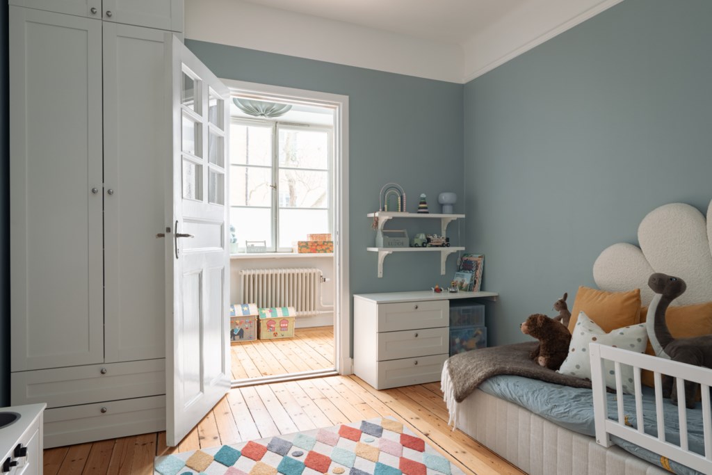 Sovrum med plats för säng, skrivbord och byrå. Väggar i vit kulör och ljust golv. Fint ljusinsläpp från fönster med spröjs.