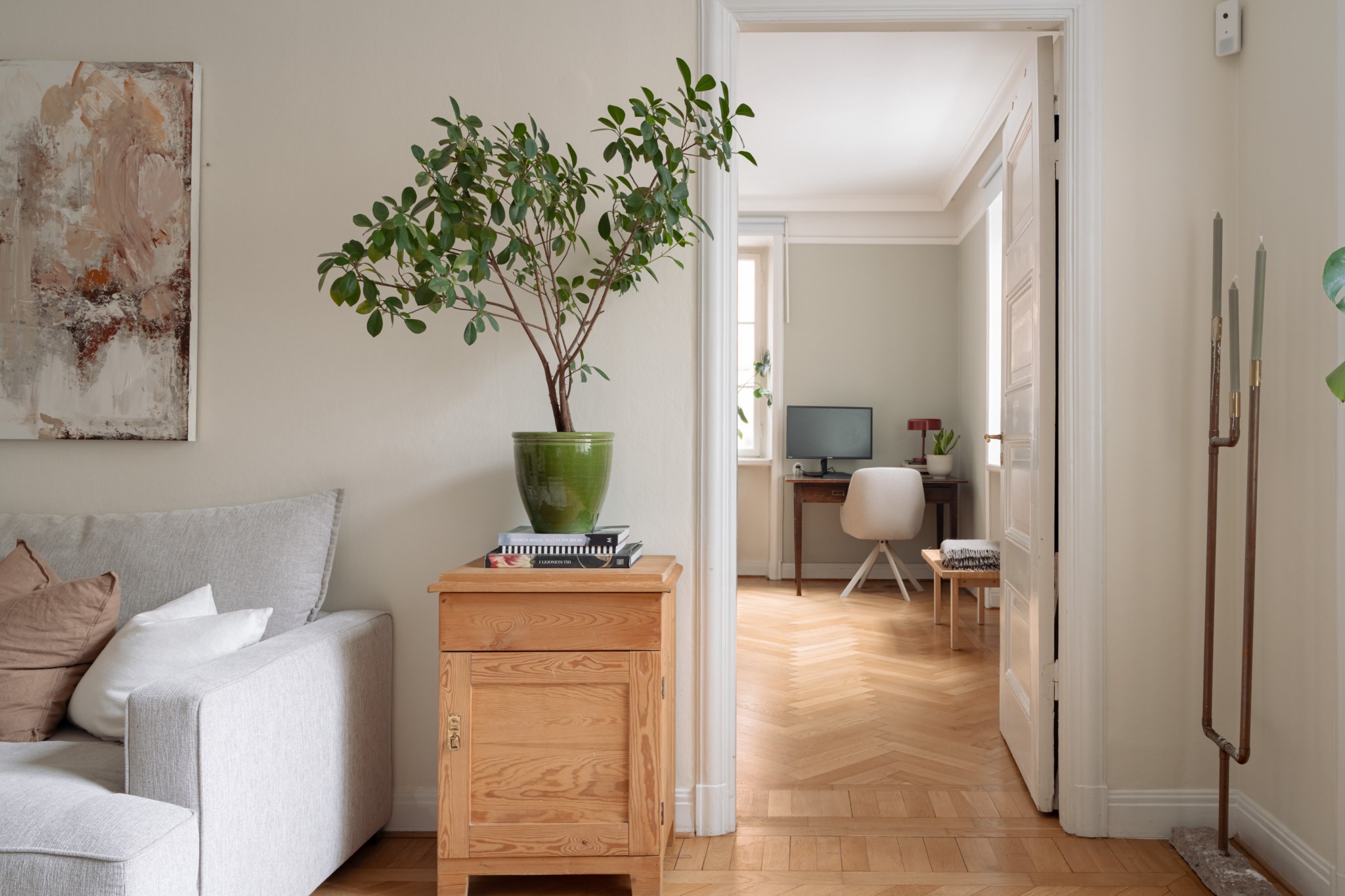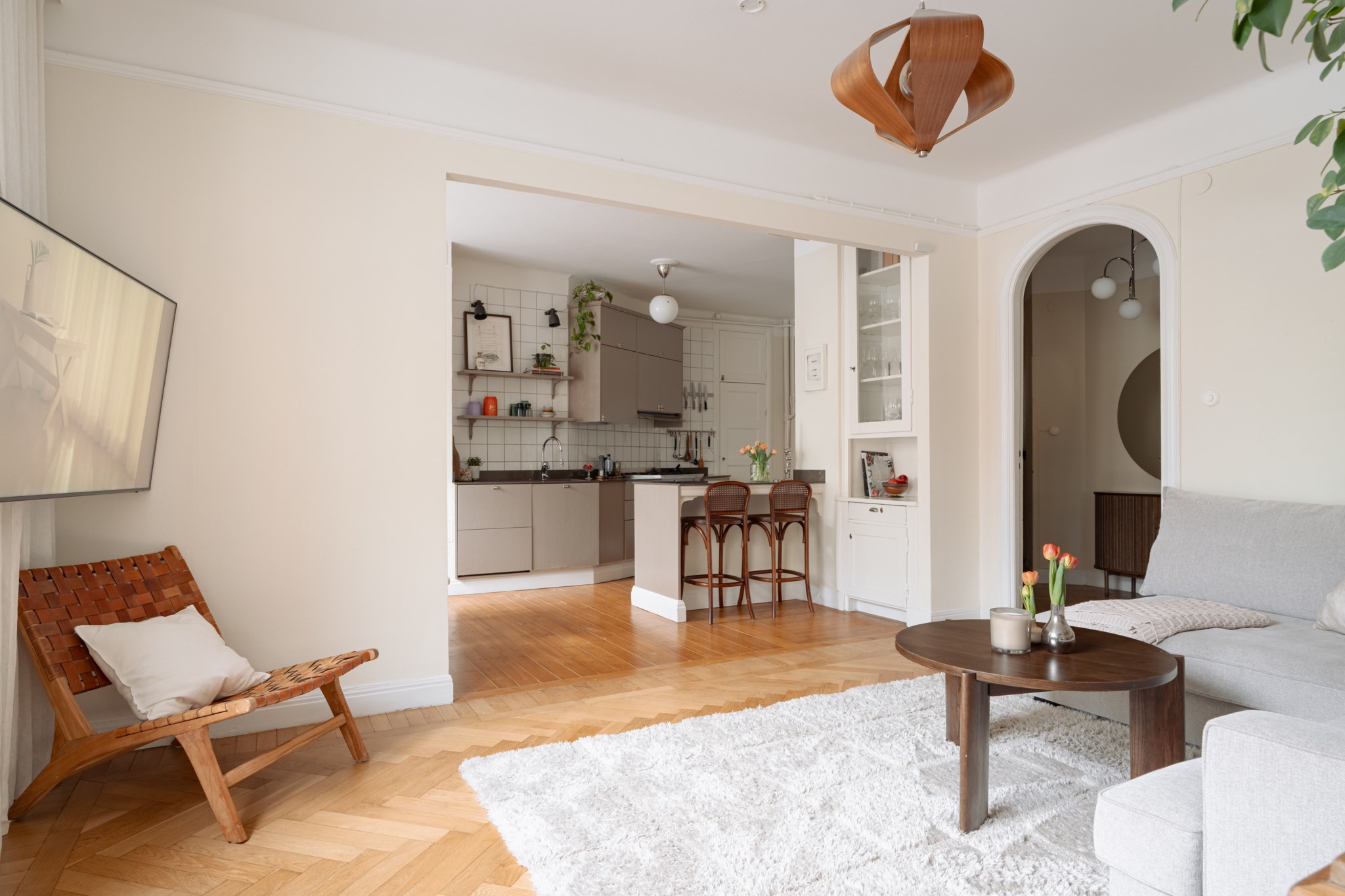 Bostaden erbjuder en öppen och social planlösning mellan vardagsrum och kök. Ett rymligt vardagsrum med vacker fiskbensparkett, högt i tak och stora spröjsade fönster, ett fint ljusinsläpp i hela bostaden med fönster i två väderstreck mot föreningens gård. Ett stilrent kök med påkostade vitvaror från Bertazzoni. Ett stort sovrum med gott om förvaring och tvåa mindre sovrum. Till bostaden disponeras även tre förråd, ett precis utanför lägenheten, ett större på vinden och ett mellan i källaren. Ett stambytt och fräscht badrum med tvättmaskin.