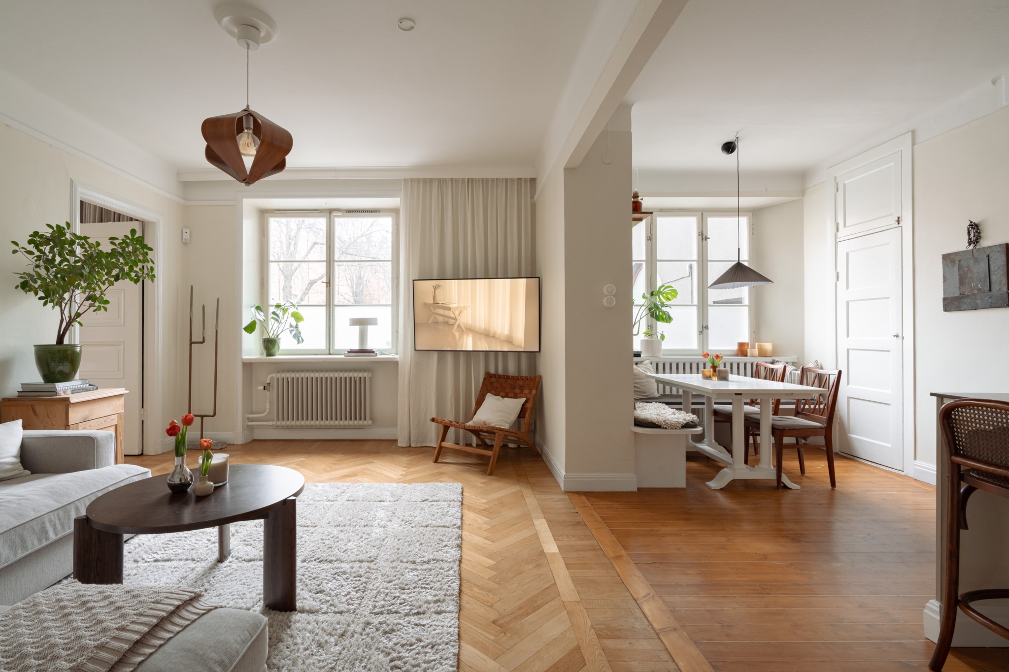 Rymligt vardagsrum med generöst ljusinsläpp från dubbla fönster med spröjs. Här finns plats att möblera med större soffgrupp och annat möblemang efter smak och behov. Väggar i vit kulör och fiskbensparkett.