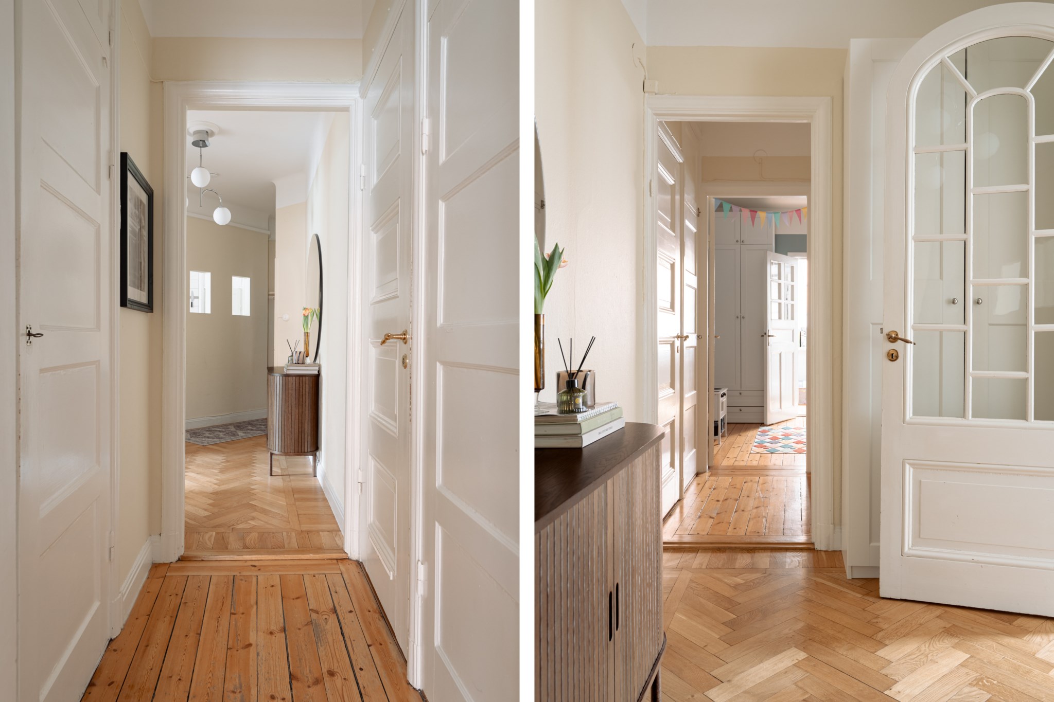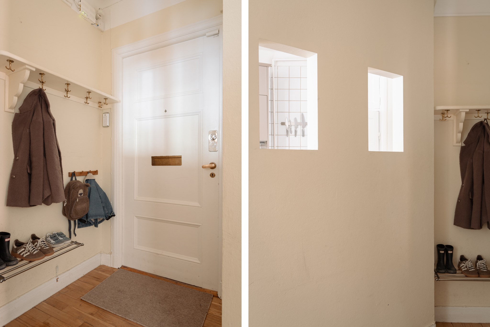 Välkomnande hall med generös takhöjd. Väggar i kulör och ljus fiskbensparkett. Plats för avhängning.
