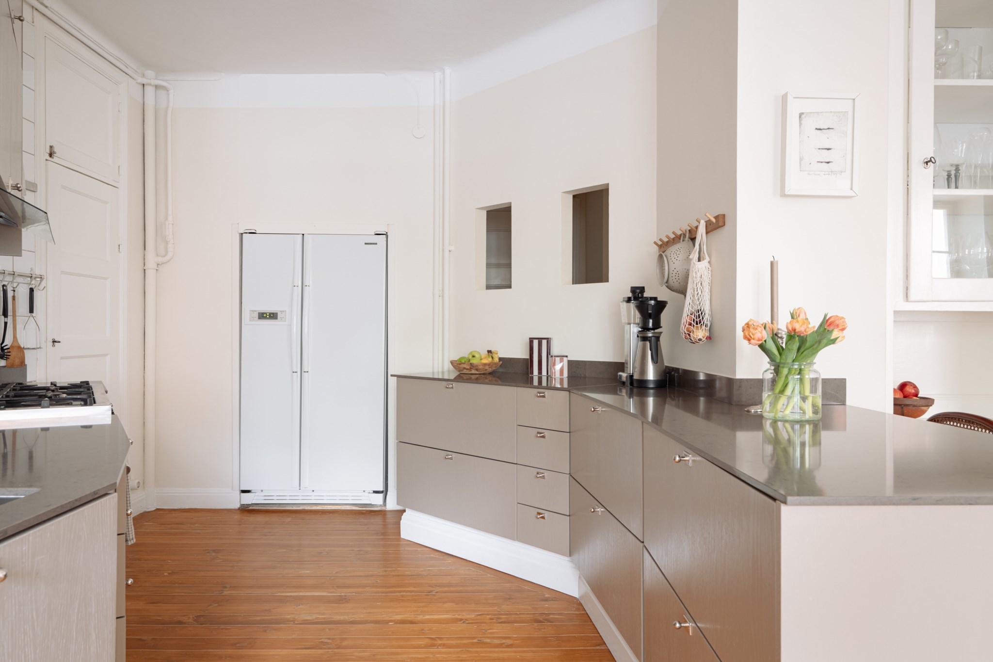 Modernt kök i social planlösning mot vardagsrum. Genomgående skåpsluckor i ljus färg och mörk bänkskiva. Utrustat med gasspis, ugn, fläkt, diskmaskin samt kyl- och frys. Gott om förvaring i skåp. Väggar i vit kulör och ljust golv.