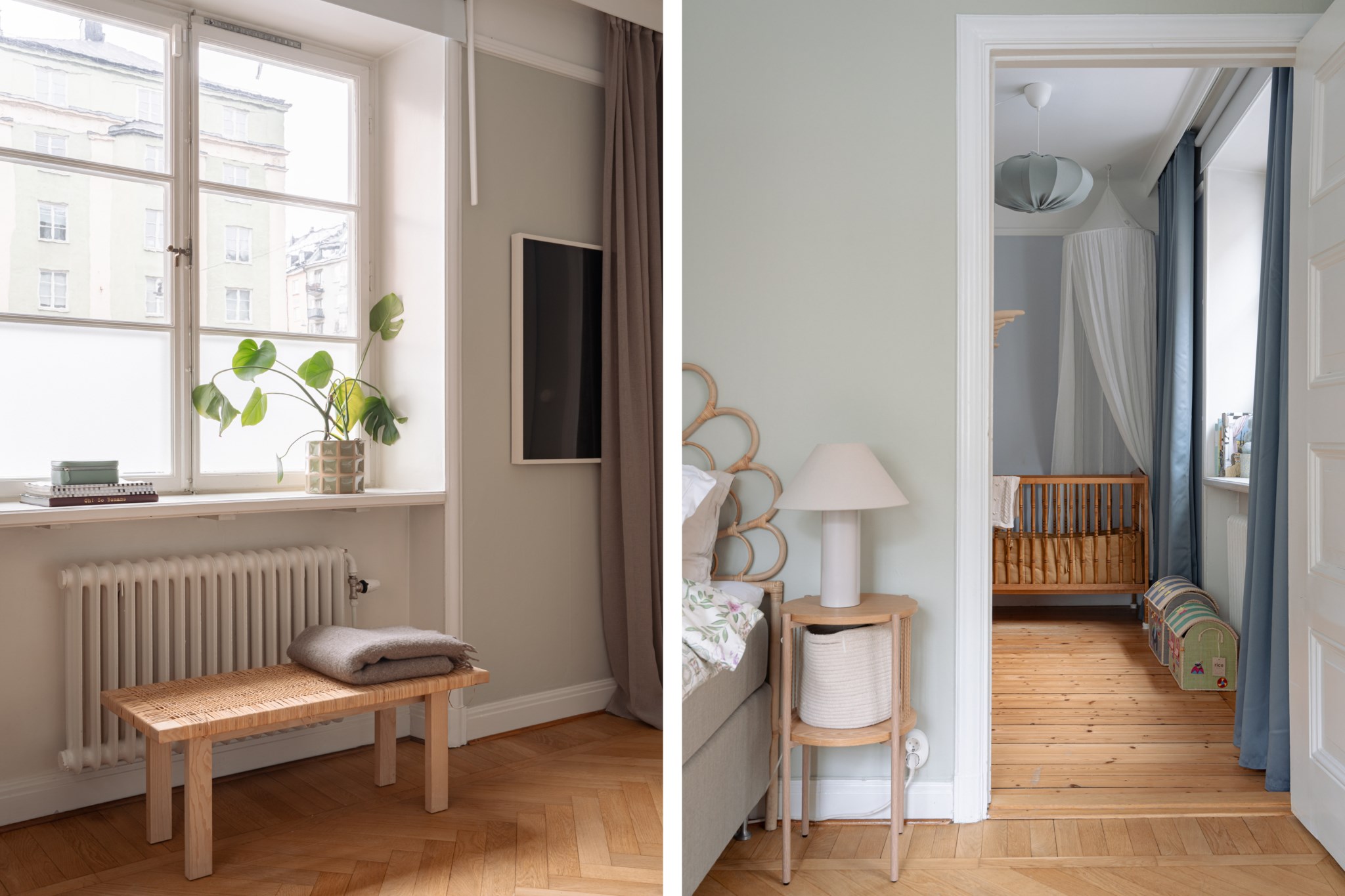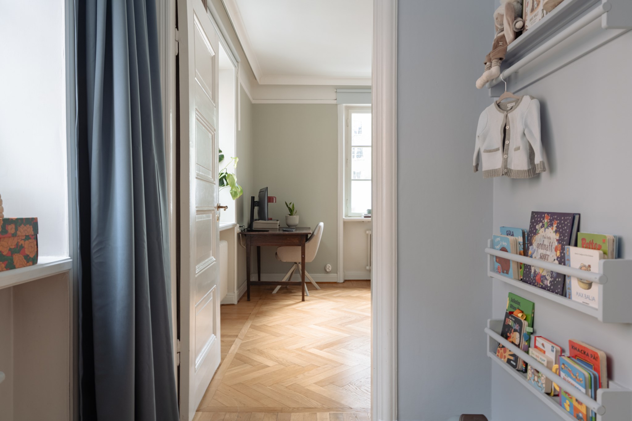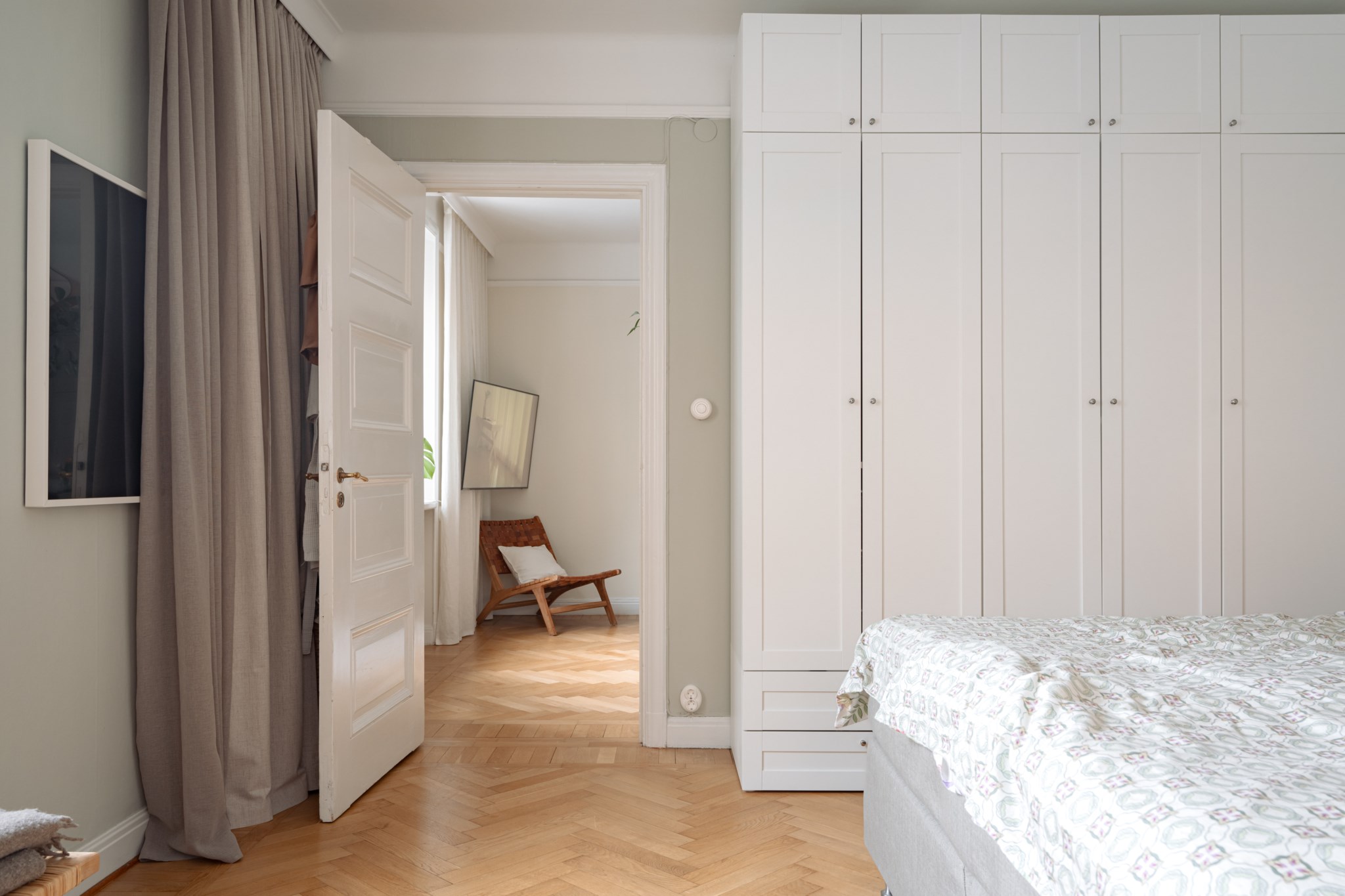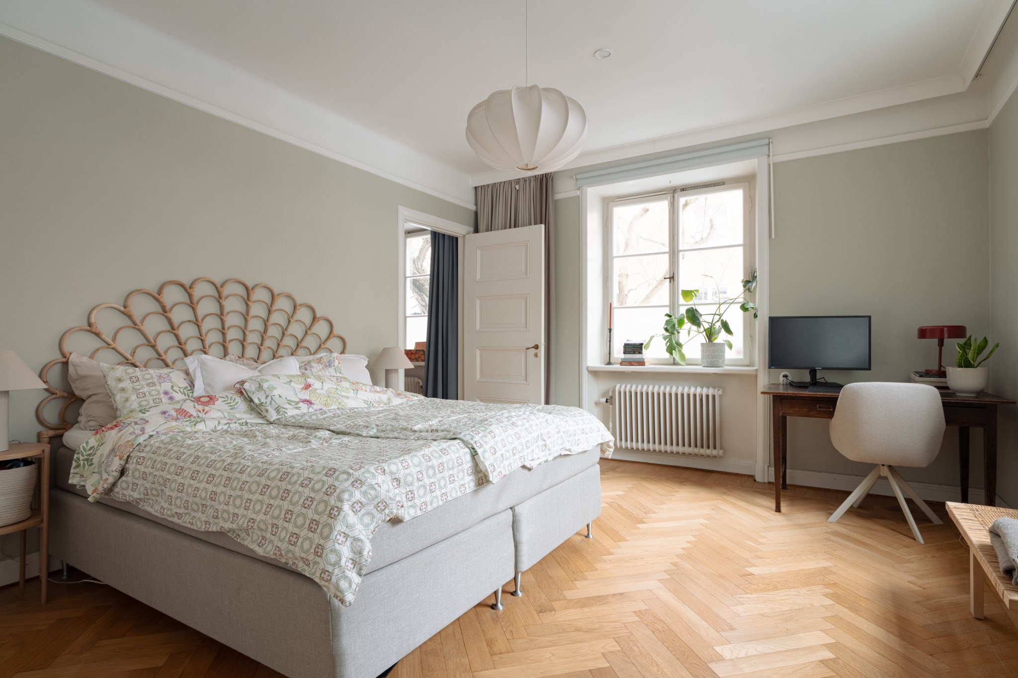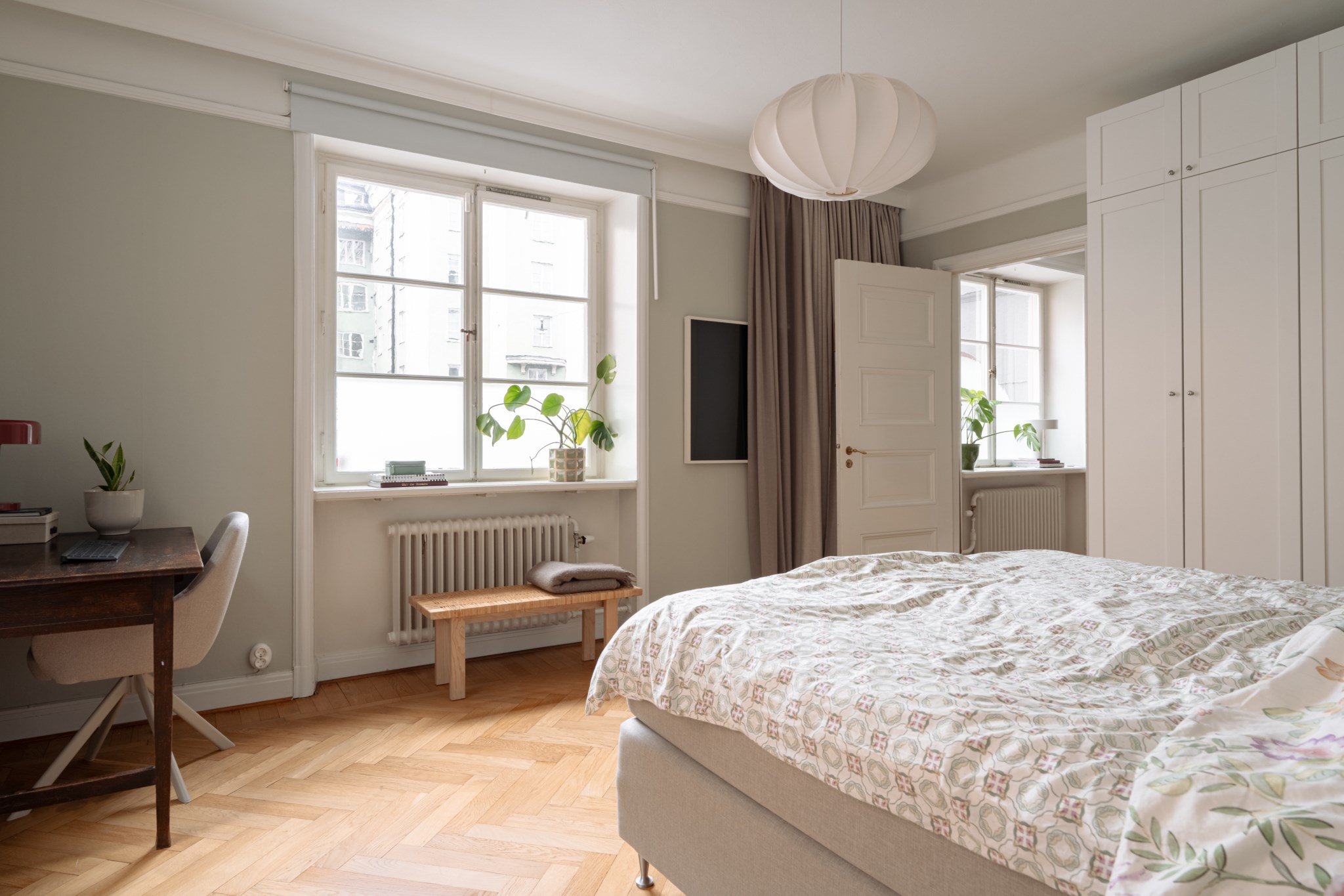 Rogivande sovrum med plats för dubbelsäng och skrivbord. Väggar i vit kulör och ljus fiskbensparkett. Klädförvaring i form av garderober. Fint ljusinsläpp från dubbla fönster med spröjs i olika riktning.