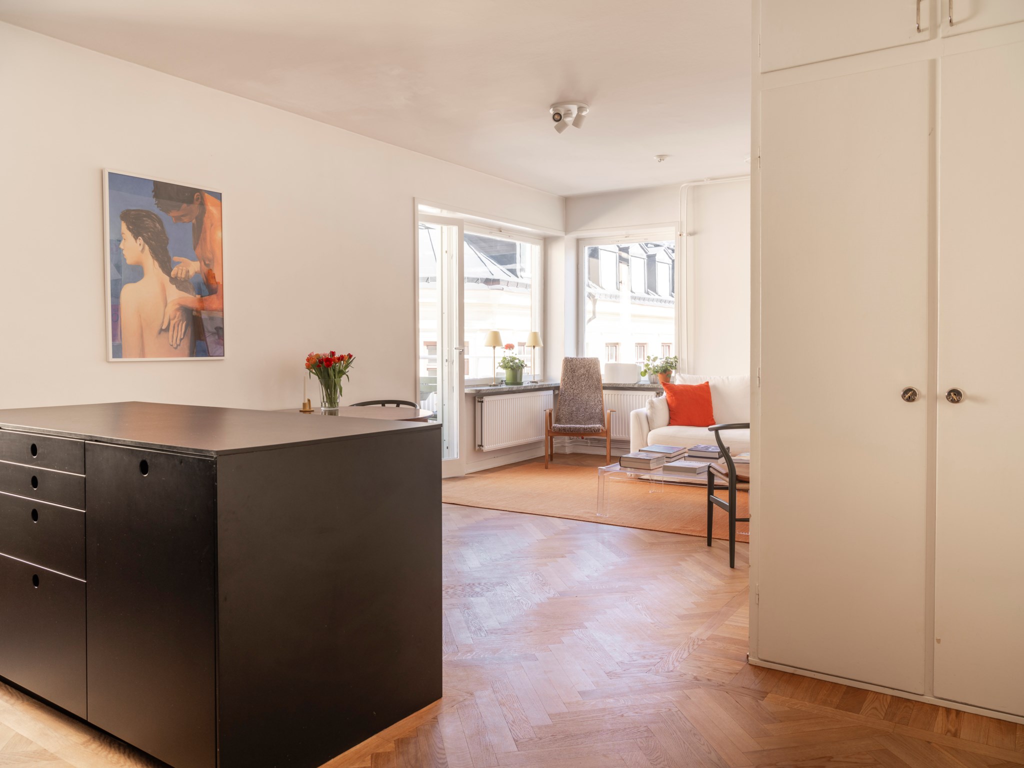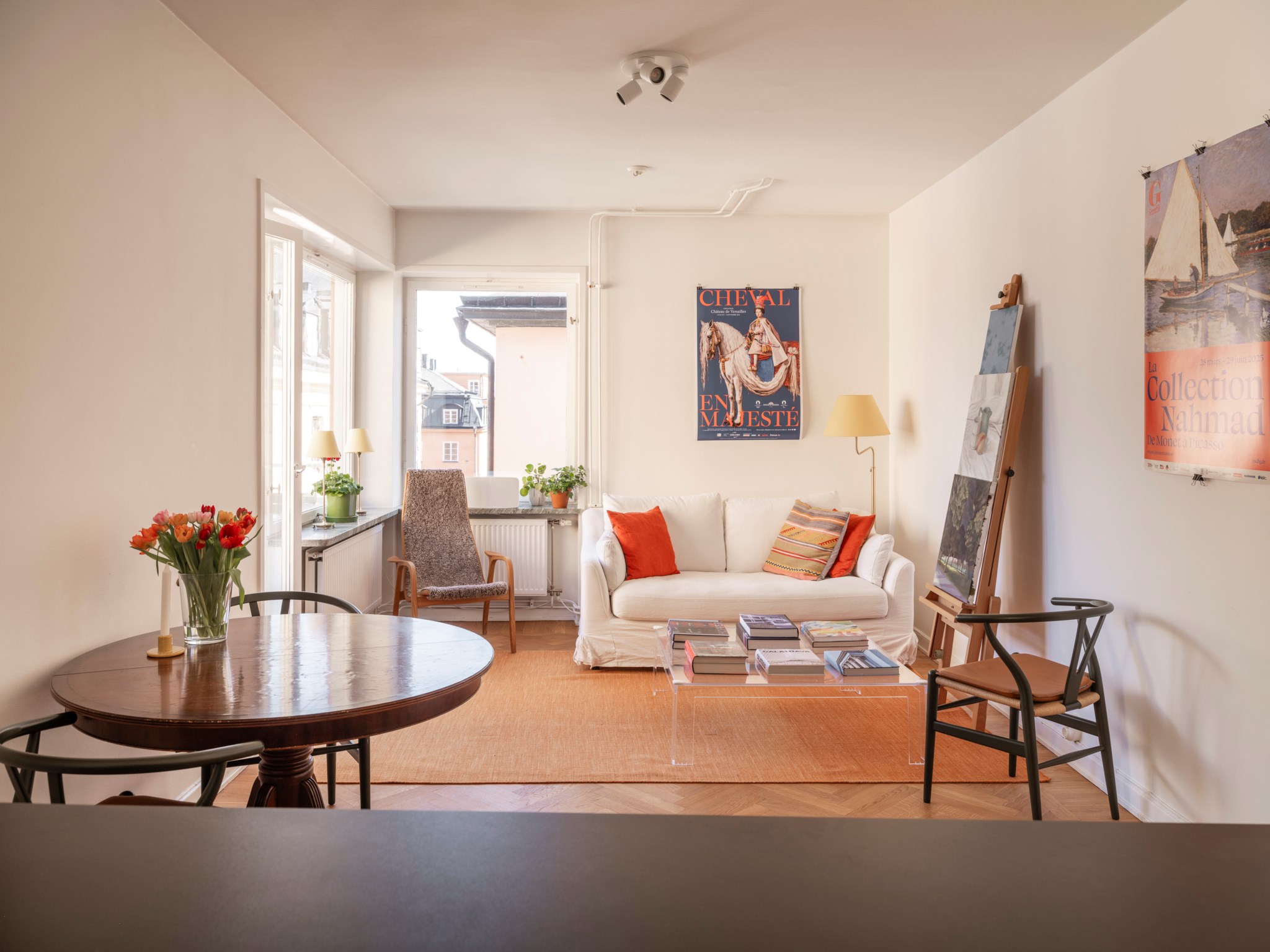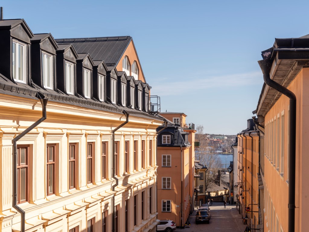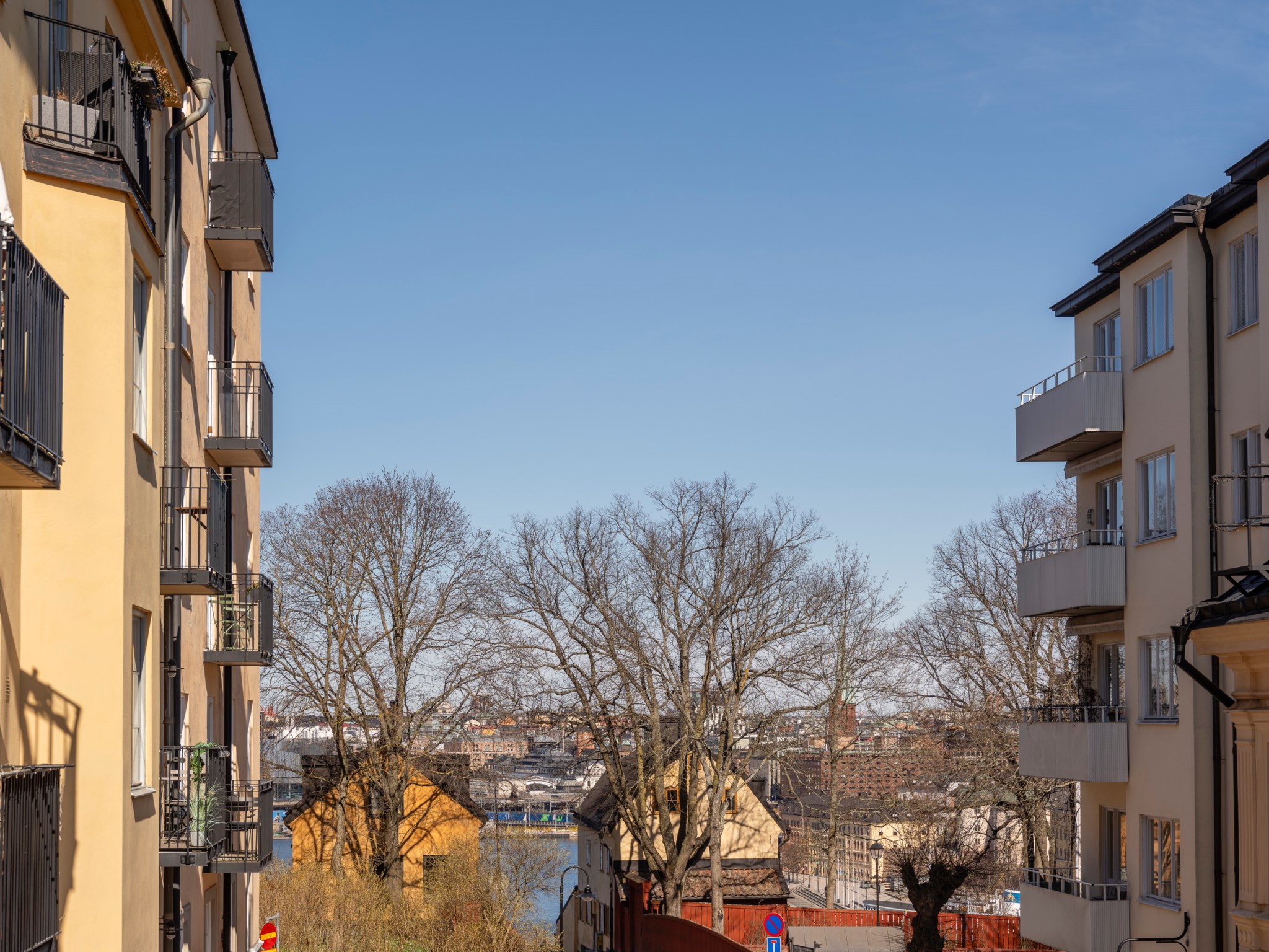 Välkommen till denna smakfulla tvåa i funkisstil med vacker vy från balkongen ut mot Riddarfjärden. Med hörnläge på Mariaberget och generösa fönsterpartier flödar bostaden i ljus. Lägenheten är genomgående renoverad och den tidstypiska funkisprägeln är väl bevarad. Kök och vardagsrum möts i en öppen planlösning i det luftiga hörnrummet med sina fönster och balkong i anslutning.