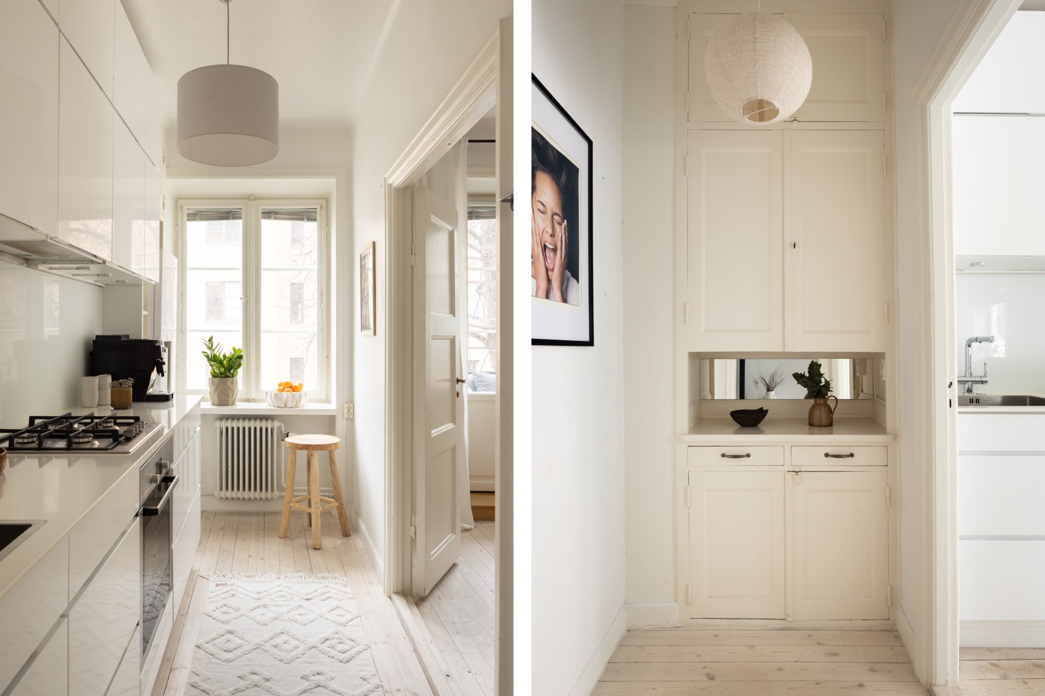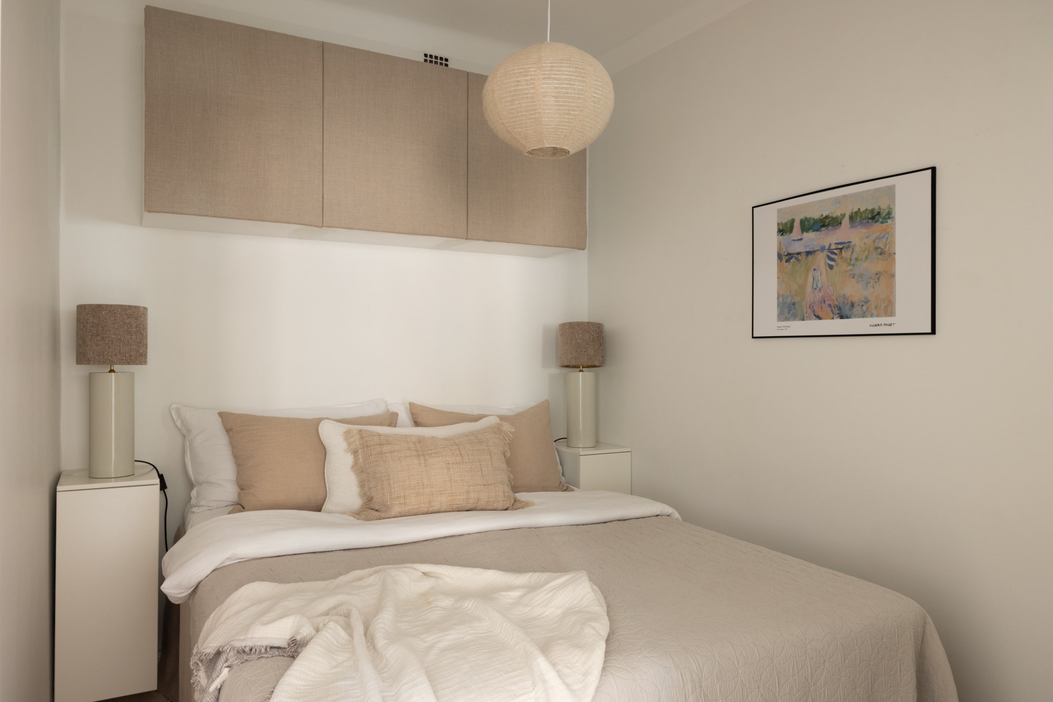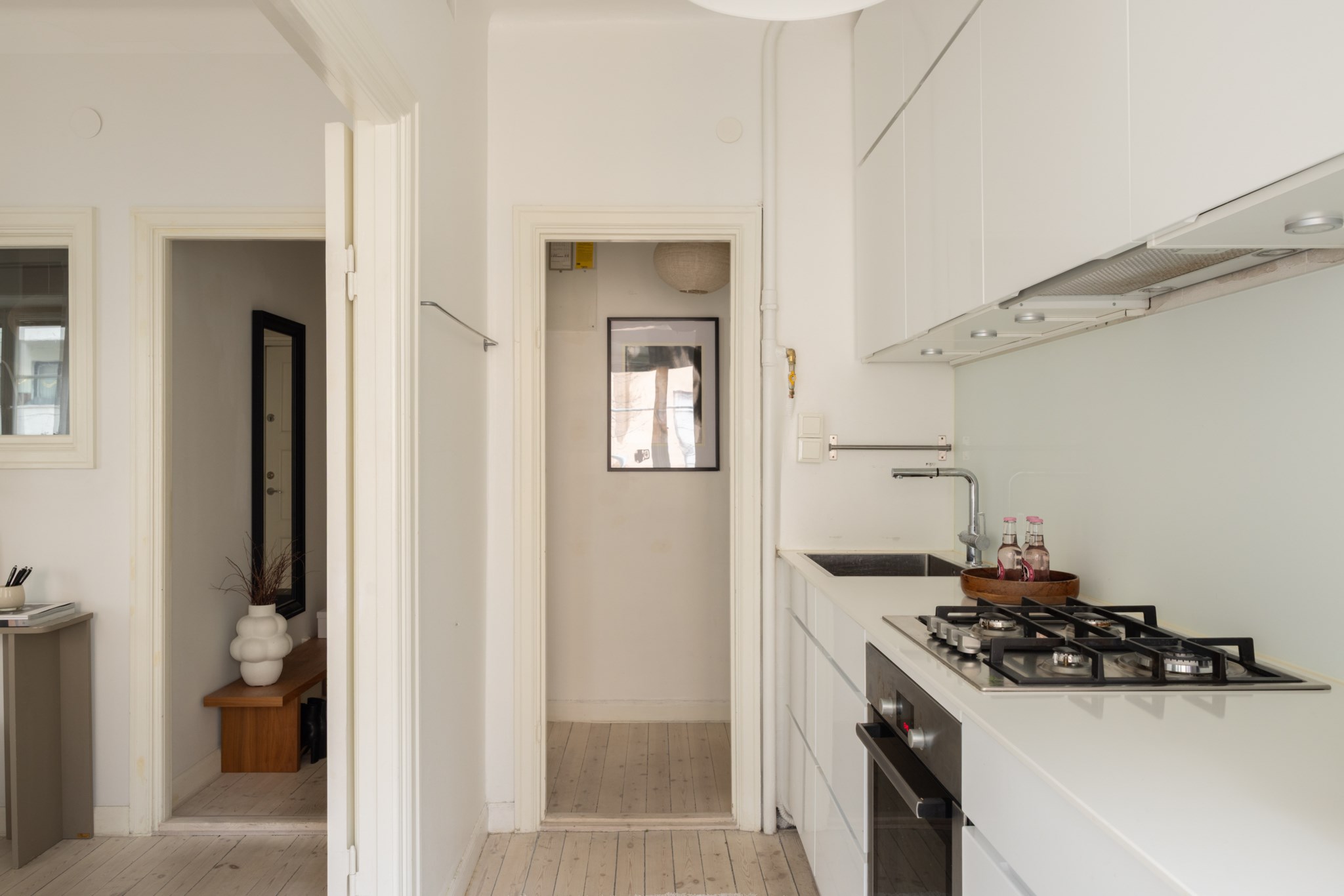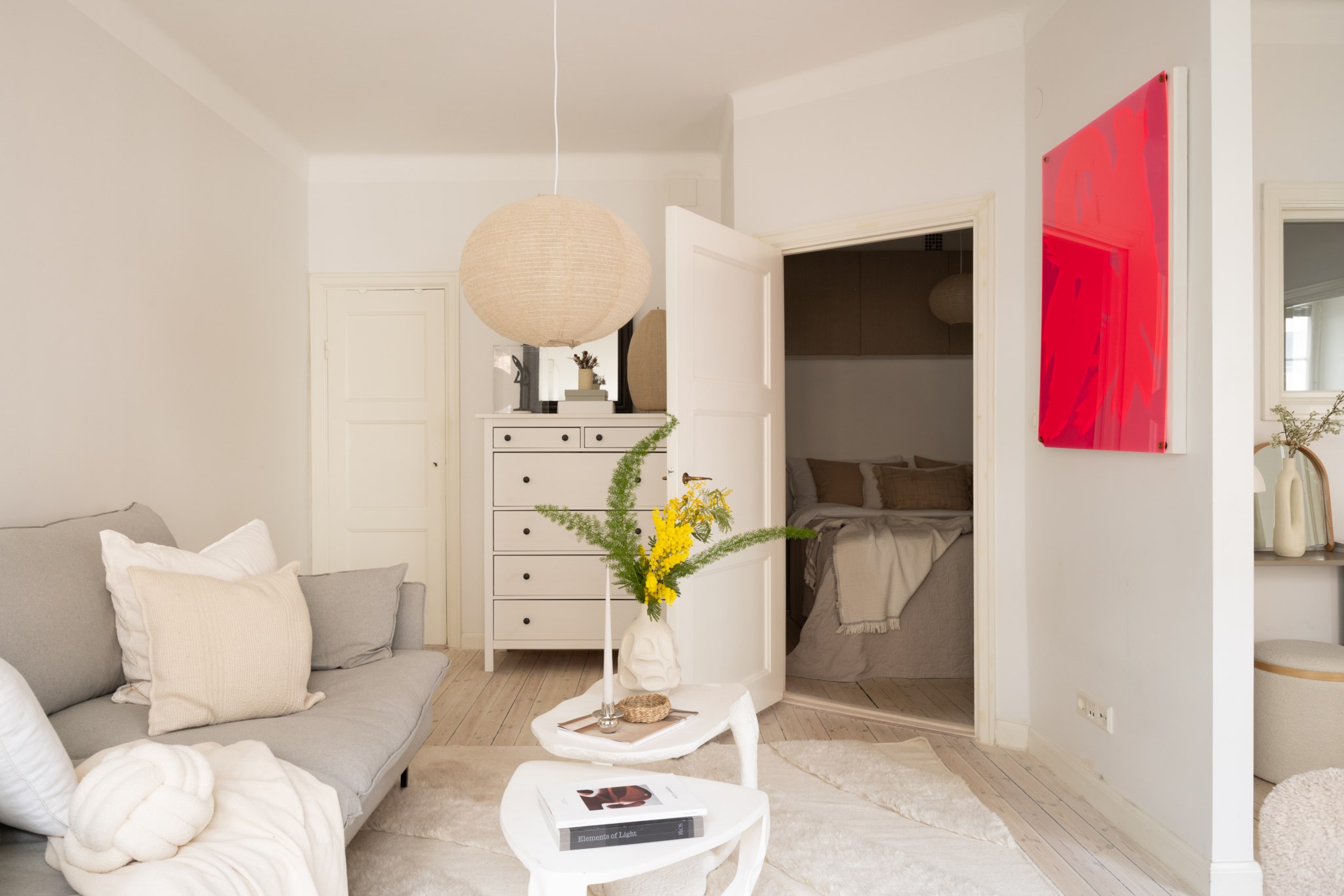 Köket är stilrent och funktionellt med bra arbetsytor och förvaring som gör matlagningen både smidig och inspirerande. Sovrumsdelen är rofyllt beläget och rymmer enkelt en större säng samt förvaring. Badrummet är fräscht och praktiskt utformat. Sammantaget är detta ett hem som kombinerar estetik och funktion på bästa sätt.