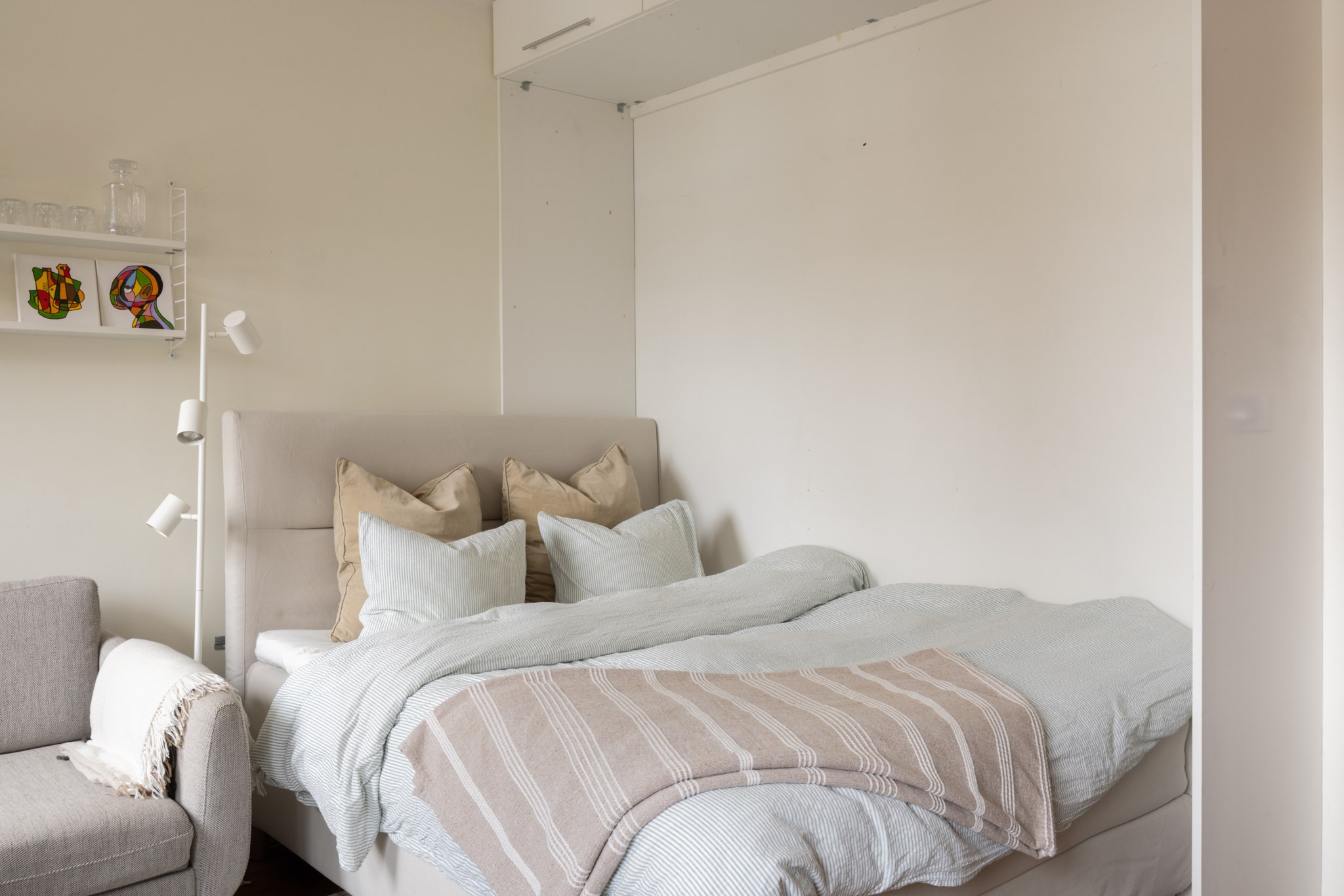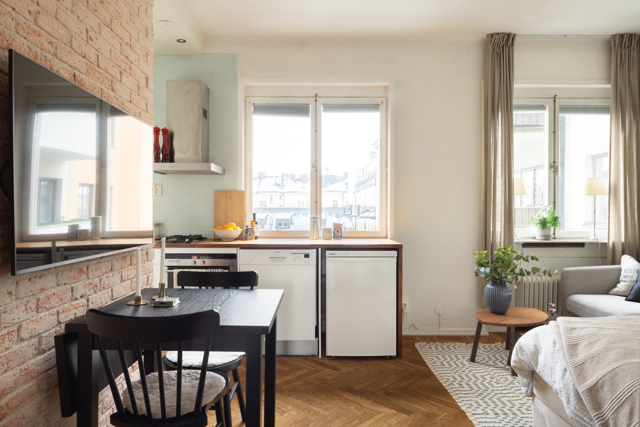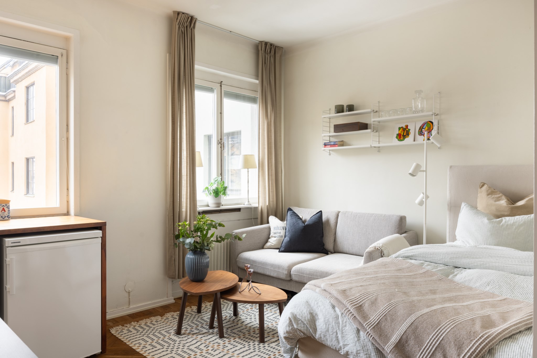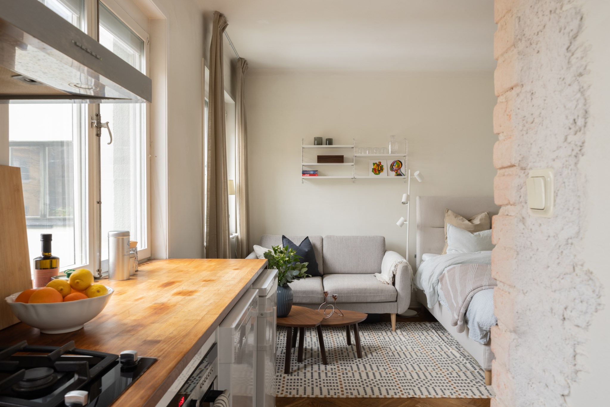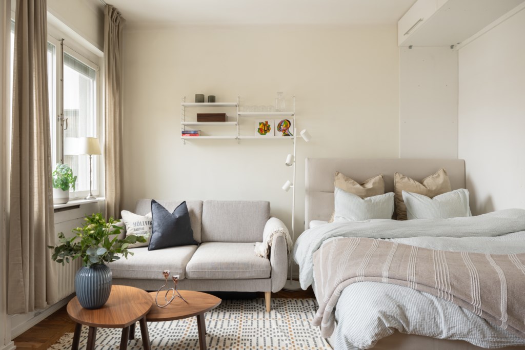 Välplanerat allrum med plats för både säng, soffa och matplats. Stora fönster mot innergården som släpper in rikligt med ljus och ger rummet en luftig känsla. Underbar och fri utsikt över trädtoppar och takåsar. I mitten av rummet finns en tegelvägg, i övrigt är väggarna målade i ljus kulör och golvet är i vacker fiskbensparkett. Längs med en av väggarna finns överskåp för extra förvaring.