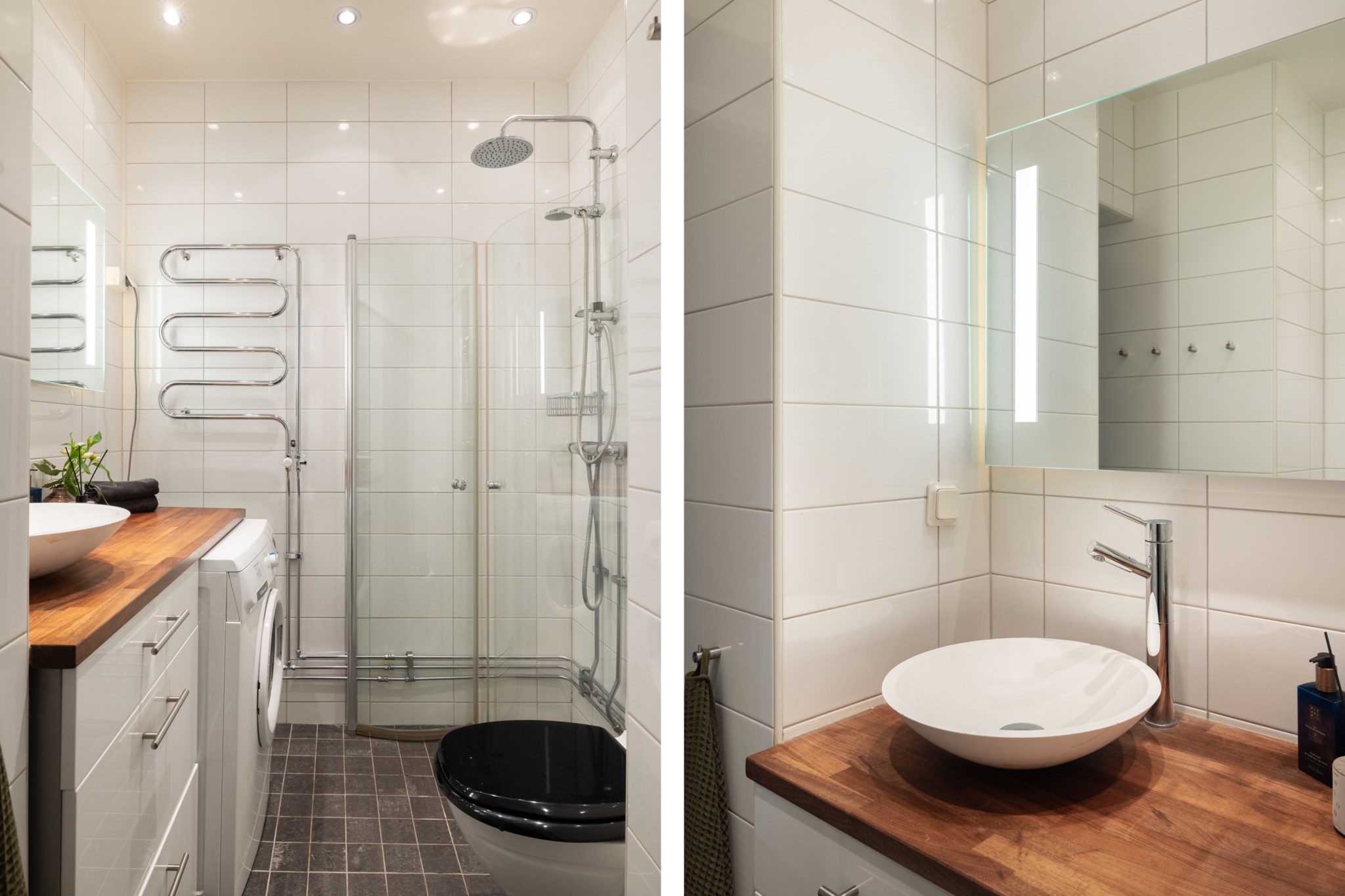 Rymligt badrum med kakel i vitt och klinker i grått. Badrummet är utrustat med WC, handdukstork, handfat ovan kommod, spegelskåp samt dusch med glasvägg. Extra bekvämligheter genom en tvättmaskin.
