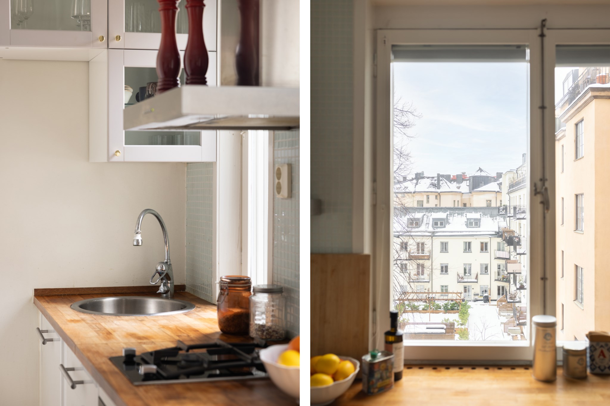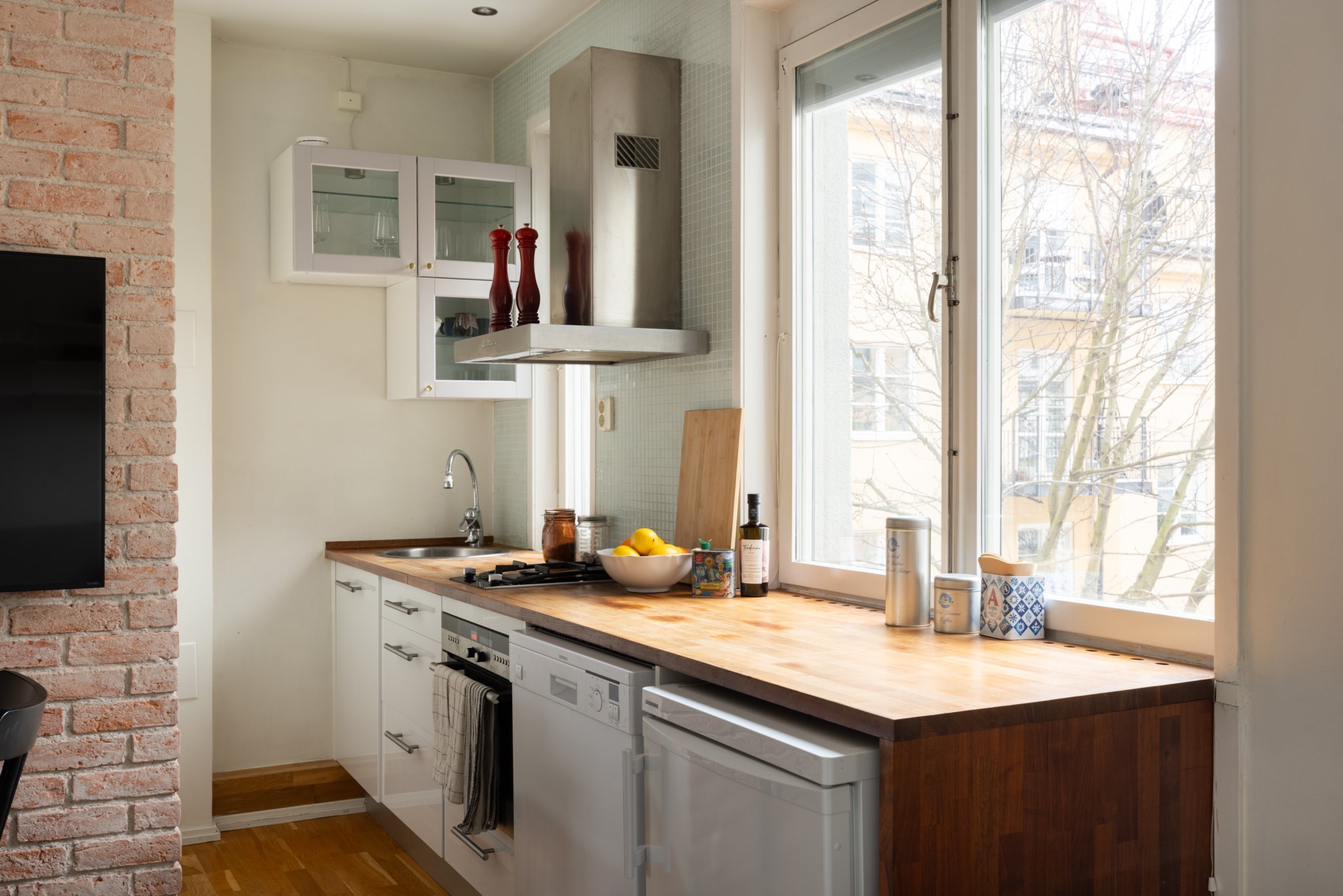 Yteffektivt kök med naturligt ljusinsläpp från fönster. Över-och underskåpen har vita skåpsluckor tillsammans med en bänkskiva i ek. Målade väggar i ljus kulör. Köket är utrustat med kyl som har frysfack, diskmaskin, fläkt, gasspis för två plattor och kombinerad mikro/ugn.