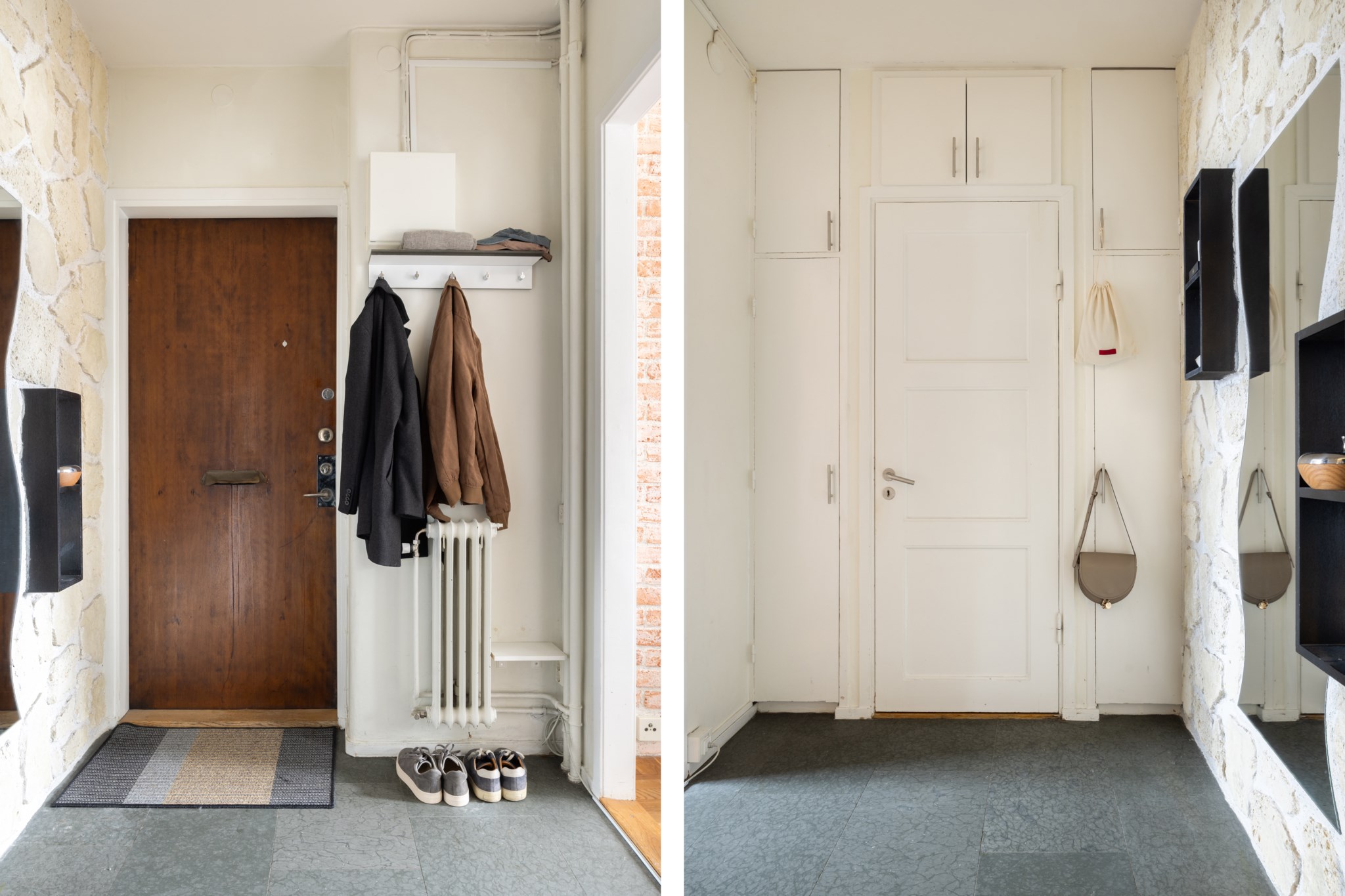 Ljus hall med plats för avhängning av ytterkläder och skor. Gott om förvaring finns i inbyggda garderober med överskåp. Praktiskt klinkergolv i hall.