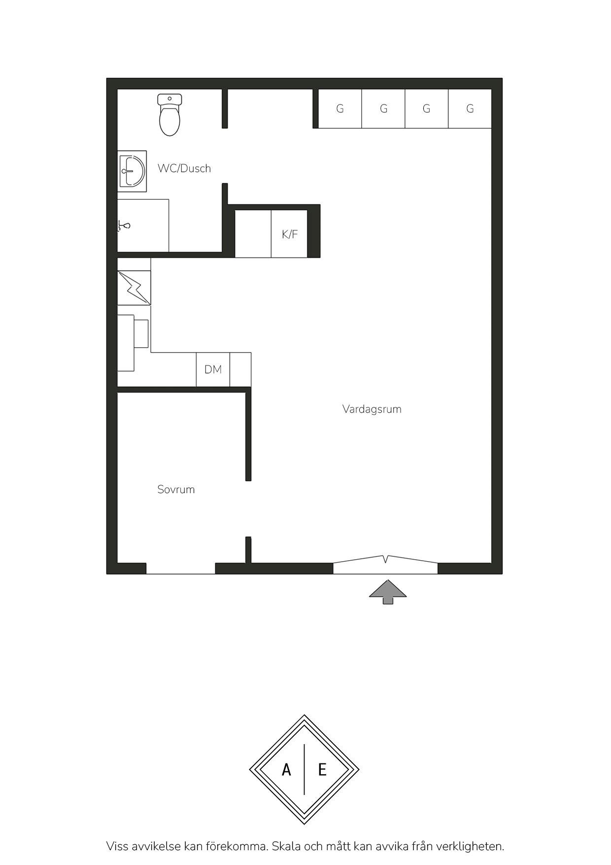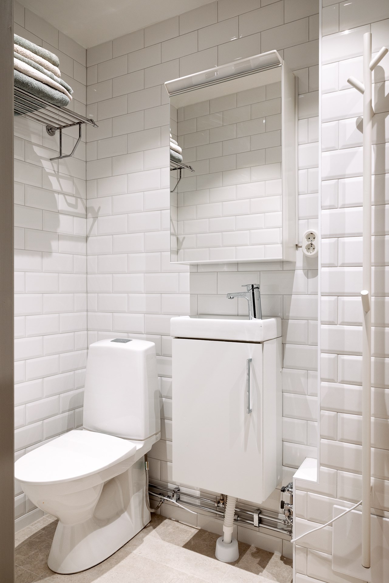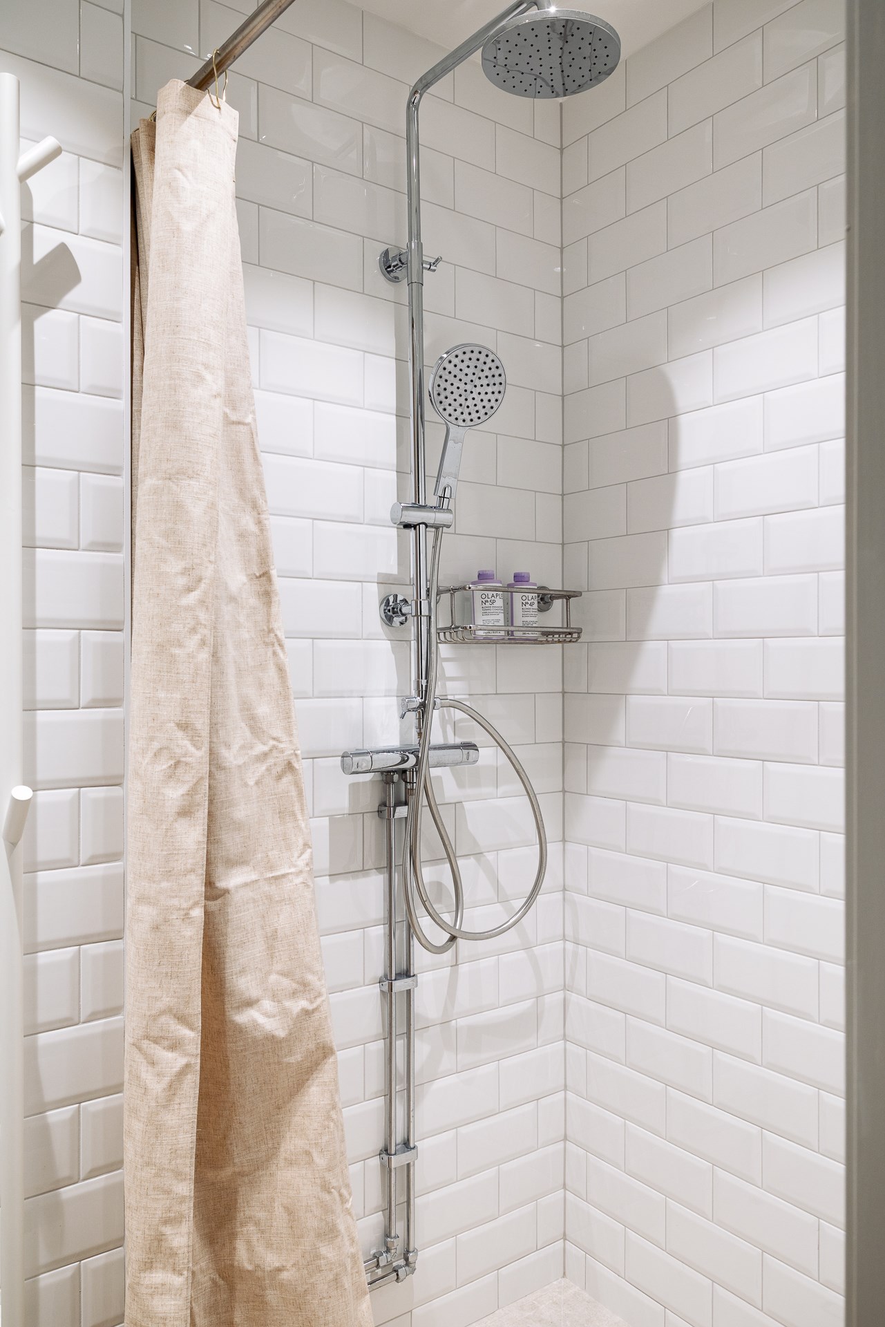 Köket är nyrenoverat 2025 och välplanerat med generösa arbetsytor, överskåp och god förvaring. Utrustningen består av gasspis, ugn, diskmaskin och köksfläkt, och det klassiska vita kaklet ovan bänkskivan ger ett tidlöst uttryck. Sovrummet är avskilt och rofyllt med plats för dubbelsäng och förvaring. Badrummet, även det renoverat 2025, är helkaklat och fräscht med WC, handfat med kommod, spegelskåp samt dusch med takdusch och golvvärme för extra vardagskomfort.