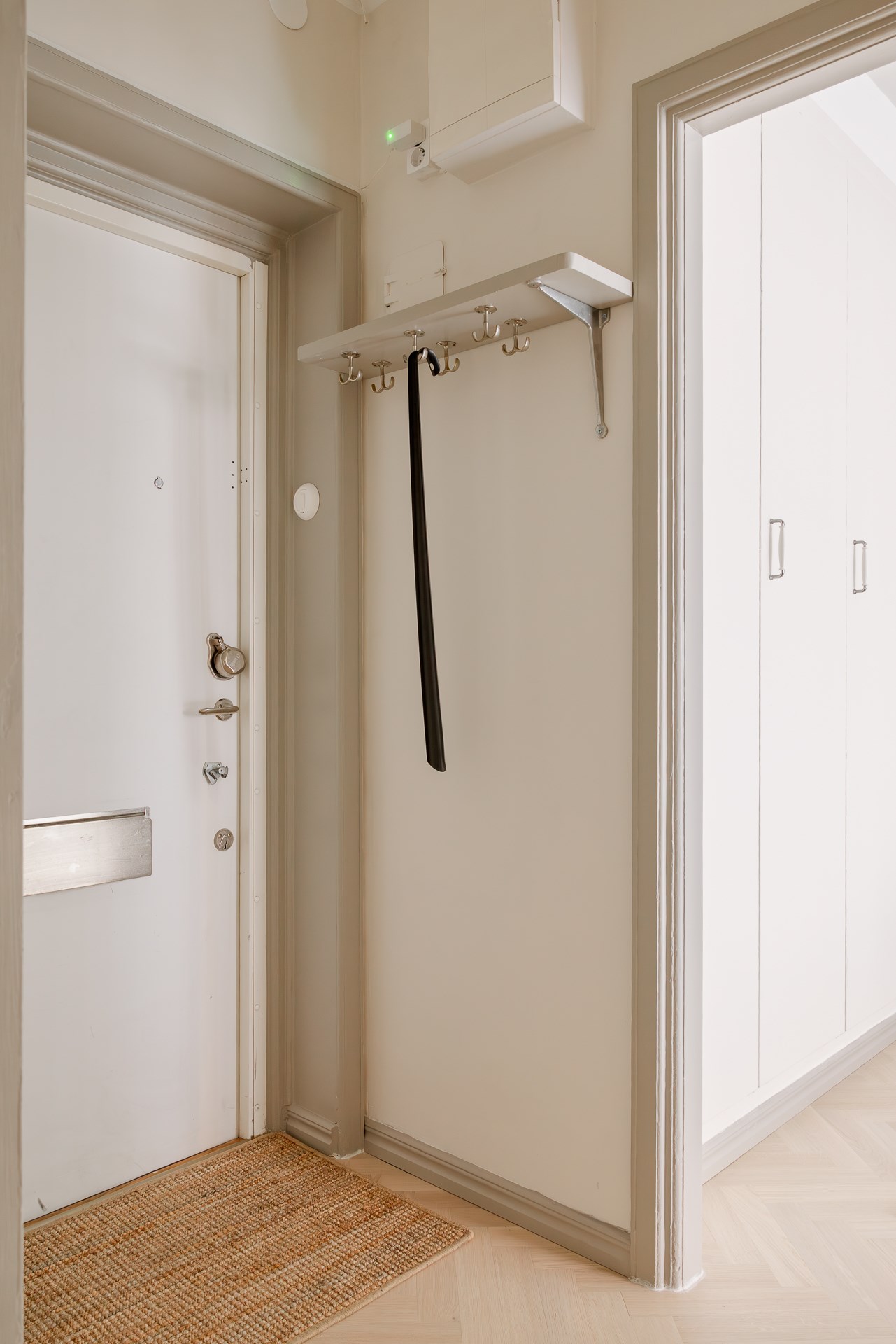 Välkomnande hall med säkerhetsdörr och goda avhängningsmöjligheter direkt innanför entrén. Praktisk förvaring skapar en ordnad och funktionell hall med plats för ytterkläder och skor.