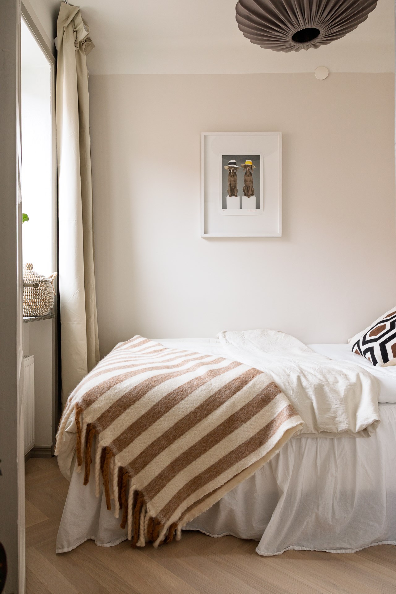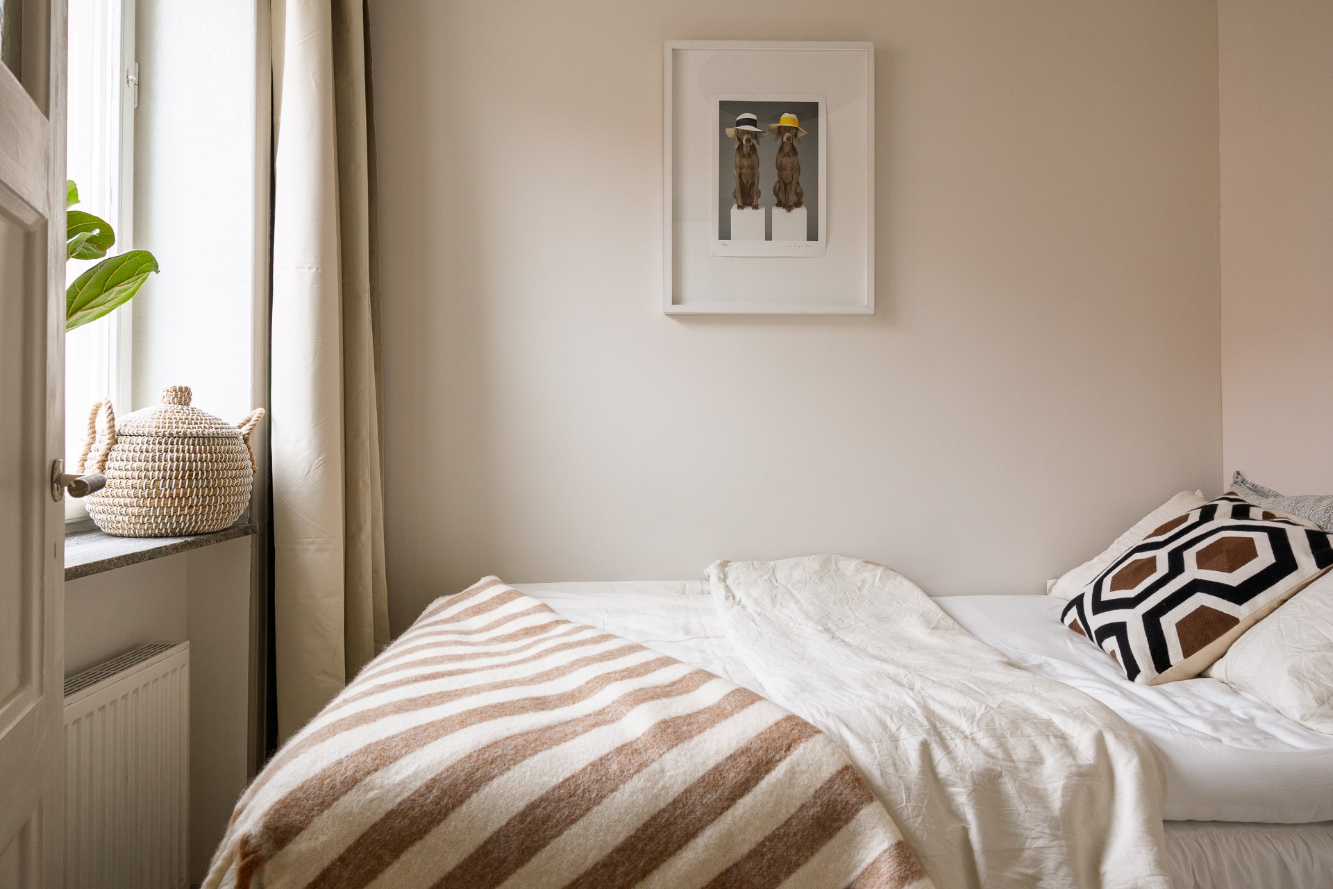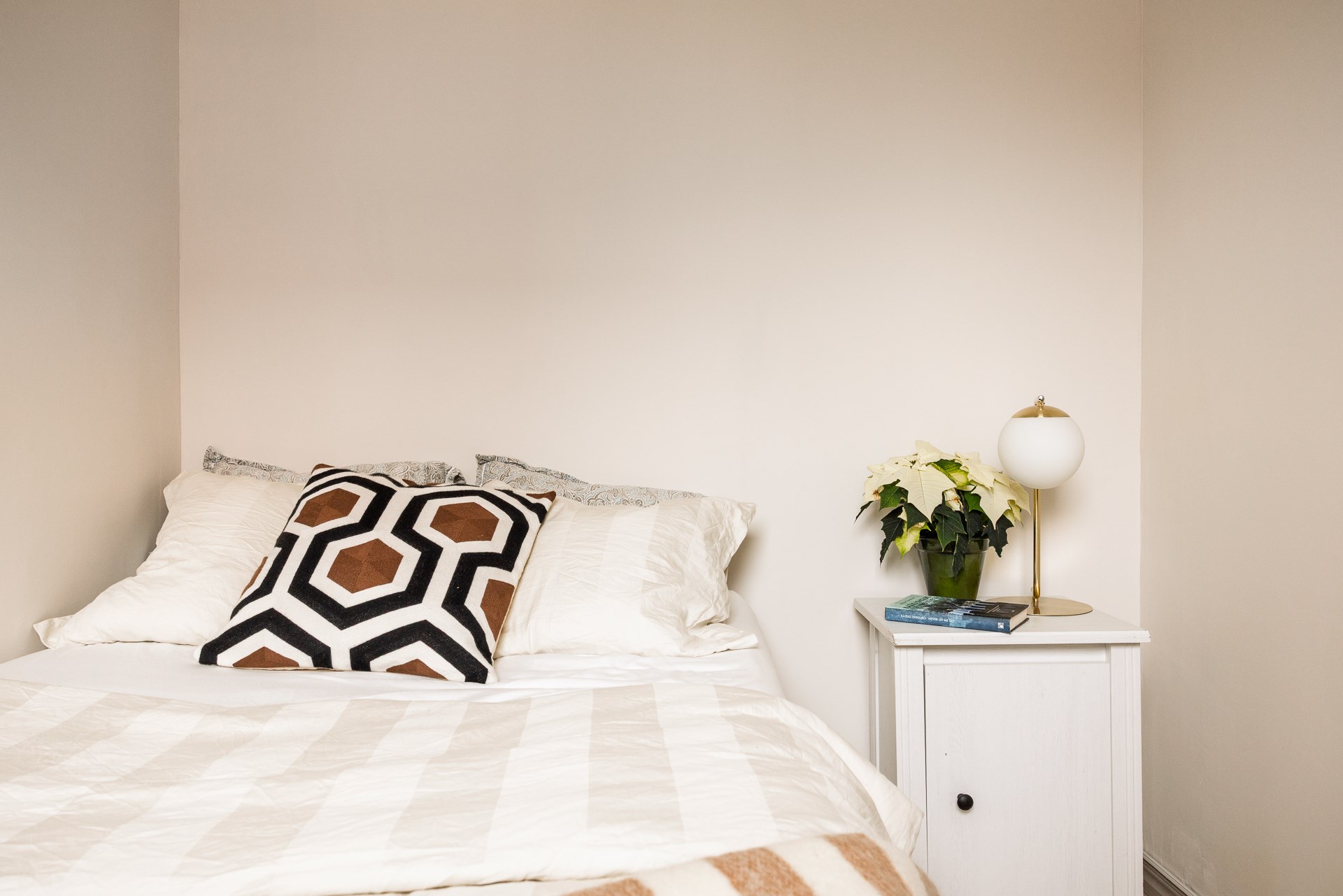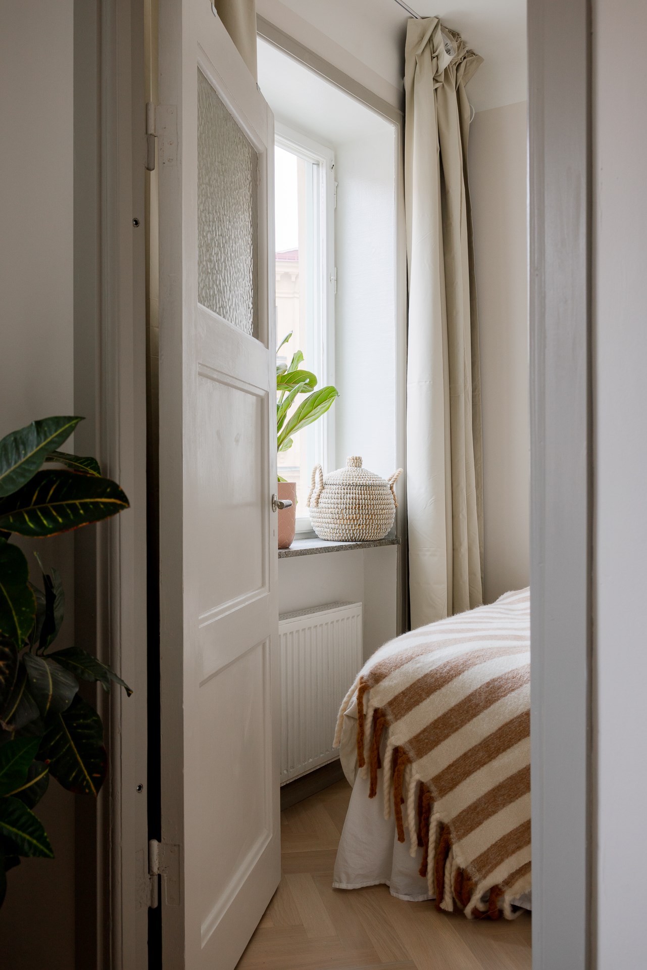 Avskilt sovrum med plats för dubbelsäng och förvaring. Rummets placering ger en lugn och rofylld känsla, perfekt för avkoppling.
