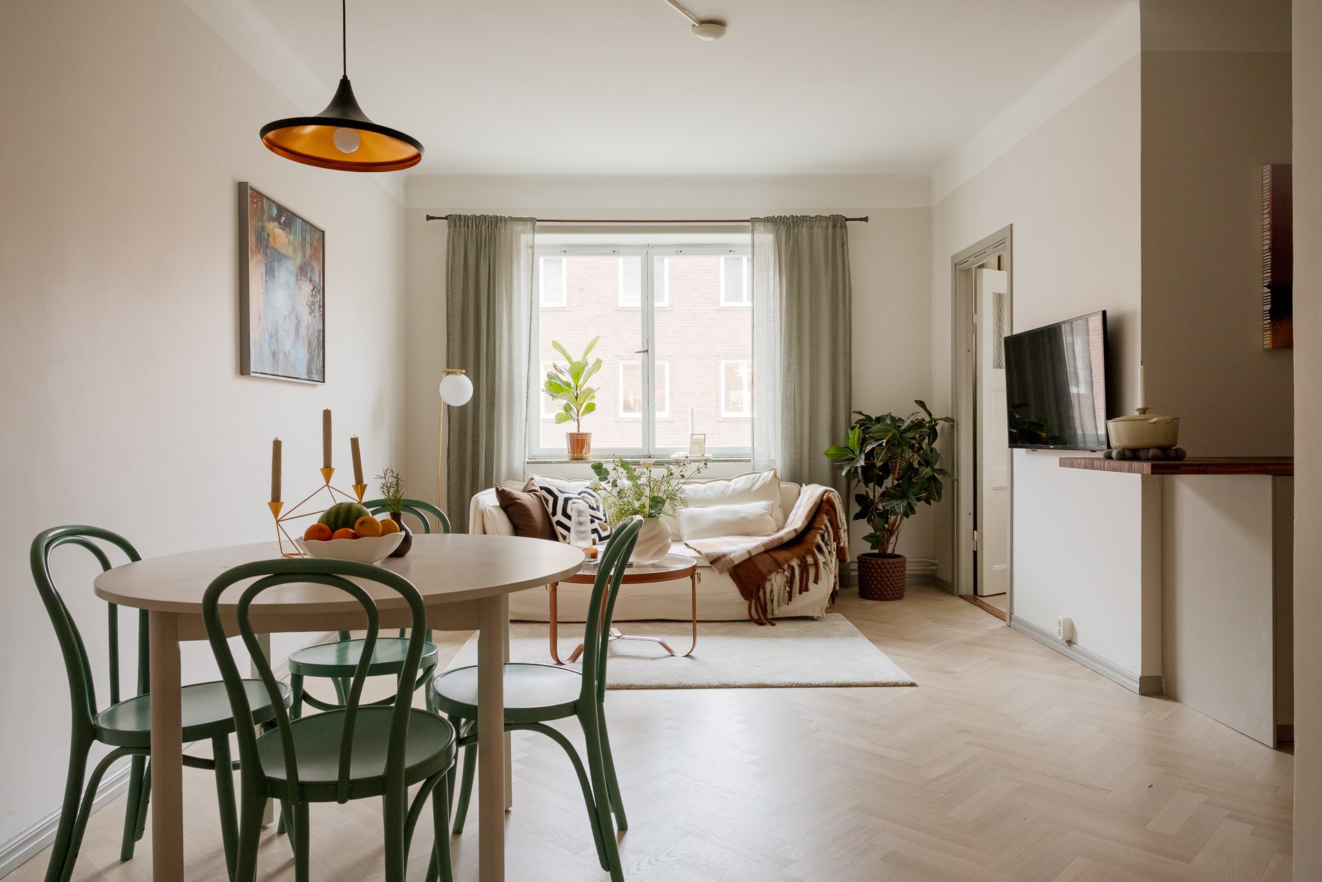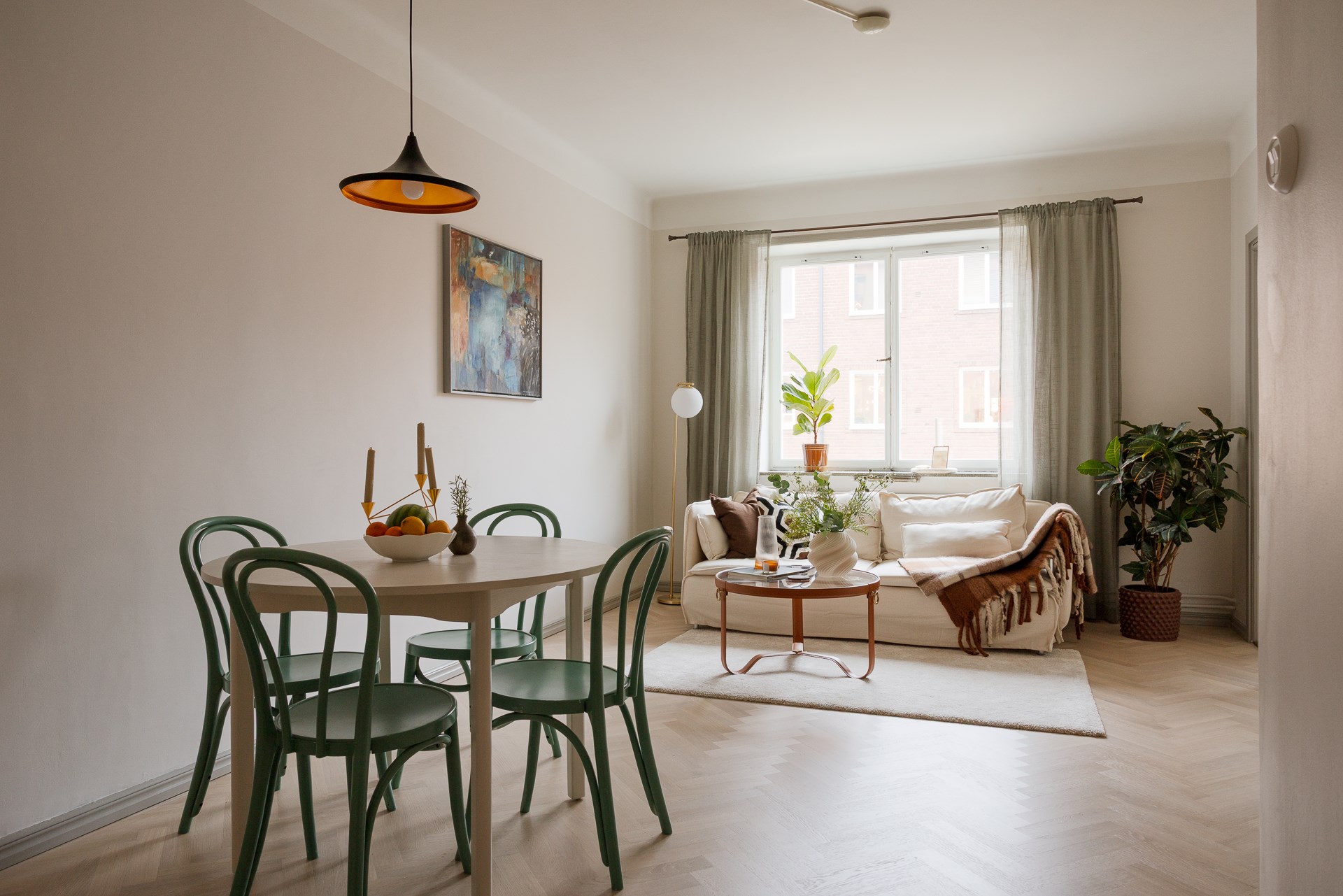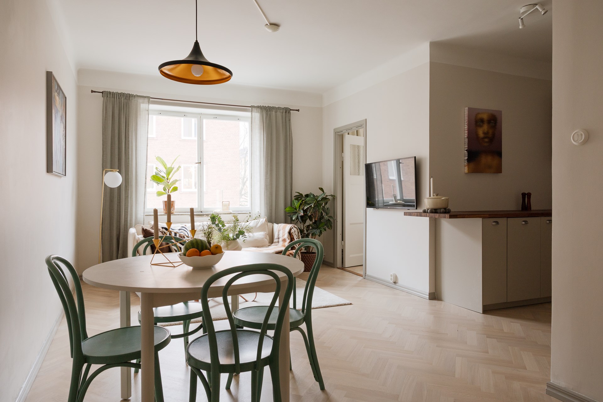 Bostaden är topprenoverad med påkostade materialval där klassisk charm möter modern komfort. Den genomtänkta och sociala planlösningen låter kök och vardagsrum samspela naturligt och skapa öppna, inbjudande sällskapsytor med plats för både soffgrupp och matbord. Genomgående nylagd fiskbensparkett och platsbyggd förvaring förstärker helhetsintrycket och bidrar till en stilren och funktionell bostad.