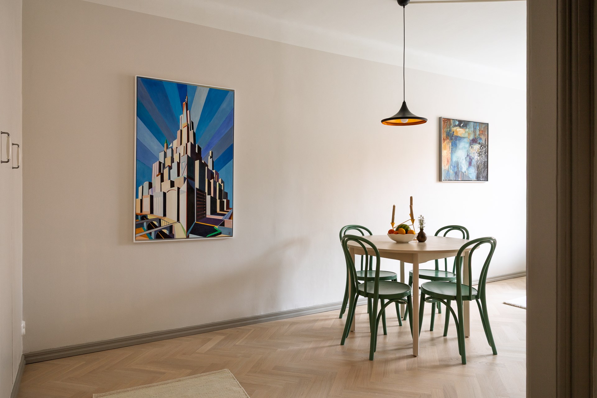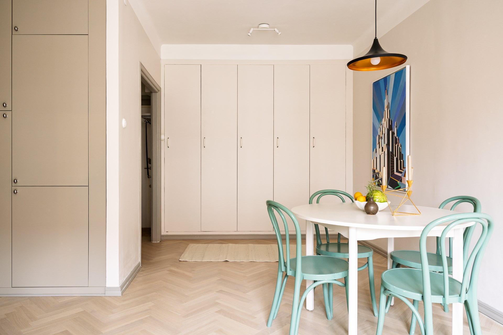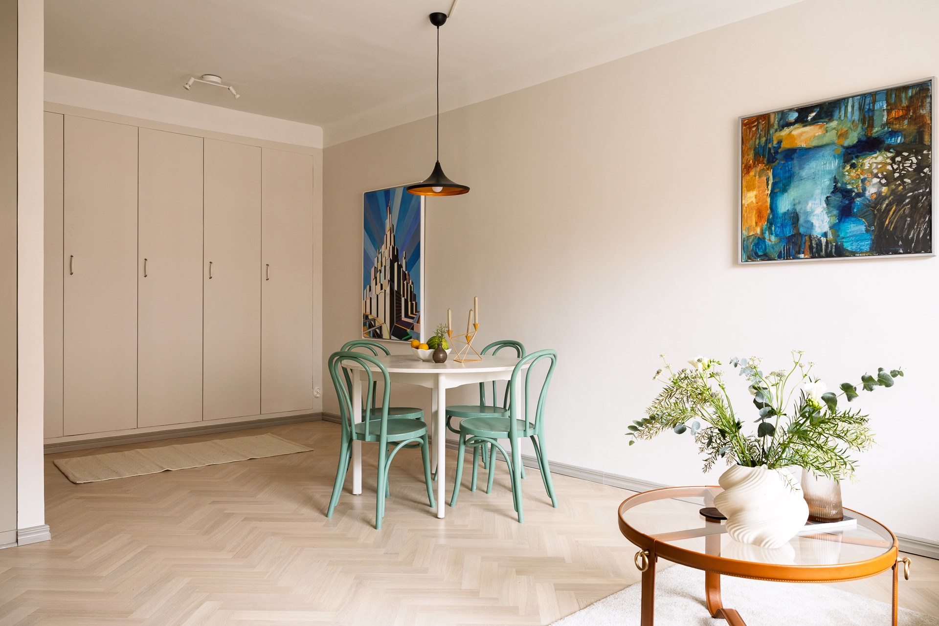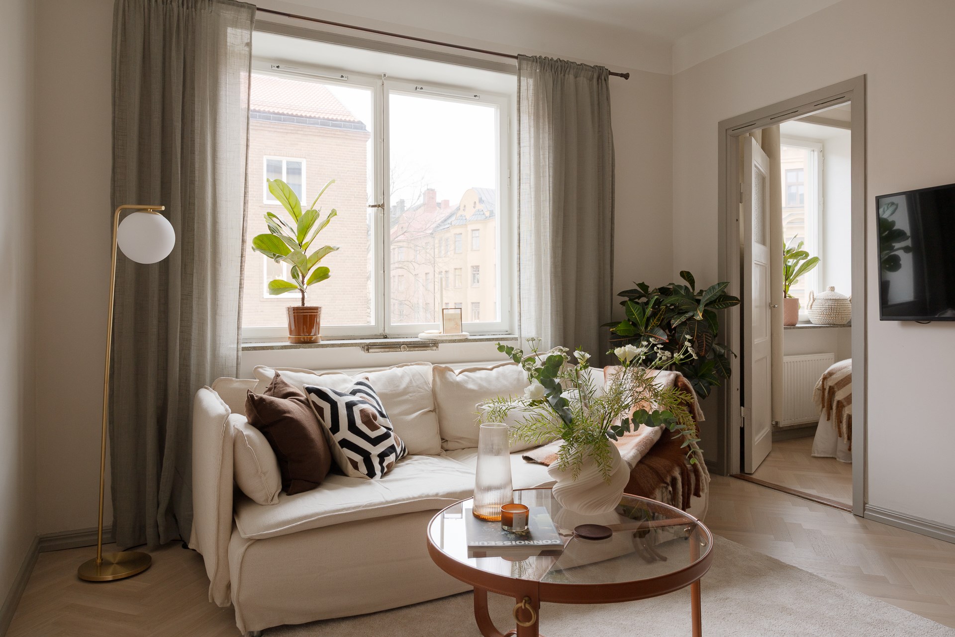Bostaden är topprenoverad med påkostade materialval där klassisk charm möter modern komfort. Den genomtänkta och sociala planlösningen låter kök och vardagsrum samspela naturligt och skapa öppna, inbjudande sällskapsytor med plats för både soffgrupp och matbord. Genomgående nylagd fiskbensparkett och platsbyggd förvaring förstärker helhetsintrycket och bidrar till en stilren och funktionell bostad.