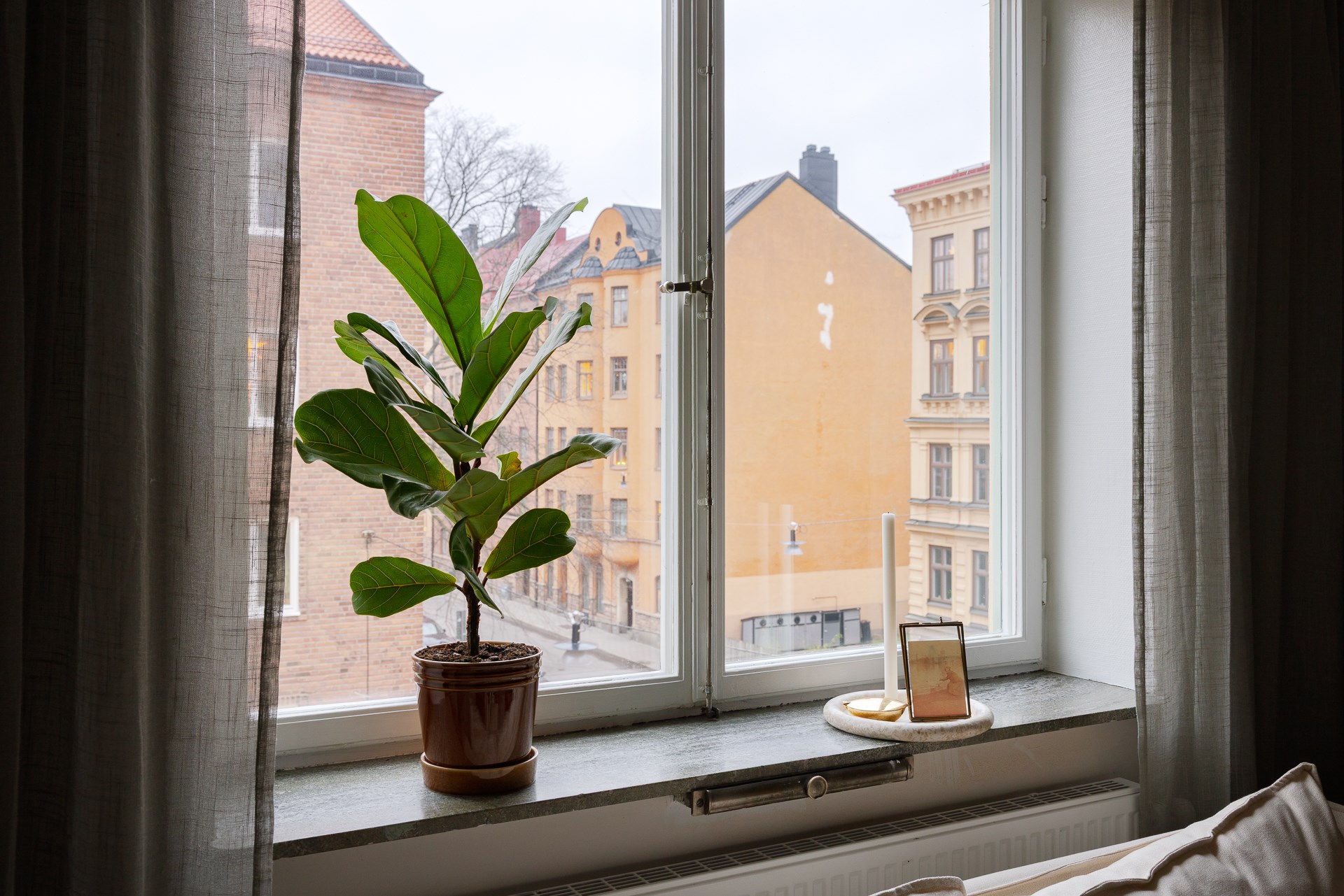 Detta är en 1930-talspärla med högt läge, där tidstypiska detaljer såsom stora fönster med spanjoletter och vackra fönsterbänkar i marmor ger bostaden en genuin och charmfull karaktär. Det höga läget bidrar till ett generöst ljusinsläpp och en luftig känsla genom hela hemmet.