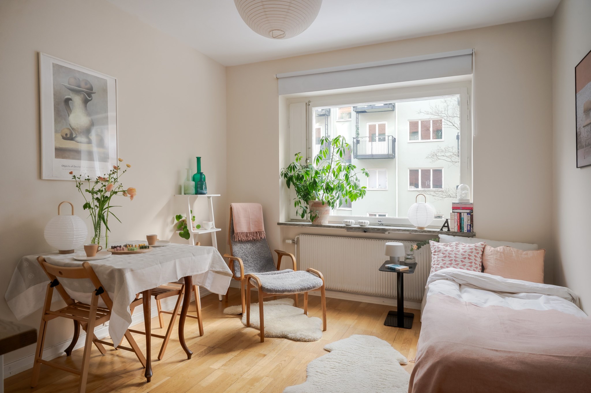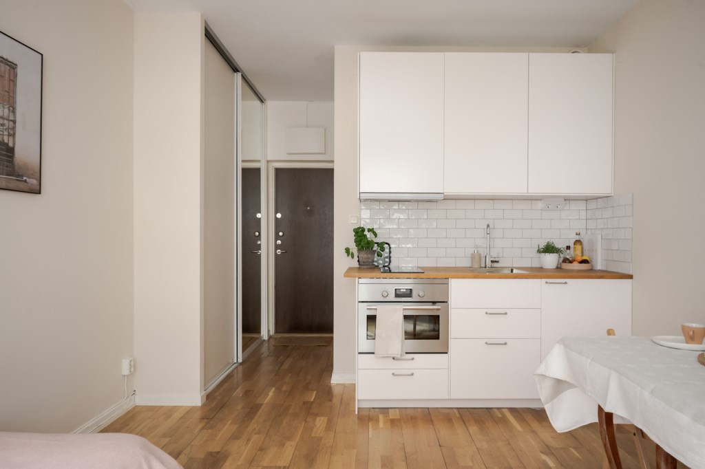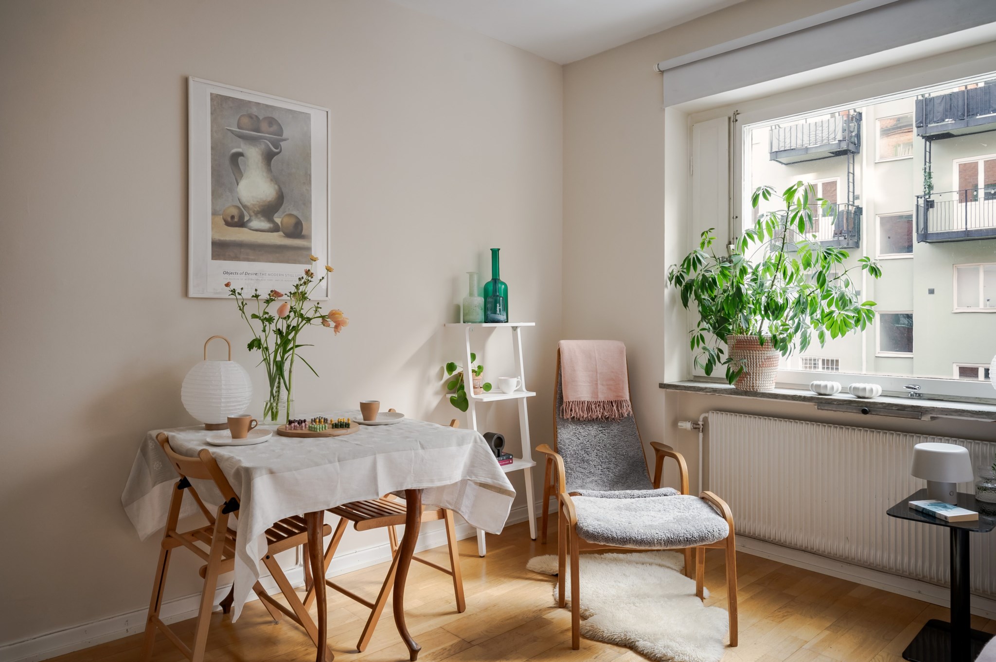 Här bor ni med stilrent & modernt kök, helkaklat badrum samt ett lättmöblerat allrum med ett stort fönster med soligt läge som vetter mot innergården.