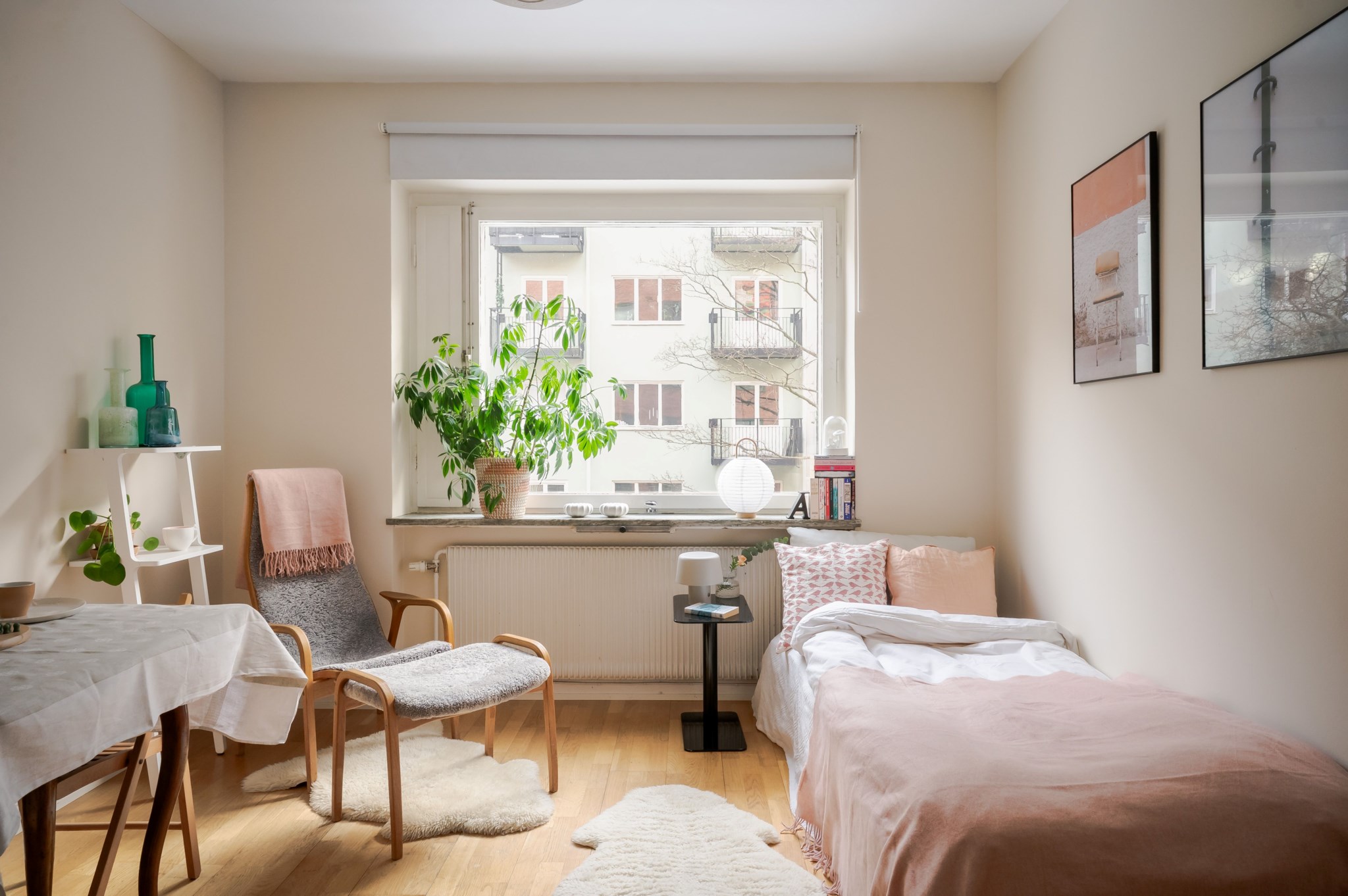 Ljust och trivsamt allrum med goda möjligheter att möblera med säng, matgrupp och annan personlig inredning. Ett stort fönsterparti ger rummet ett generöst och naturligt ljusinsläpp. Ljusmålade ytskikt och parkettgolv.