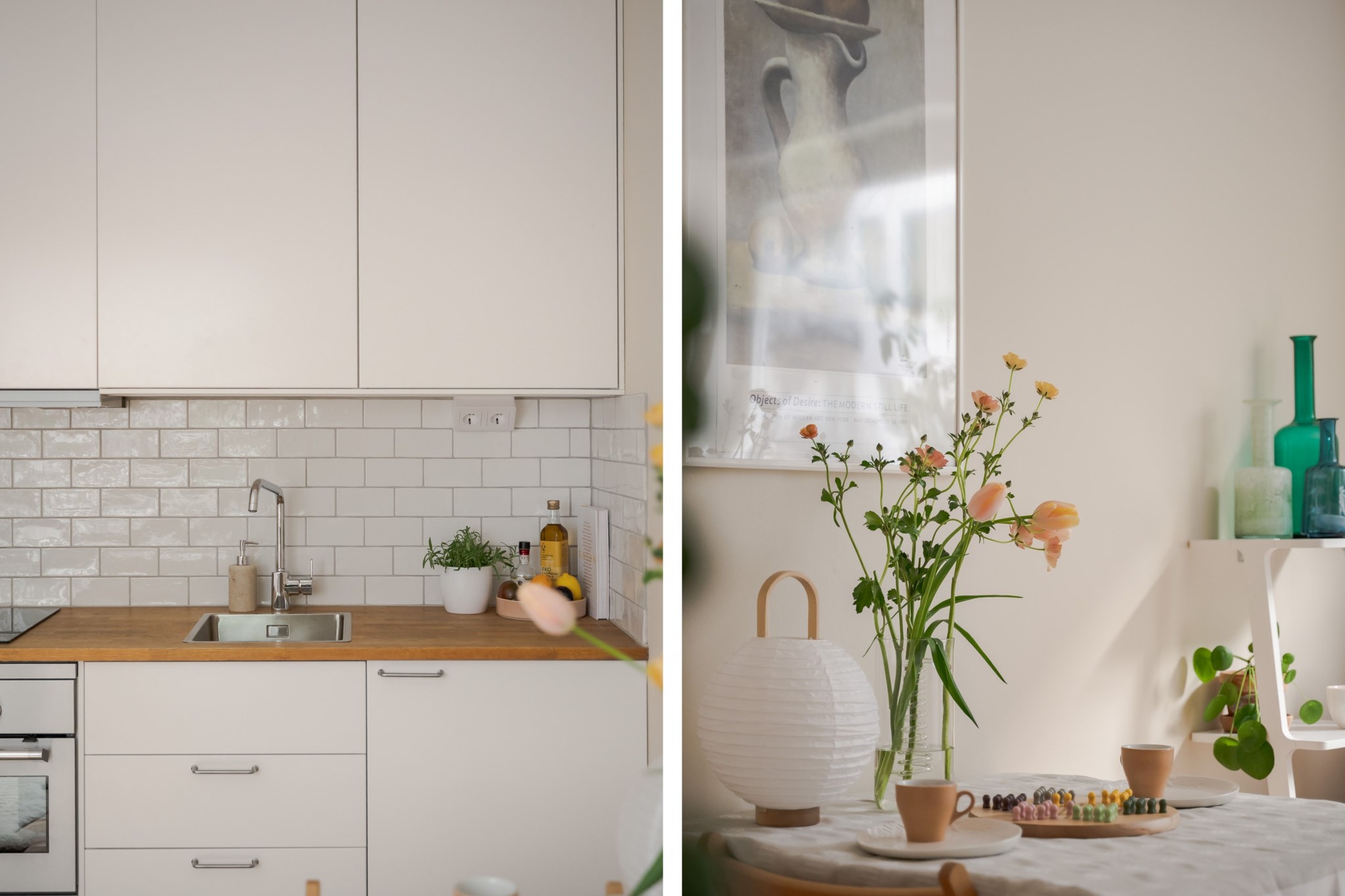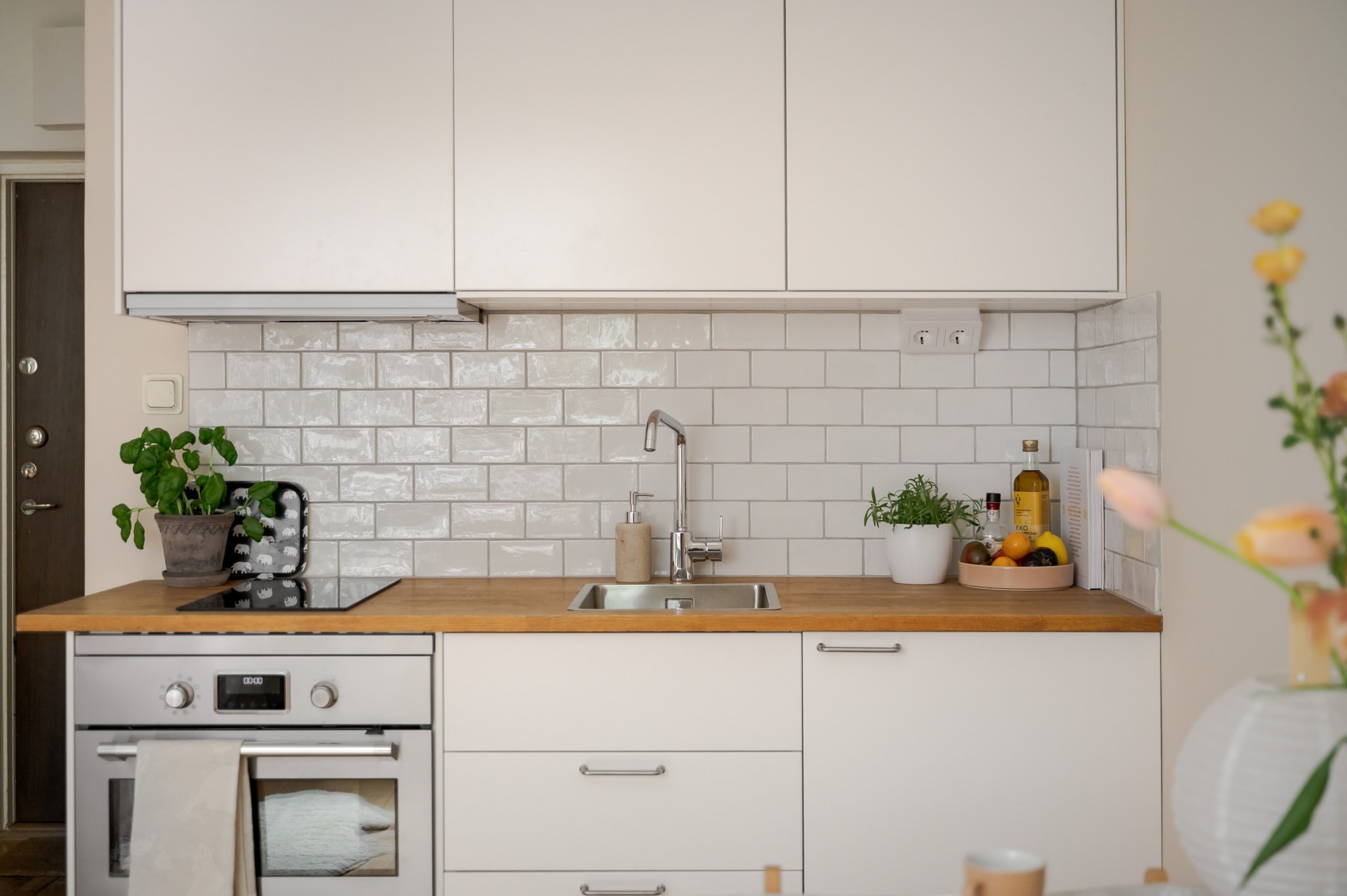 Klassiskt kök med ljusa, släta skåpsfronter, vit kaklad väggpanel och bänkskiva i trä. Kökets maskinella utrustning består av kyl, spishäll, fläkt och ugn. Ljusmålade ytskikt och parkettgolv.