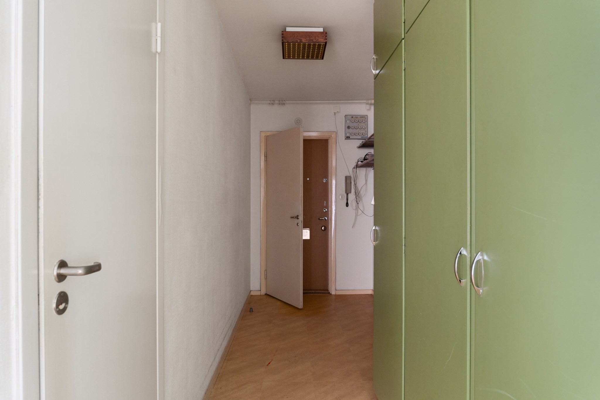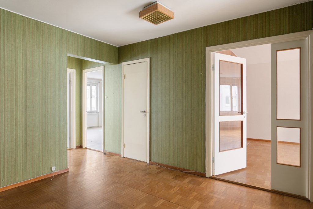 Rymlig inre hall med parkettgolv och tapetserade väggar i grön ton. Här finns plats för exempelvis förvaring eller mindre möblering. Den inre hallen knyter samman bostadens rum och bidrar till en luftig och öppen känsla.