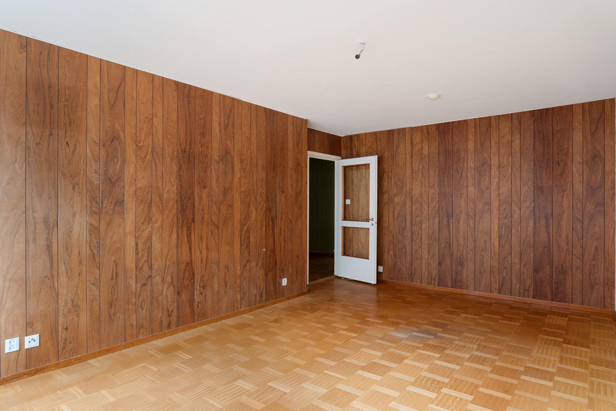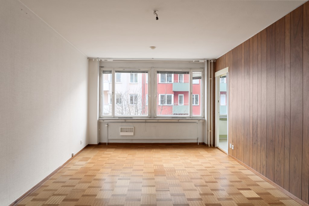Rymligt vardagsrum med generöst ljusinsläpp från stort fönsterparti. Parkettgolv och en fondvägg i trä ger rummet karaktär. Här finns gott om plats för både soffgrupp och matsalsmöbel. Rummet nås via dubbeldörrar och har även en öppning mot köket.