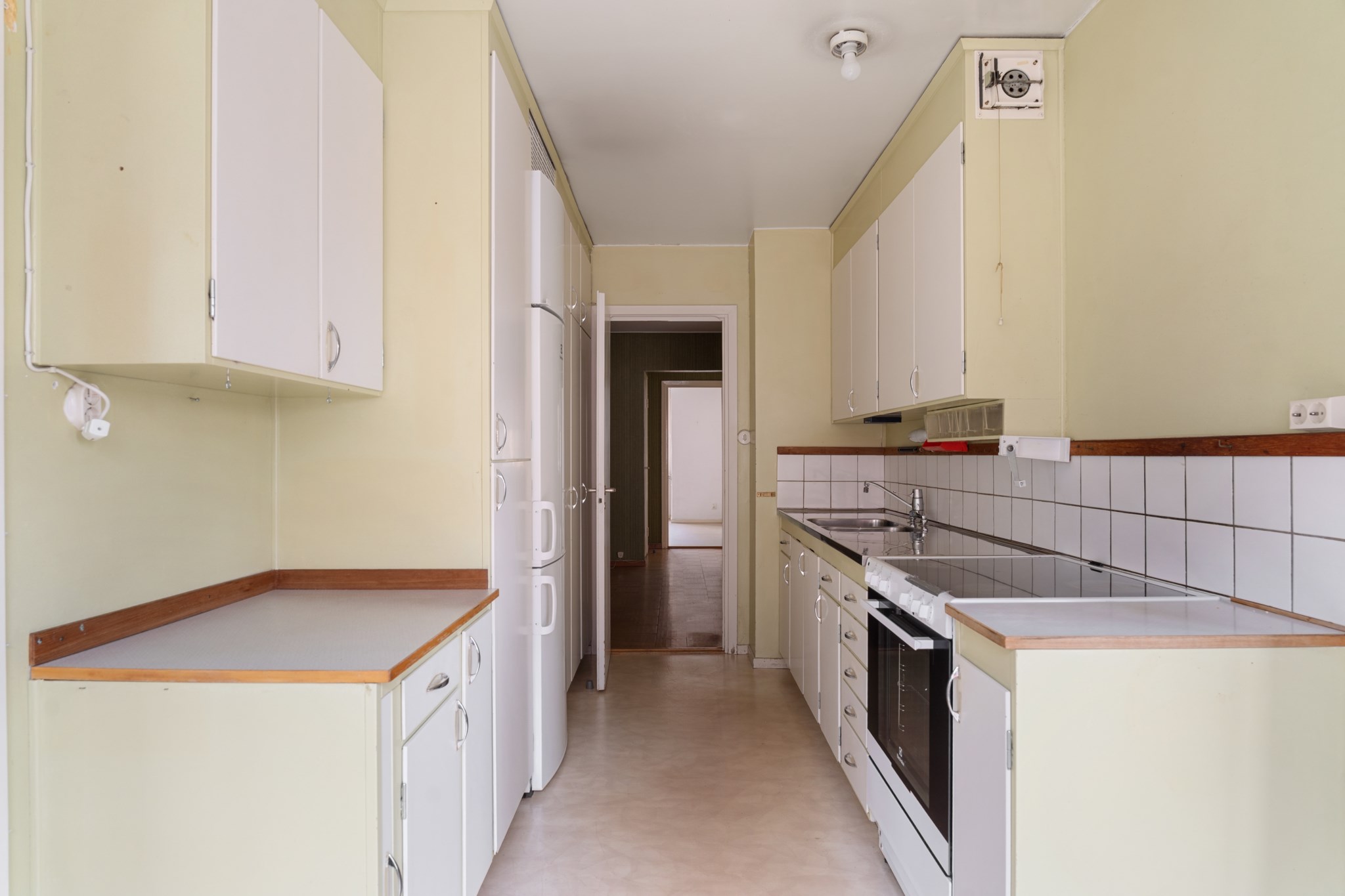 Ljust och trivsamt kök med gott om förvaring i över- och underskåp samt generösa arbetsytor. Köket är utrustat med spishäll, ugn, köksfläkt samt kyl och frys.
