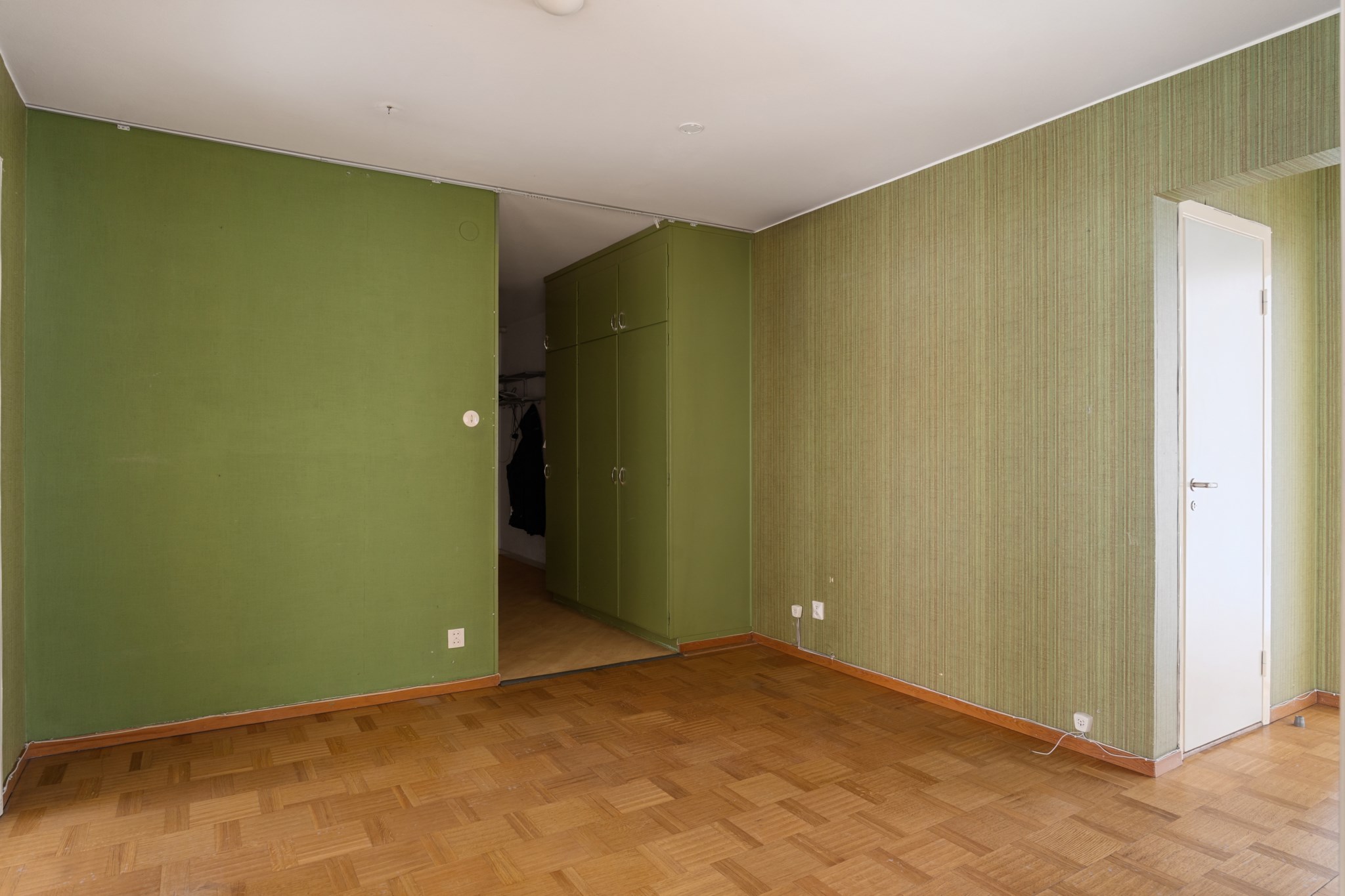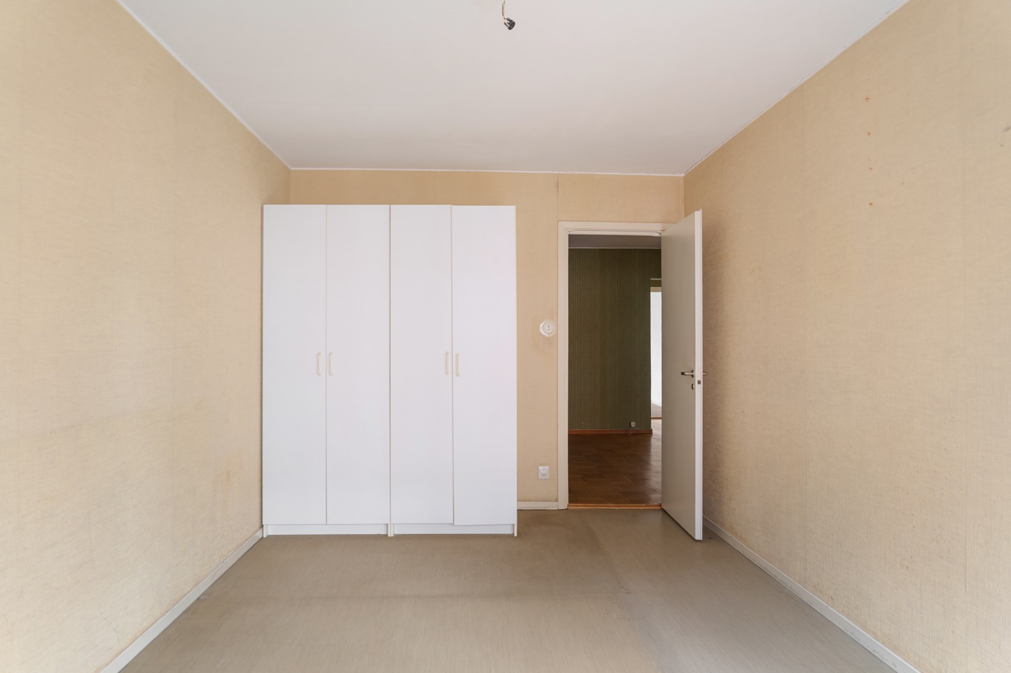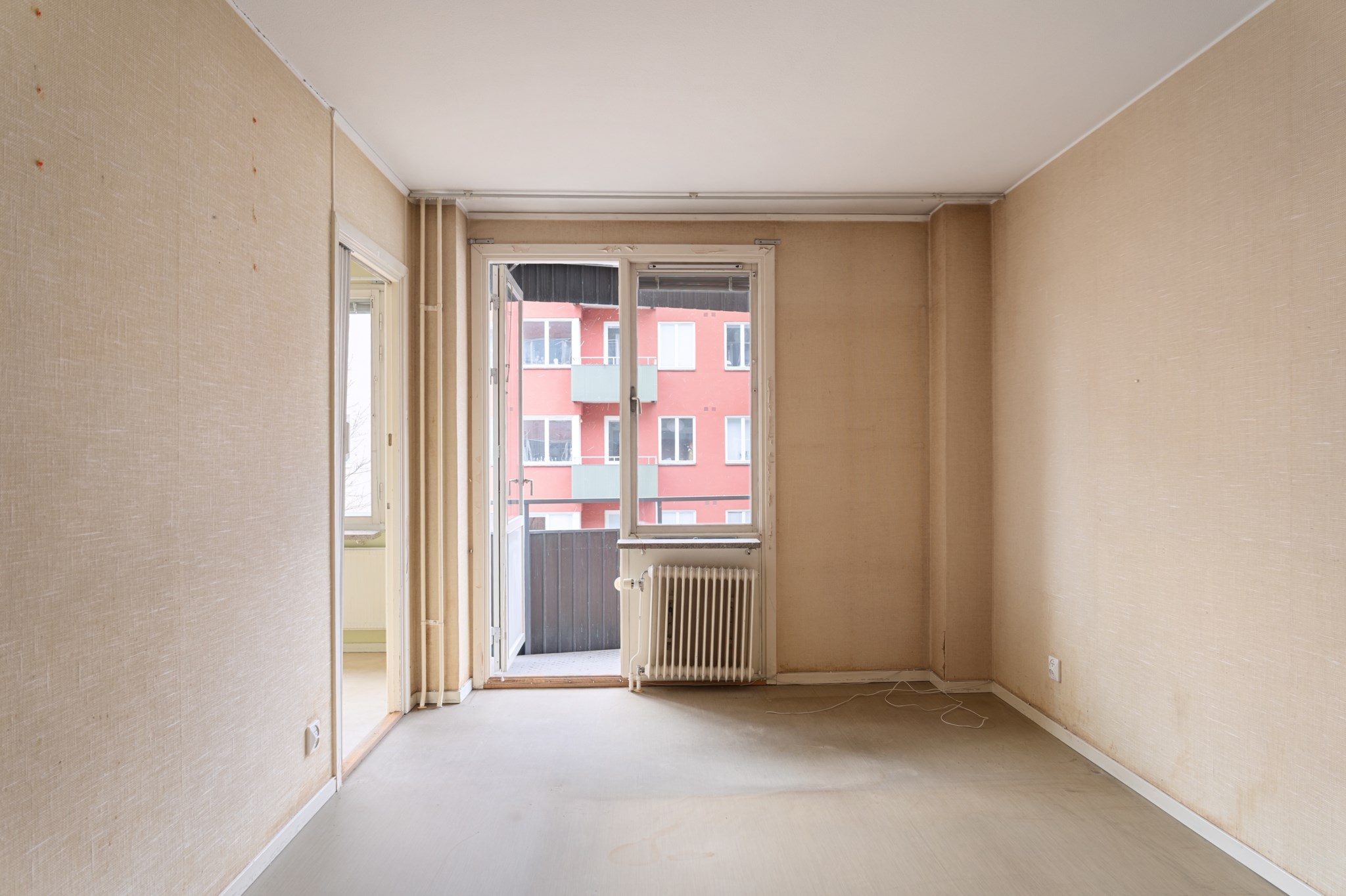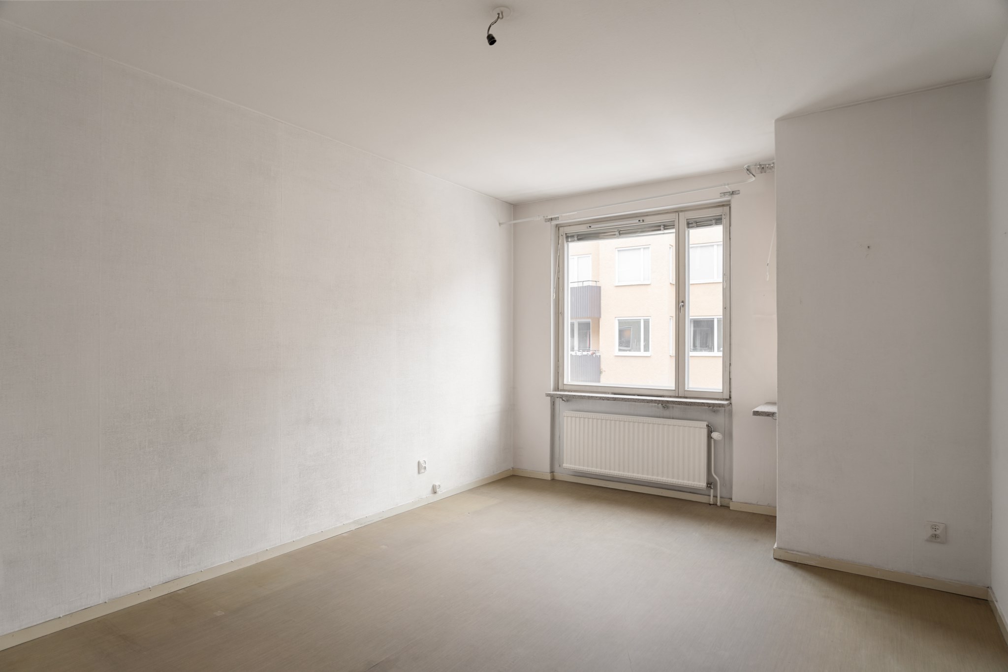 Ljust sovrum med ljusa väggar och golv i neutral ton. Fönster ger fint ljusinsläpp och rummet har plats för säng samt kompletterande möblering såsom garderob eller skrivbord. Ett rofyllt rum med bra planlösning.