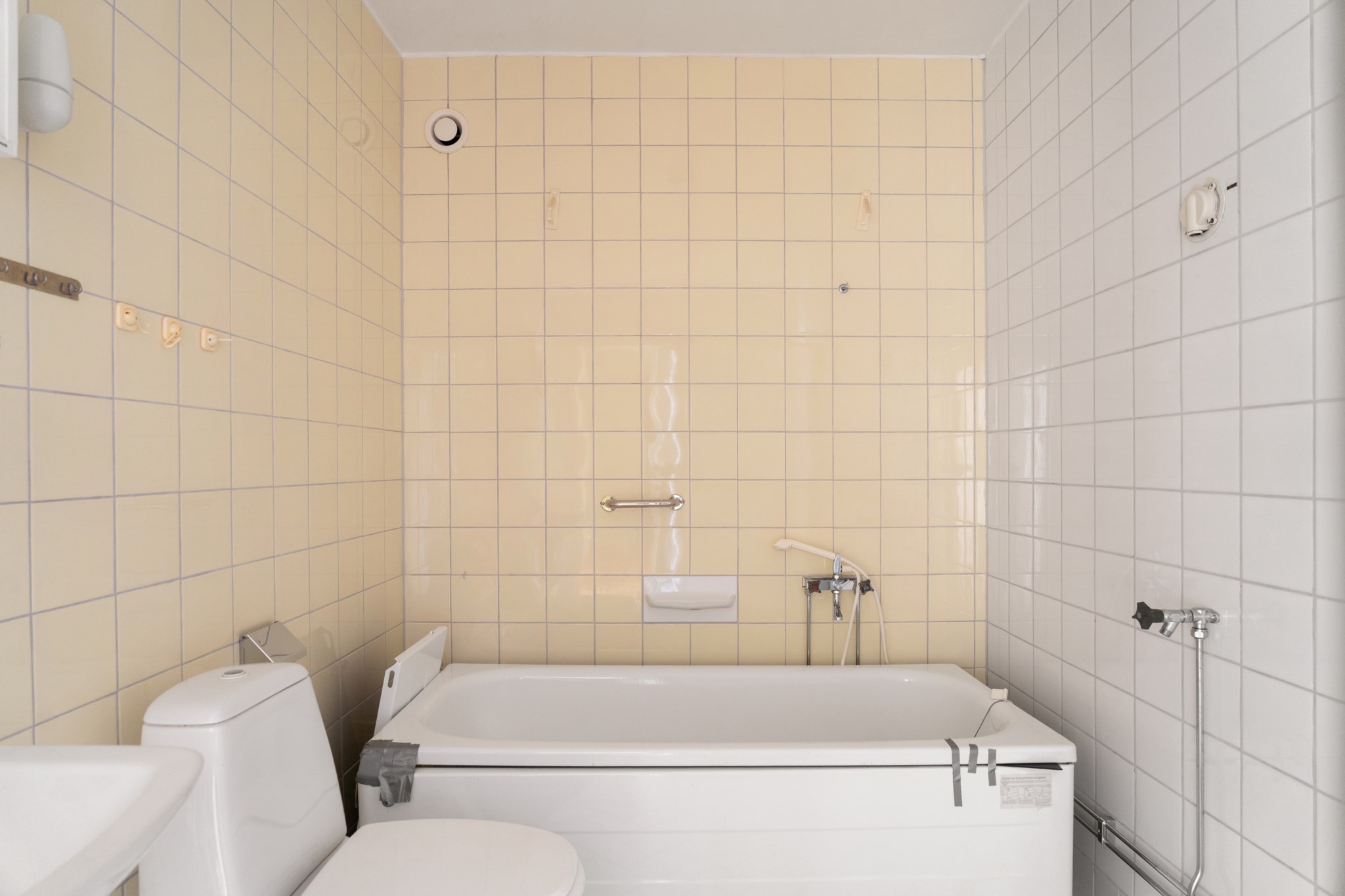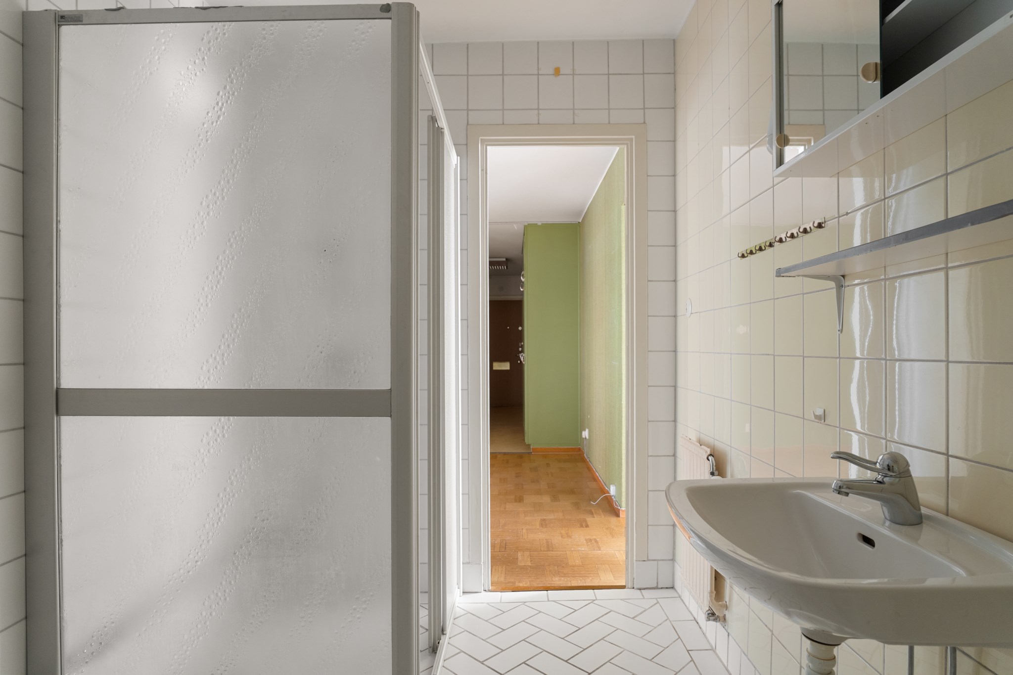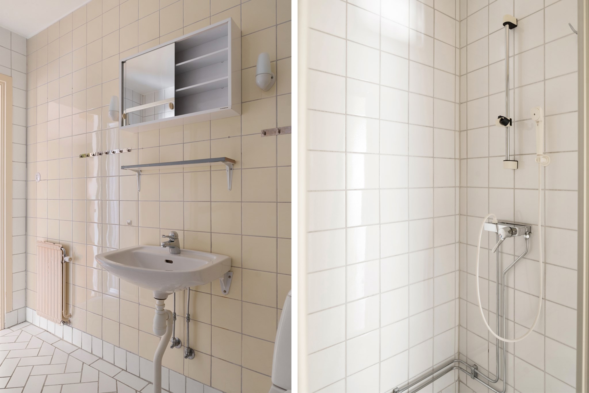 Badrum med kaklade väggar i ljus ton och klinkergolv. Utrustat med badkar, dusch, wc samt handfat med spegelskåp ovan. Här finns även förvaringshyllor och goda möjligheter till kompletterande badrumsmöbel. Ett funktionellt badrum med bra ytor.