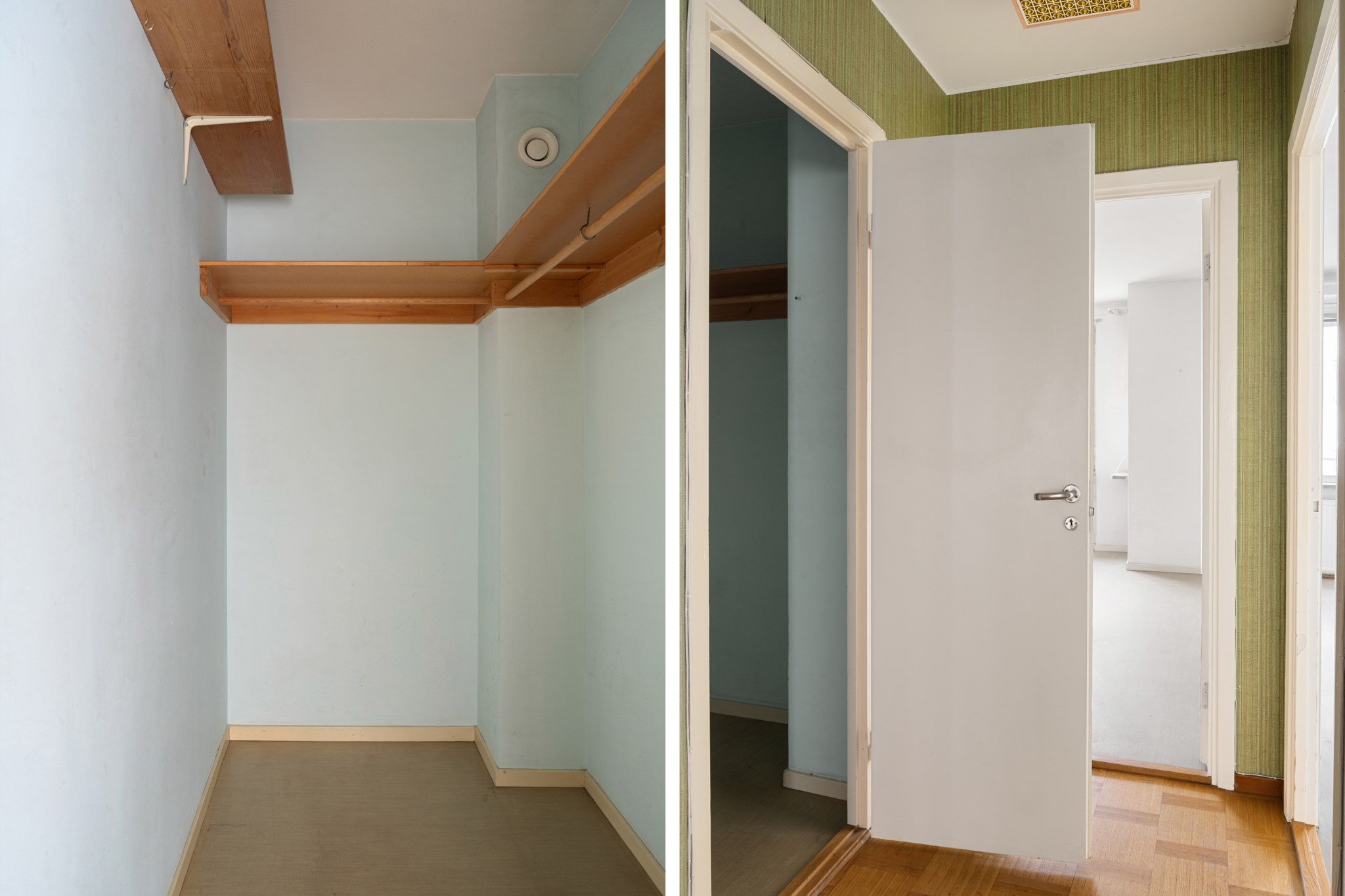 Längs ena sidan finns flera garderober med gott om förvaring bakom släta luckor. Intill finns en separat klädkammare utrustad med hyllplan och klädstänger som ger ytterligare förvaringsutrymme.