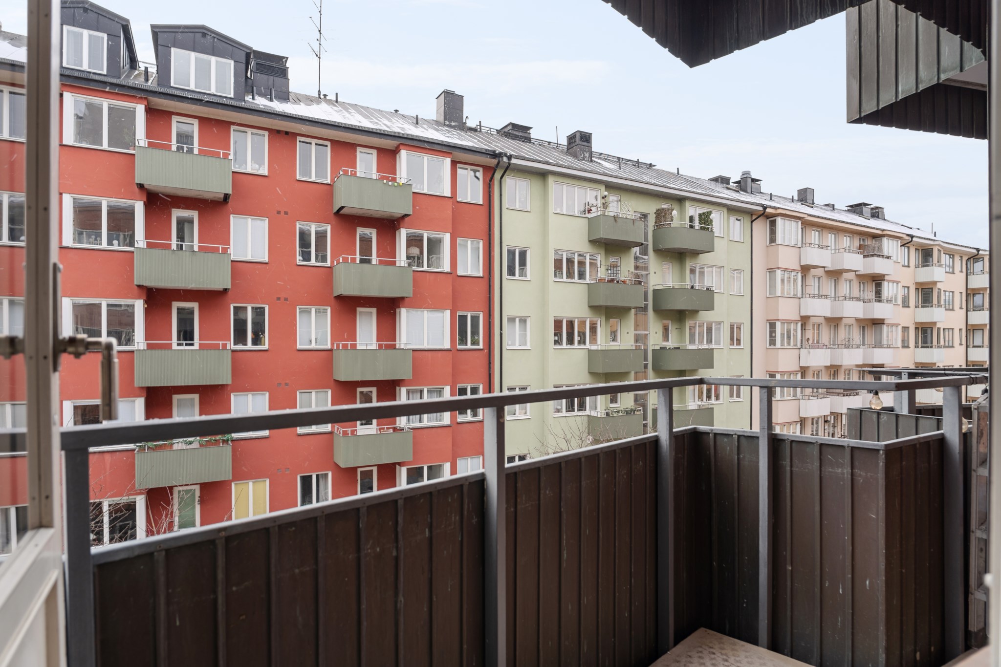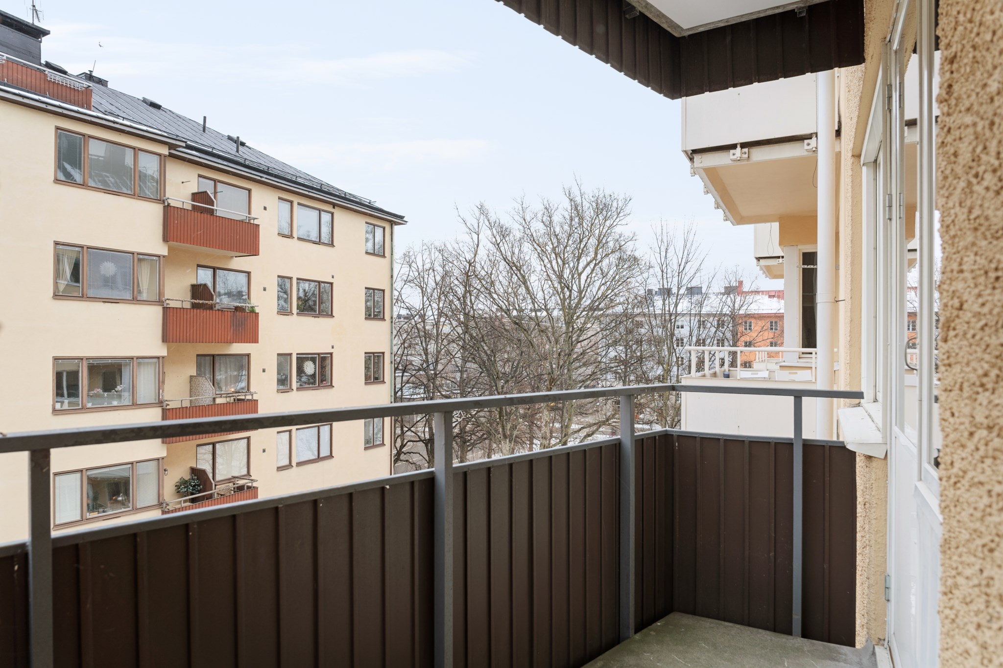 Balkong i anslutning till sovrum 2 med plats för mindre möblering. Här erbjuds utsikt mot omgivande fastigheter och en trevlig möjlighet att skapa en privat uteplats.