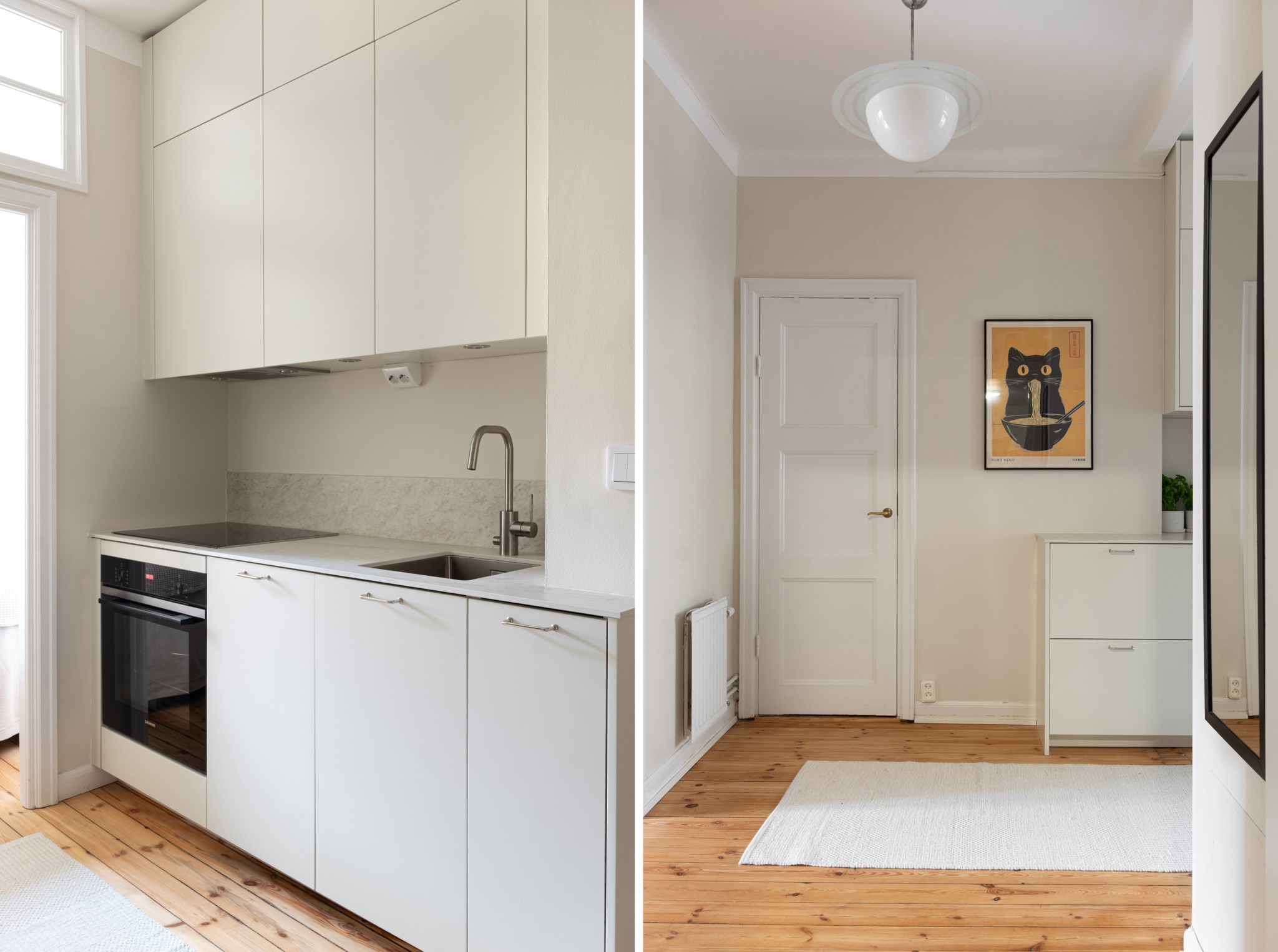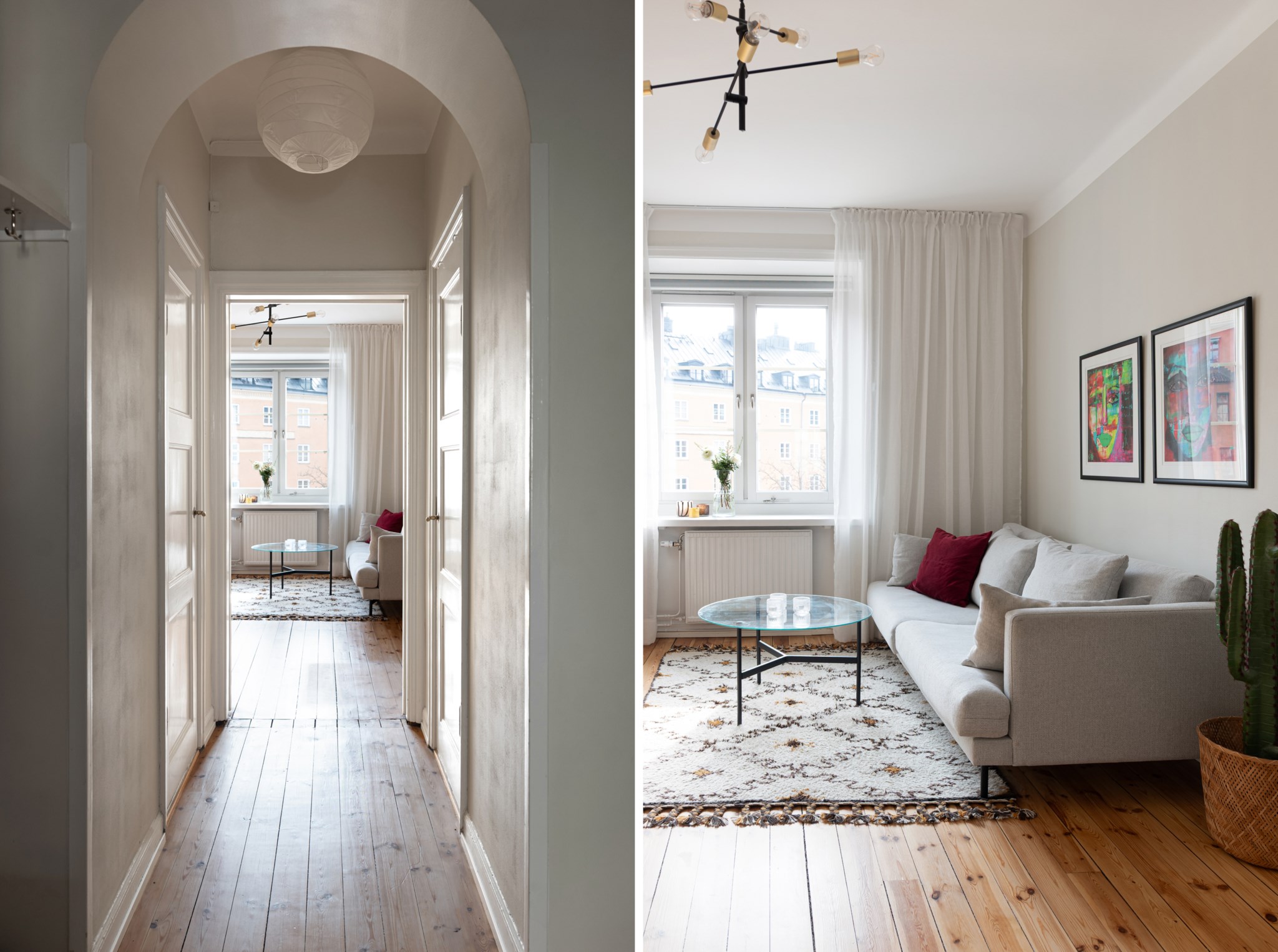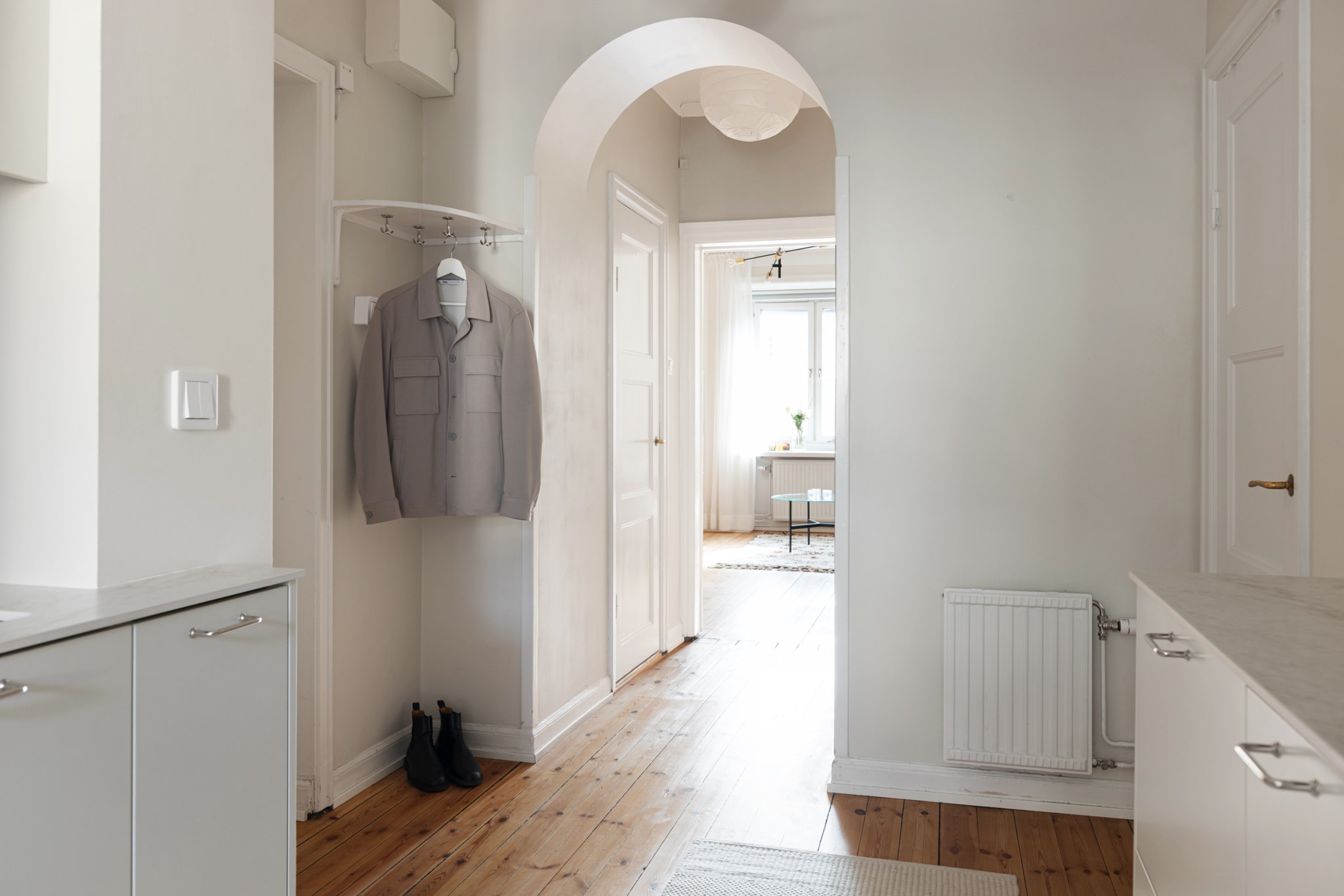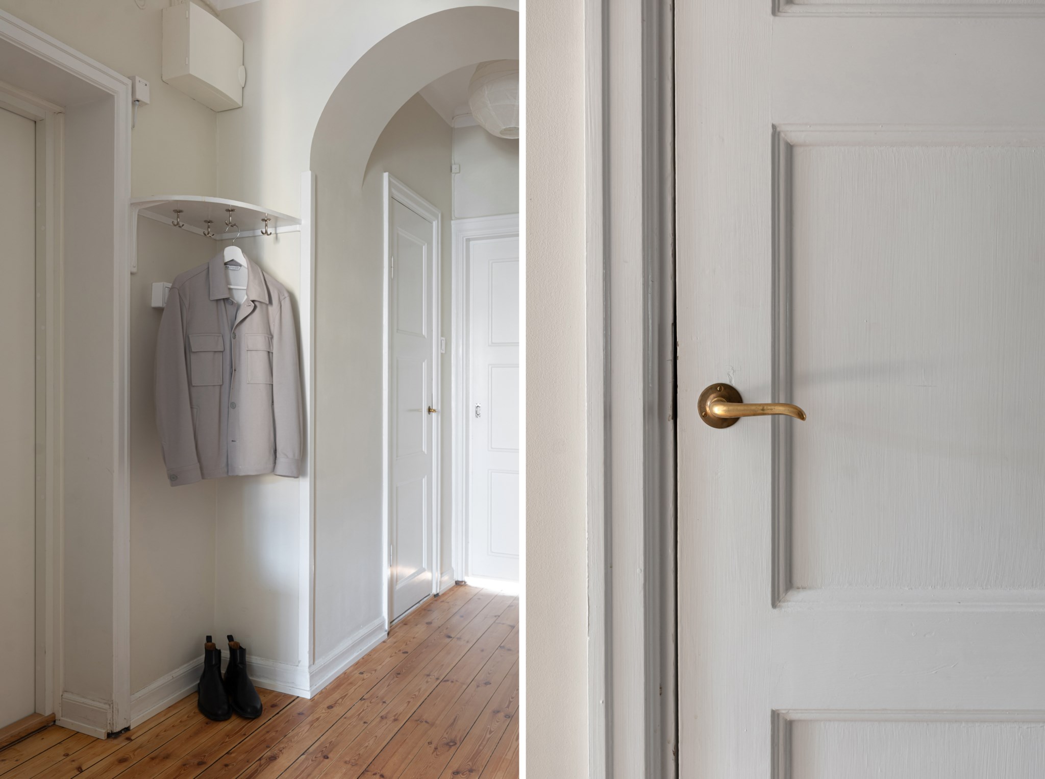 Välkomnande hall med plats för avhängning, skoställ samt mindre avlastningsmöblemang efter smak och behov. Gott om plats för förvaring via intilliggande garderober. Tidlösa ytskikt bestående av ljusa väggar i en beige nyans och ljust trägolv.