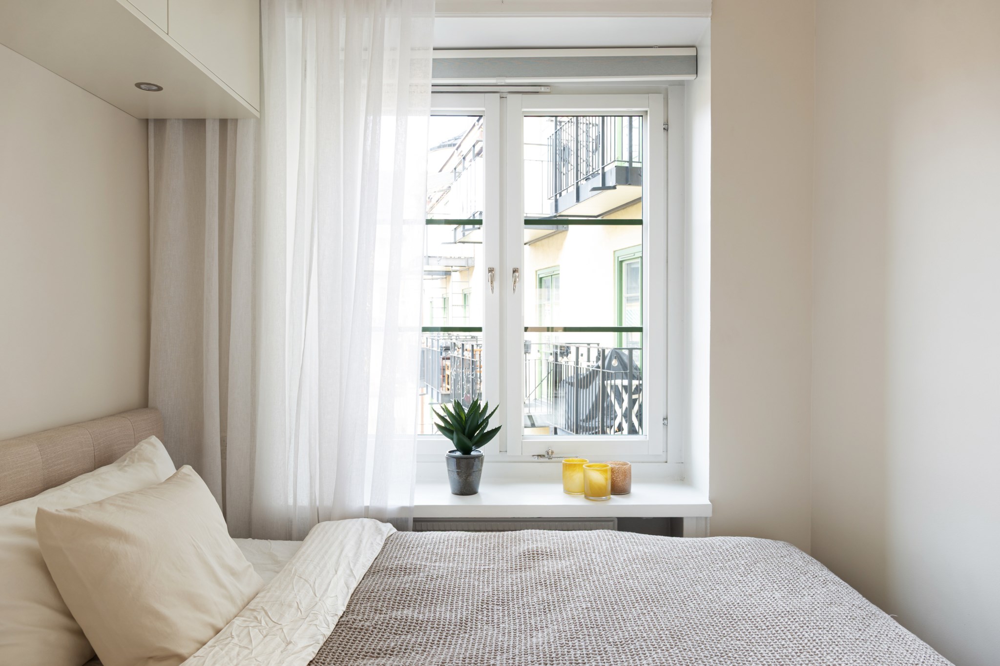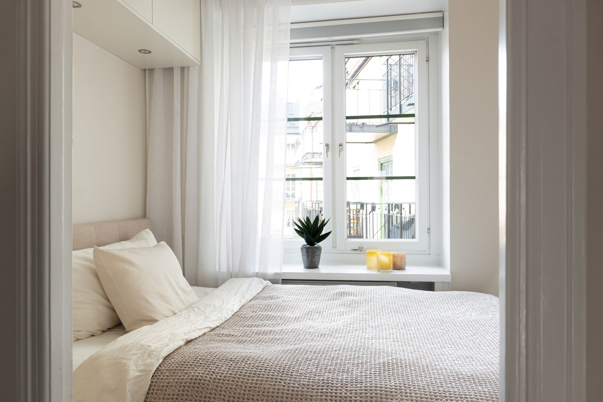 Stort sovrum med plats för dubbelsäng och annat möblemang efter smak och behov. Gott om plats för förvaring via platsbyggda garderober. Ett härligt ljusinsläpp tar sig in via ett stort fönster. Tidlösa ytskikt bestående av ljusa väggar i en beige nyans och ljust trägolv.